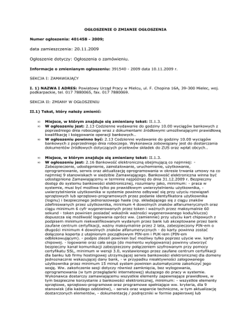 OGŁOSZENIE O ZMIANIE OGŁOSZENIA Numer ogłoszenia: 401458 - 2009; data zamieszczenia: 20.11.2009 Ogłoszenie dotyczy: Ogłoszenia o zamówieniu. Informacje o zmienianym ogłoszeniu: 391540 - 2009 data 10.11.2009 r. SEKCJA I: ZAMAWIAJĄCY I. 1) NAZWA I ADRES: Powiatowy Urząd Pracy w Mielcu, ul. F. Chopina 16A, 39-300 Mielec, woj. podkarpackie, tel. 017 7880065, fax. 017 7880069. SEKCJA II: ZMIANY W OGŁOSZENIU II.1) Tekst, który naleŜy zmienić: • • • • • Miejsce, w którym znajduje się zmieniany tekst: II.1.3. W ogłoszeniu jest: 2.13 Codzienne wydawanie do godziny 10.00 wyciągów bankowych z poprzedniego dnia roboczego wraz z dokumentami źródłowymi umoŜliwiającymi prawidłową kwalifikację i księgowanie operacji bankowych.. W ogłoszeniu powinno być: 2.13 Codzienne wydawanie do godziny 10.00 wyciągów bankowych z poprzedniego dnia roboczego. Wykonawca zobowiązany jest do dostarczania dokumentów źródłowych dotyczących przelewów składek do ZUS oraz wpłat obcych.. Miejsce, w którym znajduje się zmieniany tekst: II.1.3. W ogłoszeniu jest: 2.16 Bankowość elektroniczną obejmującą co najmniej: Zabezpieczenie, udostępnienie, zainstalowanie, uruchomienie, uŜytkowanie, oprogramowanie, serwis oraz aktualizację oprogramowania w okresie trwania umowy na co najmniej 9 stanowiskach w siedzibie Zamawiającego. Bankowość elektroniczna winna być udostępniona Zamawiającemu w terminie najpóźniej do dnia 31.12.2009 r. Bezpieczny dostęp do systemu bankowości elektronicznej, rozumiany jako, minimum: - praca w systemie, musi być moŜliwa tylko po prawidłowym uwierzytelnieniu uŜytkownika, uwierzytelnienie uŜytkownika w systemie powinno odbywać się przy uŜyciu rozwiązań sprzętowych lub sprzętowo-programowych przez podanie identyfikatora uŜytkownika (loginu) i bezpiecznego jednorazowego hasła (np. składającego się z ciągu znaków zdefiniowanych przez uŜytkownika, minimum 4 dowolnych znaków alfanumerycznych oraz ciągu minimum 6 cyfr wygenerowanych przez token i waŜnych przez maksymalnie 60 sekund - token powinien posiadać wskaźnik waŜności wygenerowanego kodu/klucza) dopuszcza się moŜliwość logowania oprócz ww. (zamiennie) przy uŜyciu kart chipowych z podpisem minimum niekwalifikowanym wydanym przez bank lub akceptowane przez bank zaufane centrum certyfikacji, waŜny maksymalnie przez 2 lata, zabezpieczony PIN-em o długości minimum 4 dowolnych znaków alfanumerycznych - do karty powinna zostać dołączona koperta z utajnionym początkowym PIN-em i PUK-iem (PIN-em odblokowującym). - podpis zleceń powinien być moŜliwy tylko poprzez uŜycie ww. karty chipowej. - logowanie oraz cała sesja (do momentu wylogowania) powinny utworzyć bezpieczny kanał komunikacji zabezpieczony połączeniem szyfrowanym przy pomocy certyfikatu SSL, minimum w wersji 3.0, wystawionego przez zaufane centrum certyfikacji dla banku lub firmy hostingowej utrzymującej serwis bankowości elektronicznej dla domeny jednoznacznie wskazującej dany bank, - w przypadku nieaktywności zalogowanego uŜytkownika przez minimum 15 minut system powinien automatycznie zakończyć jego sesję. Ww. zakończenie sesji dotyczy równieŜ zamknięcia, bez wylogowania, oprogramowania (w tym przeglądarki internetowej) słuŜącego do pracy w systemie. Wykonawca dostarczy zamawiającemu wszystkie elementy zapewniające prawidłowe, w tym bezpieczne korzystanie z bankowości elektronicznej, minimum: - wszystkie elementy sprzętowe, sprzętowo-programowe oraz programowe spełniające ww. kryteria, dla 9 stanowisk (dla kaŜdego oddzielne), - serwis oraz wsparcie techniczne, w tym aktualizację dostarczonych elementów, - dokumentację / podręczniki w formie papierowej lub • elektronicznej. Dostęp do systemu bankowości elektronicznej powinien być moŜliwy z komputera o minimalnych, niŜej wymienionych parametrach: - procesor 1,6 GHz - pamięć RAM 128 MB - system operacyjny MS Windows XP Pro PL Oprogramowanie powinno umoŜliwiać, minimum: - załoŜenie kont dla wyznaczonych pracowników z podziałem funkcji / grup, w tym minimum: - grupa administratorów (zarządzanie uŜytkownikami i przypisywanie ich do grup roboczych), - grupa wprowadzających / edytujących dane na rachunkach, - grupa podpisujących, podział logiczny lub organizacyjny: - podpisujący wstępnie - np. Główny Księgowy lub osoba przez niego upowaŜniona, - podpisujący ostatecznie - np. Dyrektor Urzędu lub osoba przez niego upowaŜniona, - podpis (akceptacja) zleceń musi być moŜliwy zgodnie z zasadą dwóch par oczu, tzn. za podpisane uwaŜa się zlecenie podpisane przez uŜytkownika z grupy podpisujących wstępnie i uŜytkownika z grupy podpisujących ostatecznie, - elektroniczny monitoring stanu rachunków bankowych Zamawiającego - uzyskiwanie w czasie rzeczywistym informacji o wszystkich operacjach i saldach na rachunkach podstawowych i rachunkach pomocniczych uzyskiwanie informacji z archiwum bankowego - tworzenie zbiorów danych kontrahentów, numerów rachunków i innych danych ewidencyjnych - przeszukiwanie zbiorów wszystkich operacji wg rodzaju operacji, nazwy kontrahenta, daty, kwoty, i innych moŜliwych do wyodrębnienia kryteriów, - składanie poleceń przelewu w ramach dostępnych środków i/lub dostępnego salda debetowego - realizacja zleceń płatniczych w złotych.. W ogłoszeniu powinno być: 2.16 Bankowość elektroniczną obejmującą co najmniej: Zabezpieczenie, udostępnienie, zainstalowanie, uruchomienie, uŜytkowanie, oprogramowanie, serwis oraz aktualizację oprogramowania w okresie trwania umowy na co najmniej 9 stanowiskach w siedzibie Zamawiającego. Bankowość elektroniczna winna być udostępniona Zamawiającemu w terminie najpóźniej do dnia 31.12.2009 r. Bezpieczny dostęp do systemu bankowości elektronicznej, rozumiany jako, minimum: - praca w systemie, musi być moŜliwa tylko po prawidłowym uwierzytelnieniu uŜytkownika, uwierzytelnienie uŜytkownika w 
