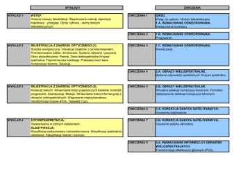 WYKŁADY WYKŁAD 1 WYKŁAD 2 WYKŁAD 3 WYKŁAD 4 WSTĘP. Historia rozwoju teledetekcji. Współczesne metody rejestracji krajobrazu - przegląd. Obraz cyfrowy - cechy danych teledetekcyjnych. REJESTRACJA Z ZAKRESU OPTYCZNEGO (1). Ścieżka energetyczna. Interakcje obiektów z promieniowaniem. Promieniowanie odbite i emitowane. Systemy aktywne i pasywne. Okna atmosferyczne. Pasma. Dane wielospektralne.Krzywa spektralna. Fizjonomia oka ludzkiego. Podstawy teorii barw. Kompozycje barwne. Selekcja. REJESTRACJA Z ZAKRESU OPTYCZNEGO (2). Korekcja danych. Wmacnianie treści pojedynczych kanałów: kontrast, progowanie, kwantyzacja, filtracje. Wmacnianie treści informacyjnej z obrazów wielospektralnych. Wagowanie międzykanałowe, transformacje liniowe (PCA, Tasseled Cup). FOTOINTERPRETACJA. Zastosowania w różnych dziedzinach. KLASYFIKACJA. Klasyfikacja nadzorowana i nienadzorowana. Klasyfikacja spektralna i obiektowa. Klasyfikacja twarda i rozmyta. ĆWICZENIA ĆWICZENIA 1 IDRISI. Wstęp do pakietu. Moduły teledetekcyjne. 1.A. WZMACNIANIE ODWZOROWANIA. Wzmacnianie kontrastu. ĆWICZENIA 2 1.B. WZMACNIANIE ODWZOROWANIA. Progowanie. ĆWICZENIA 3 1.C. WZMACNIANIE ODWZOROWANIA. Kwantyzacja. ĆWICZENIA 4 2.A. OBRAZY WIELOSPEKTRALNE. Badanie odpowiedzi spektralnych. Krzywe spektralne. ĆWICZENIA 5 2.B. OBRAZY WIELOSPEKTRALNE. Wizualna selekcja kompozycji barwnych. Formalna (statystyczna) selekcja kompozycji barwnych. ĆWICZENIA 6 3.A. KOREKCJA DANYCH SATELITARNYCH. Usuwanie prążkowania. ĆWICZENIA 7 3.B. KOREKCJA DANYCH SATELITARNYCH. Usuwanie wpływu atmosfery. ĆWICZENIA 8 4.A. WZMACNIANIE INFORMACJI Z OBRAZÓW WIELOSPEKTRALNYCH. Transformacja składowych głównych (PCA). WYKŁAD 5 WYKŁAD 6 WYKŁAD 7 WYKŁAD 8 WYKRYWANIE ZMIAN. Dane wieloczasowe. Metody korekcji względnej. Sposoby analizy zmian. DANE SATELITARNE. Dostępne dane satelitarne. Misje archiwalne i planowane. Wyszukiwarki www scen satelitarnych. INTEGRACJA DANYCH O RÓŻNEJ ROZDZIELCZOŚCI. Etapy integracji. Integracja różnymi formułami. Metody oceny wizualnej i formalnej. TERMOGRAFIA. Wykład goscinny. Dr inż. Alina Wróbel PODSUMOWANIE. Wybrane zagadnienia z cyklu wykładów. Zakres egzaminu. ĆWICZENIA 9 4.B. WZMACNIANIE INFORMACJI Z OBRAZÓW WIELOSPEKTRALNYCH. Usuwanie prążkowania - zastosowanie PCA. ĆWICZENIA 10 4.C. WZMACNIANIE INFORMACJI Z OBRAZÓW WIELOSPEKTRALNYCH. Dekorelacyjne wzmocnienie kontrastu - zastosowanie PCA. ĆWICZENIA 11 4.D. WZMACNIANIE INFORMACJI Z OBRAZÓW WIELOSPEKTRALNYCH. Wagowanie międzykanałowe. Indeksy wegetacji. ĆWICZENIA 12 5. KLASYFIKACJA NIENADZOROWANA. Opracowanie mapy pokrycia/użytkowania terenu. ĆWICZENIA 13 6. INTEGRACJA DANYCH O RÓŻNEJ ROZDZIELCZOŚCI. Metody IHS i PCA. ĆWICZENIA 14 7. WYKRYWANIE ZMIAN. Korekcja względna danych. Różnicowe i ilorazowe metody analizy zmian. ĆWICZENIA 15 KOLOKWIUM.