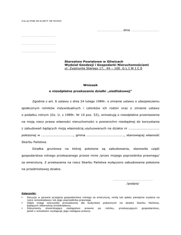 ZAŁĄCZNIK DO KARTY NR WGN04 ............................................., dnia ................................................... ........................................................... ........................................................... ........................................................... Starostwo Powiatowe w Gliwicach Wydział Geodezji i Gospodarki Nieruchomościami ul. Zygmunta Starego 17, 44 – 100 G L I W I C E Wniosek o nieodpłatne przekazanie działki „siedliskowej” Zgodnie z art. 6 ustawy z dnia 24 lutego 1989r. o zmianie ustawy o ubezpieczeniu społecznym rolników indywidualnych i członków ich rodzin oraz o zmianie ustawy o podatku rolnym (Dz. U. z 1989r. Nr 10 poz. 53), wnioskuję o nieodpłatne przeniesienie na moją rzecz prawa własności nieruchomości o powierzchni niezbędnej do korzystania z zabudowań będących moją własnością usytuowanych na działce nr ............................ połoŜonej w ............................., gmina .................................., stanowiącej własność Skarbu Państwa. Działka gruntowa na której połoŜone są zabudowania, stanowiła część gospodarstwa rolnego przekazanego przeze mnie /przez mojego poprzednika prawnego/ za emeryturę. Z przekazania na rzecz Skarbu Państwa wyłączono zabudowania połoŜone na przedmiotowej działce. ......................................................................... /podpis/ Załączniki: Decyzja w sprawie przejęcia gospodarstwa rolnego za emeryturę, rentę lub spłaty pienięŜne wydana na rzecz wnioskodawcy lub jego poprzednika prawnego Odpis księgi wieczystej prowadzonej dla budynków połoŜonych na działce Skarbu Państwa, będących własnością wnioskodawcy Dokumenty stwierdzające następstwo prawne po rolniku, przekazującym gospodarstwo, jeŜeli z wnioskiem występuje jego następca prawny.