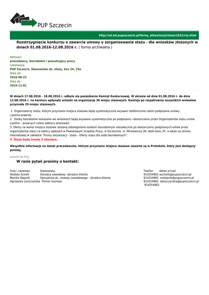 PUP Szczecin http://nd.nd.pupszczecin.pl/formy_aktywizacji/staze/1631/rss.html Rozstrzygnięcie konkursu o zawarcie umowy o zorganizowanie stażu - dla wniosków złożonych w dniach 01.08.2016-12.08.2016 r. ( forma archiwalna ) Adresaci: pracodawcy, bezrobotni i poszukujący pracy Lokalizacja: PUP Szczecin, Stanowisko ds. staży, box 24, 25a Data od: 2016-08-23 Data do: 2016-11-01 W dniach 17.08.2016 - 18.08.2016 r. odbyło się posiedzenie Komisji Konkursowej. W okresie od dnia 01.08.2016 r. do dnia 12.08.2016 r. na konkurs wpłynęły wnioski na organizację 36 miejsc stażowych. Komisja po rozpatrzeniu wszystkich wniosków przyznała 29 miejsc stażowych. 1. Organizatorzy stażu, którym przyznano miejsca stażowe będą systematycznie wzywani telefonicznie celem podpisania umowy cywilno-prawnej. 2. Osoby bezrobotne wskazane we wnioskach będą wzywane systematycznie po podpisaniu i dostarczeniu przez Organizatorów stażu umów cywilno – prawnych celem odbioru skierowań. 3. Oferty na wolne miejsca stażowe zostaną udostępnione osobom bezrobotnym niezwłocznie po dostarczeniu podpisanych umów przez organizatorów stażu na tablicy ogłoszeń w Powiatowym Urzędzie Pracy, w Szczecinie, ul. Mickiewicza 39, obok boxu 25 a także na stronie internetowej w zakładce "Formy aktywizacji - staże - Oferty stażu dla osób bezrobotnych". 4. Staże będą trwały 3 miesiące. Wszystkie informacje na temat pracodawców, którym przyznano miejsca stażowe zawarte są w Protokole, który jest dostępny poniżej. powrót do listy W razie pytań prosimy o kontakt: Imię i nazwisko Stanowisko Wioleta Schefs Doradca zawodowy -doradca klienta Monika Stępnik Specjalista ds. rozwoju zawodowego - doradca klienta Agnieszka Leszczyńska Pomoc biurowa Telefon Adres e-mail 914254962 [email protected] 914254962 [email protected] 914254962 [email protected] 914254962