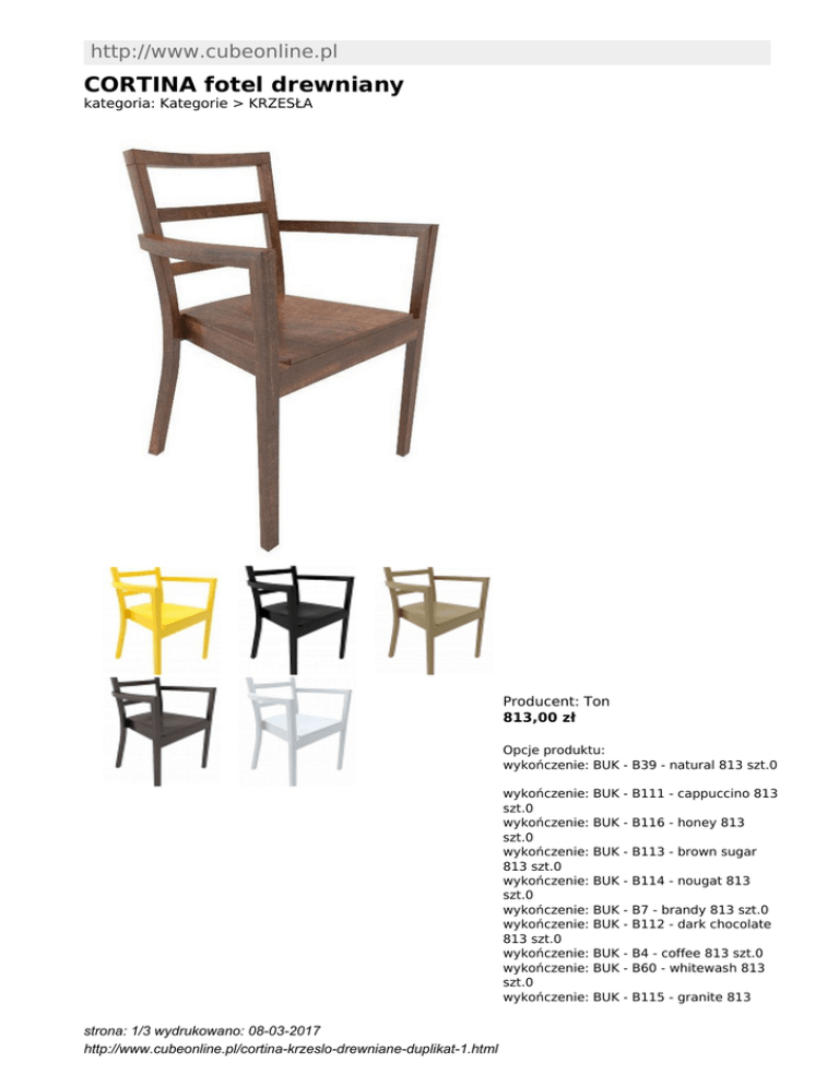 http://www.cubeonline.pl CORTINA fotel drewniany kategoria: Kategorie > KRZESŁA Producent: Ton 813,00 zł Opcje produktu: wykończenie: BUK - B39 - natural 813 szt.0 strona: 1/3 wydrukowano: 08-03-2017 http://www.cubeonline.pl/cortina-krzeslo-drewniane-duplikat-1.html wykończenie: szt.0 wykończenie: szt.0 wykończenie: 813 szt.0 wykończenie: szt.0 wykończenie: wykończenie: 813 szt.0 wykończenie: wykończenie: szt.0 wykończenie: BUK - B111 - cappuccino 813 BUK - B116 - honey 813 BUK - B113 - brown sugar BUK - B114 - nougat 813 BUK - B7 - brandy 813 szt.0 BUK - B112 - dark chocolate BUK - B4 - coffee 813 szt.0 BUK - B60 - whitewash 813 BUK - B115 - granite 813 szt.0 wykończenie: BUK 813 szt.0 wykończenie: BUK szt.0 wykończenie: BUK wykończenie: BUK wykończenie: BUK classic 915 szt.0 wykończenie: BUK bianco 915 szt.0 wykończenie: BUK 979 szt.0 wykończenie: BUK 979 szt.0 wykończenie: BUK 979 szt.0 wykończenie: BUK 534C 979 szt.0 wykończenie: BUK 3125C 979 szt.0 wykończenie: BUK 227C 979 szt.0 wykończenie: BUK 979 szt.0 wykończenie: BUK szt.0 Kod QR: WYMIARY (cm): wysokość siedziska- 46 wysokość całkowita- 83,7 szerokość- 48 głębokość- 44 wysokość do podłokietników- 67,7 WAGA (kg): 10,29 MATERIAŁ: drewno - buk strona: 2/3 wydrukowano: 08-03-2017 http://www.cubeonline.pl/cortina-krzeslo-drewniane-duplikat-1.html - B105 - dark wenge - B123 - black grain 813 - B20 - white 945 szt.0 - B21 - black 979 szt.0 - B130/A - antique - B4/W - antiquue - red pantone 1797C - cool grey pantone 5C - yellow pantone 116C - dark blue pantone - turquise pantone - magenta pantone - green pantone 390C - gold ral 1036 979 Inne produkty tej firmy: http://cubeonline.pl/manufacturer/ton strona: 3/3 wydrukowano: 08-03-2017 http://www.cubeonline.pl/cortina-krzeslo-drewniane-duplikat-1.html