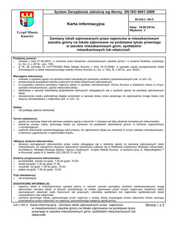 System Zarządzania Jakością wg Normy EN ISO 9001:2008 KI-UA.I.- 04-3 Karta informacyjna Urząd Miasta Knurów Data: 18.09.2014r. Wydanie: 3 Zamiany lokali zajmowanych przez najemców w mieszkaniowym zasobie gminy na lokale zajmowane na podstawie tytułu prawnego w zasobie mieszkaniowym gmin, spółdzielni mieszkaniowych lub właścicieli Podstawy prawne: • Ustawa z dnia 21.06.2001r. o ochronie praw lokatorów, mieszkaniowym zasobie gminy i o zmianie Kodeksu cywilnego (t.j. Dz. U. z 2014r., poz. 150), • § 19, 28 Uchwały Nr LVI/718/2006 Rady Miasta Knurów z dnia 19.10.2006r. w sprawie zasad wynajmowania lokali wchodzących w skład mieszkaniowego zasobu Gminy Knurów (t.j. Dz. U. Woj. Śl. z 2013r., poz. 6532). Wymagane dokumenty: • wniosek o wydanie zgody na zamianę lokali mieszkalnych pomiędzy osobami zainteresowanymi (zał. nr UA.I.-6), • potwierdzenie posiadania tytułów prawnych do lokali dotychczas zajmowanych, • w przypadku zamiany pomiędzy najemcą lokalu w zasobie mieszkaniowym Gminy Knurów a lokatorem lokalu w innym zasobie mieszkaniowym, zgoda właściciela lokalu, • deklaracje o sytuacji materialnej gospodarstw domowych ubiegających się o wydanie zgody na zamianę zajmowanych lokali, • oświadczenie osoby pełnoletniej objętej wnioskiem w sprawie braku tytułu prawnego do zajmowania innego lokalu (nie dotyczy wnioskodawcy i małżonka) (zał. nr UA-I. 5). Opłaty: • nie podlega opłacie skarbowej Termin załatwienia: • zgoda na zamianę lokali lub odmowa wydania zgody w terminie 1 miesiąca od daty złożenia kompletnych dokumentów, • zawarcie umowy najmu gminnego lokalu po zamianie na podstawie skierowania gminy, w terminie uzgodnionym z wynajmującym, • wydanie dokumentu potwierdzającego tytuł prawny, do zajmowania lokalu po zamianie w innym zasobie mieszkaniowym, w terminie uzgodnionym z właścicielem lokalu. 1Miejsce złożenia dokumentów: • złożenie wymaganych dokumentów przez osoby ubiegające się o wydanie zgody na zamianę zajmowanych lokali mieszkalnych, po uprzednim okazaniu dokumentu tożsamości odbywa się w Referacie Lokalowym Wydziału Urbanistyki, Architektury, Strategii Rozwoju Miasta i Spraw Lokalowych Urzędu Miasta Knurów w budynku przy ul. Niepodległości 7 w Knurowie, pokój nr 9, telefon (32) 339 22 31 do 32. Godziny przyjmowania dokumentów: • poniedziałek, wtorek od godz. 7.30 do godz. 15.30, • środa od godz. 7.30 do godz.17.30, • czwartek od godz. 7.30 do godz. 15.30, • piątek od godz. 7.30 do godz. 13.30. Tryb odwoławczy: • nie przysługuje DODATKOWE INFORMACJE: • najemcy lokali w mieszkaniowym zasobie gminy w ramach zamian pomiędzy osobami zainteresowanymi mogą dokonywać zamiany lokali, w których zamieszkują na lokale zajmowane przez innych najemców, lokatorów lokali stanowiących własność osób fizycznych lub prawnych, członków spółdzielni lub najemców spółdzielczych lokali mieszkalnych oraz właścicieli, • zamiana gminnego lokalu zajmowanego przez najemcę z osobą, której przysługuje prawo własności lokalu wymaga przeniesienia prawa własności na najemcę, poprzedzonego wstępną zgodą gminy, UA.I.-04-3. Karta informacyjna - Zamiany lokali zajmowanych przez najemców w mieszkaniowym zasobie gminy na lokale zajmowane na podstawie tytułu prawnego w zasobie mieszkaniowym gmin, spółdzielni mieszkaniowych lub właścicieli Strona 1 z 2 • • • • zamiana pomiędzy najemcą mieszkania gminnego a lokatorem innego lokalu wymaga zgody właściciela lokalu, wydanie zgody na zamianę lokalu w w/w trybie nie dotyczy lokali wynajętych na czas oznaczony, zawarcie umowy najmu lokalu w zasobie mieszkaniowym Gminy Knurów w w/w trybie nie wymaga opinii Komisji Mieszkaniowej i umieszczenia w wykazie osób zakwalifikowanych do wynajmu gminnych lokali mieszkalnych, na podstawie art. 24 Ustawy z dnia 29 sierpnia 1997r. o ochronie danych osobowych (t.j. Dz.U. z 2014r., poz. 1182), informujemy że: 1) Administratorem Danych Osobowych przetwarzanych w Urzędzie Miasta Knurów jest Prezydent Miasta Knurów, ul. dr. Floriana Ogana 5, 44-190 Knurów, 2) obowiązek podania danych wynika z przepisów prawa, 3) celem przetwarzania danych osobowych jest realizacja obowiązków wynikających z przepisów prawa, mających zastosowanie w załatwianej sprawie, 4) dane mogą być udostępnione organom upoważnionym na podstawie przepisów prawa, 5) każdy ma prawo dostępu do swoich danych osobowych (zgodnie z art. 32-35 ustawy o ochronie danych osobowych). Załączniki: 1. Wniosek o wydanie zgody na zamianę lokali mieszkalnych pomiędzy osobami zainteresowanymi (zał. nr UA.I.-6). 2. Oświadczenie osoby pełnoletniej objętej wnioskiem w sprawie braku tytułu prawnego do zajmowania innego lokalu (nie dotyczy wnioskodawcy i małżonka) (zał. nr UA.I. - 5). UA.I.-04-3. Karta informacyjna - Zamiany lokali zajmowanych przez najemców w mieszkaniowym zasobie gminy na lokale zajmowane na podstawie tytułu prawnego w zasobie mieszkaniowym gmin, spółdzielni mieszkaniowych lub właścicieli Strona 2 z 1