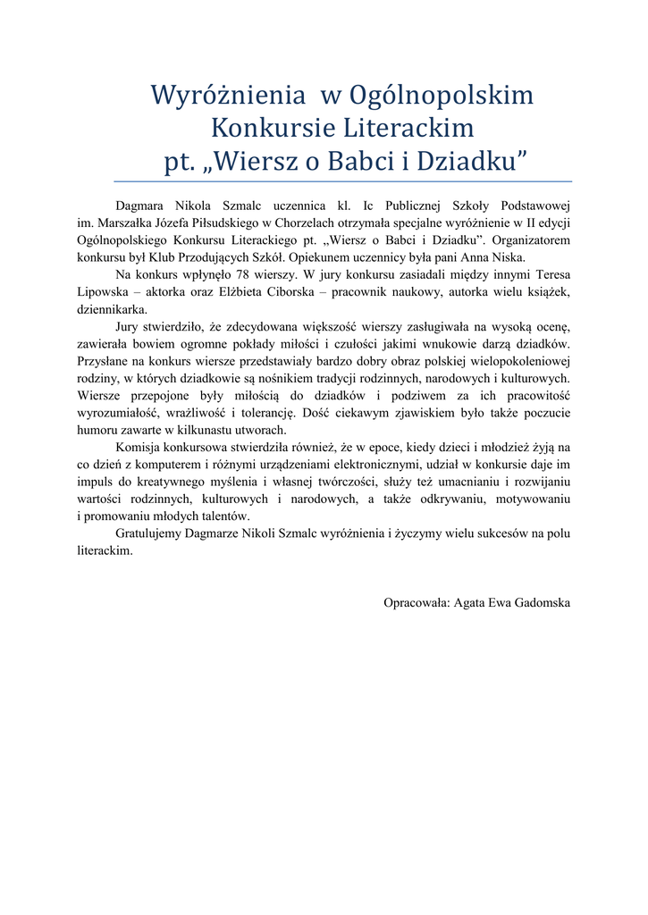 Wyróżnienia w Ogólnopolskim Konkursie Literackim pt. „Wiersz o Babci i Dziadku” Dagmara Nikola Szmalc uczennica kl. Ic Publicznej Szkoły Podstawowej im. Marszałka Józefa Piłsudskiego w Chorzelach otrzymała specjalne wyróżnienie w II edycji Ogólnopolskiego Konkursu Literackiego pt. „Wiersz o Babci i Dziadku”. Organizatorem konkursu był Klub Przodujących Szkół. Opiekunem uczennicy była pani Anna Niska. Na konkurs wpłynęło 78 wierszy. W jury konkursu zasiadali między innymi Teresa Lipowska – aktorka oraz Elżbieta Ciborska – pracownik naukowy, autorka wielu książek, dziennikarka. Jury stwierdziło, że zdecydowana większość wierszy zasługiwała na wysoką ocenę, zawierała bowiem ogromne pokłady miłości i czułości jakimi wnukowie darzą dziadków. Przysłane na konkurs wiersze przedstawiały bardzo dobry obraz polskiej wielopokoleniowej rodziny, w których dziadkowie są nośnikiem tradycji rodzinnych, narodowych i kulturowych. Wiersze przepojone były miłością do dziadków i podziwem za ich pracowitość wyrozumiałość, wrażliwość i tolerancję. Dość ciekawym zjawiskiem było także poczucie humoru zawarte w kilkunastu utworach. Komisja konkursowa stwierdziła również, że w epoce, kiedy dzieci i młodzież żyją na co dzień z komputerem i różnymi urządzeniami elektronicznymi, udział w konkursie daje im impuls do kreatywnego myślenia i własnej twórczości, służy też umacnianiu i rozwijaniu wartości rodzinnych, kulturowych i narodowych, a także odkrywaniu, motywowaniu i promowaniu młodych talentów. Gratulujemy Dagmarze Nikoli Szmalc wyróżnienia i życzymy wielu sukcesów na polu literackim. Opracowała: Agata Ewa Gadomska