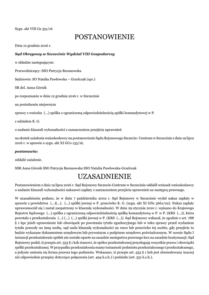 Sygn. akt VIII Gz 351/16 POSTANOWIENIE Dnia 12 grudnia 2016 r. Sąd Okręgowy w Szczecinie Wydział VIII Gospodarczy w składzie następującym: Przewodniczący: SSO Patrycja Baranowska Sędziowie: SO Natalia Pawłowska – Grzelczak (spr.) SR del. Anna Górnik po rozpoznaniu w dniu 12 grudnia 2016 r. w Szczecinie na posiedzeniu niejawnym sprawy z wniosku (...) spółka z ograniczoną odpowiedzialnością spółki komandytowej w P. z udziałem K. G. o nadanie klauzuli wykonalności z zaznaczeniem przejścia uprawnień na skutek zażalenia wnioskodawcy na postanowienie Sądu Rejonowego Szczecin- Centrum w Szczecinie z dnia 19 lipca 2016 r. w sprawie o sygn. akt XI GCo 135/16, postanawia: oddalić zażalenie. SSR Anna Górnik SSO Patrycja Baranowska SSO Natalia Pawłowska-Grzelczak UZASADNIENIE Postanowieniem z dnia 19 lipca 2016 r. Sąd Rejonowy Szczecin-Centrum w Szczecinie oddalił wniosek wnioskodawcy o nadanie klauzuli wykonalności nakazowi zapłaty z zaznaczeniem przejścia uprawnień na następcę prawnego. W uzasadnieniu podano, że w dniu 7 października 2002 r. Sąd Rejonowy w Szczecinie wydał nakaz zapłaty w sprawie z powództwa (...)(...). (...) spółki jawnej w P. przeciwko K. G. (sygn. akt XI GNc 5661/02). Nakaz zapłaty uprawomocnił się i zastał zaopatrzony w klauzulę wykonalności. W dniu 29 stycznia 2010 r. wpisano do Krajowego Rejestru Sądowego (...) spółka z ograniczoną odpowiedzialnością spółkę komandytową w P. w P. (KRS (...)), która powstała z przekształcenia (...) (...) (...) spółki jawnej w P. (KRS (...)). Sąd Rejonowy wskazał, że zgodnie z art. 788 § 1 kpc jeżeli uprawnienie lub obowiązek po powstaniu tytułu egzekucyjnego lub w toku sprawy przed wydaniem tytułu przeszły na inną osobę, sąd nada klauzulę wykonalności na rzecz lub przeciwko tej osobie, gdy przejście to będzie wykazane dokumentem urzędowym lub prywatnym z podpisem urzędowo poświadczonym. W ocenie Sądu I instancji przekształcenie spółek nie zostało oparte na zasadzie następstwa prawnego lecz na zasadzie kontynuacji. Sąd Rejonowy podał, iż przepis art. 553 § 1 ksh stanowi, że spółce przekształconej przysługują wszystkie prawa i obowiązki spółki przekształcanej. W przypadku przekształcenia mamy tożsamość podmiotu przekształconego i przekształcanego, a jedynie zmienia się forma prawna tego podmiotu. Wskazano, iż przepis art. 553 § 1 ksh jest sformułowany inaczej niż odpowiednie przepisy dotyczące połączenia (art. 494 k.s.h.) i podziału (art. 531 k.s.h.). Wobec powyższego Sąd Rejonowy powołując się na dyspozycję art. 788 k.p.c. wskazał, że wniosek okazał się niezasadny. W piśmie z dnia 2 sierpnia 2015 r. wnioskodawca złożył zażalenie na powyższe orzeczenie wnosząc o zmianę w całości i uwzględnienie wniosku oraz zasądzenie od dłużnika na rzecz wierzyciela kosztów postępowania zażaleniowego, w tym kosztów zastępstwa procesowego według norm przepisanych. W uzasadnieniu skarżący podniósł, że w jego ocenie treść art. 788 k.p.c. nie stoi na przeszkodzie uwzględnienia wniosku. Wskazał, że z treści art. 788 k.p.c. wcale nie wynika aby warunkiem uwzględnienia wniosku było przejście uprawnienia na rzecz nowej osoby czy podmiotu z punktu widzenia kodeksu spółek handlowych. Wskazała także, że stanowisko Sądów nie jest jednoznaczne w tym zakresie albowiem niektóre z sądów w analogicznym stanie faktycznym i prawnym uwzględniły wnioski wierzyciela. Sąd Okręgowy zważył, co następuje: Zażalenie nie zasługiwało na uwzględnienie. Zgodnie z przepisem art. 788 § 1 k.p.c. Sąd nada klauzulę wykonalności na rzecz nabywcy wierzytelności objętej tytułem egzekucyjnym, jeżeli uprawnienia z tego tytułu przeszły na inną osobę po jego powstaniu lub w toku sprawy przed wydaniem tytułu, a przejście to będzie wykazane dokumentem urzędowym bądź prywatnym z podpisem urzędowo poświadczonym. W postępowaniu o nadanie klauzuli wykonalności w oparciu o art. 788 § 1 k.p.c. sąd bada, czy nabywca jest następcą prawnym w zakresie uprawnień wynikających ze wskazanego przez niego tytułu egzekucyjnego. Czynności sądu obejmują więc zbadanie, czy na podstawie dokumentów załączonych do wniosku o nadanie klauzuli wykonalności można ustalić przejście uprawnień lub obowiązków w zakresie oznaczonej wierzytelności, stwierdzonej w konkretnym tytułem egzekucyjnym. Z redakcji art. 788 § 1 k.p.c. wynika, że wszystkie wymienione w nim warunki muszą być spełnione łącznie, co oznacza, że brak lub niewykazanie któregokolwiek z nich pociąga za sobą ten skutek, że klauzula wykonalności nadana być nie może. Nie budzi wątpliwości, iż Sąd Rejonowy w Szczecinie wydał nakaz zapłaty w sprawie z powództwa (...) J.D. (...) spółki jawnej w P. przeciwko K. G. (sygn. akt XI GNc 5661/02). Nakaz zapłaty uprawomocnił się i zastał zaopatrzony w klauzulę wykonalności. Następnie w dniu 29 stycznia 2010 r. wpisano do Krajowego Rejestru Sądowego (...) spółka z ograniczoną odpowiedzialnością spółkę komandytową w P. w P. (KRS (...)), która powstała z przekształcenia (...) J.D. (...) spółki jawnej w P. (KRS (...)) w trybie art. 553 k.s.h. Wskutek przekształcenia spółka handlowa nie traci swej podmiotowości prawnej – funkcjonuje nadal, tylko że w innej formie prawnej i jest zgodnie z zasadą kontynuacji, podmiotem tych samych praw i obowiązków co spółka przekształcana. Modyfikacji podlega forma ustrojowa spółki bez zmiany – co do zasady – czy to przedmiotu jej działalności, czy też kręgu jej wspólników (zob. A. Szumański (w:) S. Sołtysiński, A. Szajkowski, A. Szumański, J. Szwaja, Komentarz KSH, tom IV, wyd. 2, Warszawa 2009, s. 1090). Po przekształceniu mamy zatem do czynienia ze spółką „tą samą, ale nie taką samą” (tak trafnie M. Rodzynkiewicz, Komentarz KSH, Warszawa 2012, wyd. 4, s. 1233). Należy przy tym pamiętać, że 