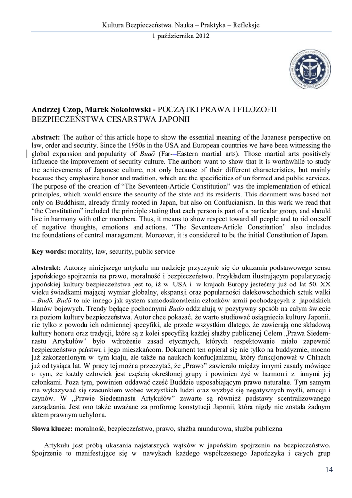 Kultura Bezpieczeństwa. Nauka – Praktyka – Refleksje 1 października 2012 Andrzej Czop, Marek Sokołowski - POCZĄTKI PRAWA I FILOZOFII BEZPIECZEŃSTWA CESARSTWA JAPONII Abstract: The author of this article hope to show the essential meaning of the Japanese perspective on law, order and security. Since the 1950s in the USA and European countries we have been witnessing the global expansion and popularity of Budō (Far- Eastern martial arts). Those martial arts positively influence the improvement of security culture. The authors want to show that it is worthwhile to study the achievements of Japanese culture, not only because of their different characteristics, but mainly because they emphasize honor and tradition, which are the specificities of uniformed and public services. The purpose of the creation of “The Seventeen-Article Constitution” was the implementation of ethical principles, which would ensure the security of the state and its residents. This document was based not only on Buddhism, already firmly rooted in Japan, but also on Confucianism. In this work we read that “the Constitution” included the principle stating that each person is part of a particular group, and should live in harmony with other members. Thus, it means to show respect toward all people and to rid oneself of negative thoughts, emotions and actions. “The Seventeen-Article Constitution” also includes the foundations of central management. Moreover, it is considered to be the initial Constitution of Japan. Key words: morality, law, security, public service Abstrakt: Autorzy niniejszego artykułu ma nadzieję przyczynić się do ukazania podstawowego sensu japońskiego spojrzenia na prawo, moralność i bezpieczeństwo. Przykładem ilustrującym popularyzację japońskiej kultury bezpieczeństwa jest to, iż w USA i w krajach Europy jesteśmy już od lat 50. XX wieku świadkami mającej wymiar globalny, ekspansji oraz popularności dalekowschodnich sztuk walki – Budō. Budō to nic innego jak system samodoskonalenia członków armii pochodzących z japońskich klanów bojowych. Trendy będące pochodnymi Budo oddziałują w pozytywny sposób na całym świecie na poziom kultury bezpieczeństwa. Autor chce pokazać, że warto studiować osiągnięcia kultury Japonii, nie tylko z powodu ich odmiennej specyfiki, ale przede wszystkim dlatego, że zawierają one składową kultury honoru oraz tradycji, które są z kolei specyfiką każdej służby publicznej Celem „Prawa Siedemnastu Artykułów” było wdrożenie zasad etycznych, których respektowanie miało zapewnić bezpieczeństwo państwu i jego mieszkańcom. Dokument ten opierał się nie tylko na buddyzmie, mocno już zakorzenionym w tym kraju, ale także na naukach konfucjanizmu, który funkcjonował w Chinach już od tysiąca lat. W pracy tej można przeczytać, że „Prawo” zawierało między innymi zasady mówiące o tym, że każdy człowiek jest częścią określonej grupy i powinien żyć w harmonii z innymi jej członkami. Poza tym, powinien oddawać cześć Buddzie usposabiającym prawo naturalne. Tym samym ma wykazywać się szacunkiem wobec wszystkich ludzi oraz wyzbyć się negatywnych myśli, emocji i czynów. W „Prawie Siedemnastu Artykułów” zawarte są również podstawy scentralizowanego zarządzania. Jest ono także uważane za proformę konstytucji Japonii, która nigdy nie została żadnym aktem prawnym uchylona. Słowa klucze: moralność, bezpieczeństwo, prawo, służba mundurowa, służba publiczna Artykułu jest próbą ukazania najstarszych wątków w japońskim spojrzeniu na bezpieczeństwo. Spojrzenie to manifestujące się w nawykach każdego współczesnego Japończyka i całych grup 14 Kultura Bezpieczeństwa. Nauka – Praktyka – Refleksje 1 października 2012 społecznych, w których przyszło mu żyć i pracować zaczęło się kształtować dość wcześnie – w historycznym procesie kształtowania się starożytnego Yamato15. Fumon Tanaka twierdzi, że zjawisko to miało miejsce już w VI wieku p.n.e.16 i przebiegało głównie w łonie klanów mononofu – skupiających japońskich wojowników, protoplastów późniejszych samurajów. Pomimo, że artykuł pisano w dużej części z policyjnego punktu widzenia, autor dostrzega, iż w Japonii, a także w innych częściach świata, to właśnie etos wojskowy17 stanowi źródło tak zwanej kultury honoru, która w znacznym stopniu przyczynia się do podnoszenia poziomu bezpieczeństwa. W Japonii zjawisko to ma jednak wymiar szczególny. Japoński rycerz – samuraj był bowiem wzorem dla każdego mieszkańca Kraju Kwitnącej Wiśni, bez względu na klasę społeczną, z której on pochodził. Skala zmilitaryzowania społeczeństwa Yamato była znaczna, a siła moralnego i organizacyjnego oddziaływanie armii i jej członków – samurajów na całe społeczeństwo i państwo wzrosła jeszcze bardziej, gdy rządy w Cesarstwie przejęło bakufu – rząd wojskowy na czele z shogunem. Sytuacja taka trwała prawie siedemset lat (XII–XIX w.), lecz pierwszym niezwykle istotnym oddziaływaniem armii i urzędników na sferę publiczną i mentalność mieszkańców Nipponu była pierwsza japońska konstytucja z 604 roku n.e. Mowa tu o Prawie Siedemnastu Artykułów, którego twórcą był książę Shotoku18. Książę Shotoku zwany również Umayado był rzecznikiem doktryny buddyjskiej, a także konfucjańskich koncepcji państwa i prawa oraz „współtwórcą jednego z systemów bujutsu”19, będących podstawę perfekcyjnego wyszkolenia samurajów. W USA i w krajach Europy jesteśmy już od lat 50. świadkami mającej wymiar globalnej ekspansji, popularności dalekowschodnich sztuk walki – Budō20. Oddziałują one w pozytywny sposób na całym świecie, podnosząc poziom kultury bezpieczeństwa. Zjawisko omawianej ekspansji Budō uzyskało swą ogromną skalę po zakończeniu II wojny światowej, w czasie kiedy miała miejsce amerykańska