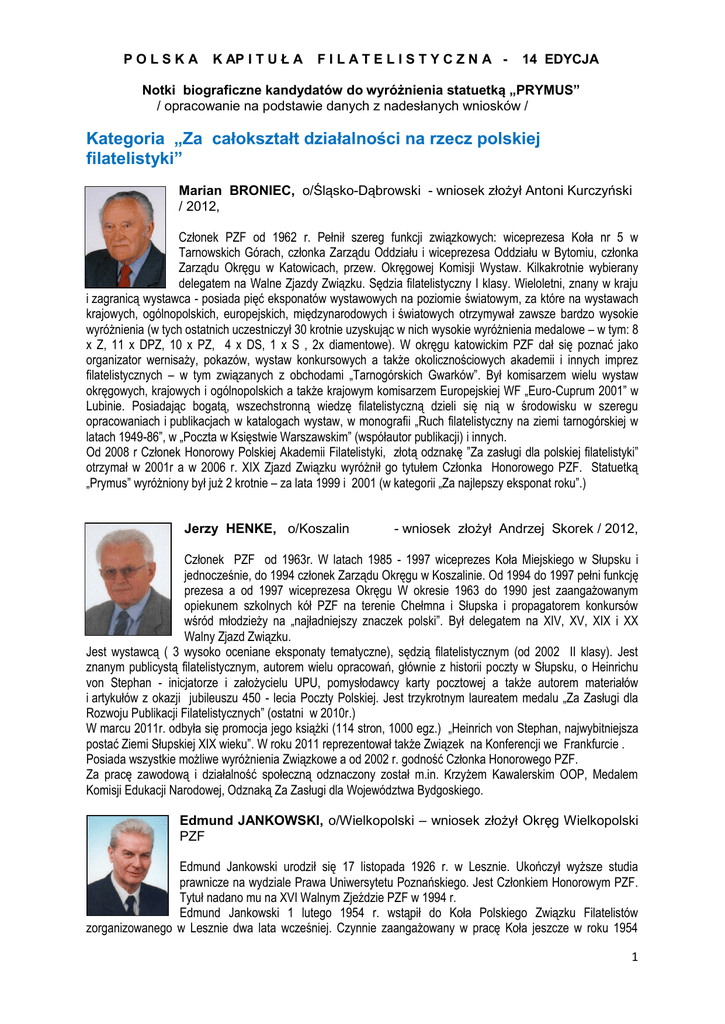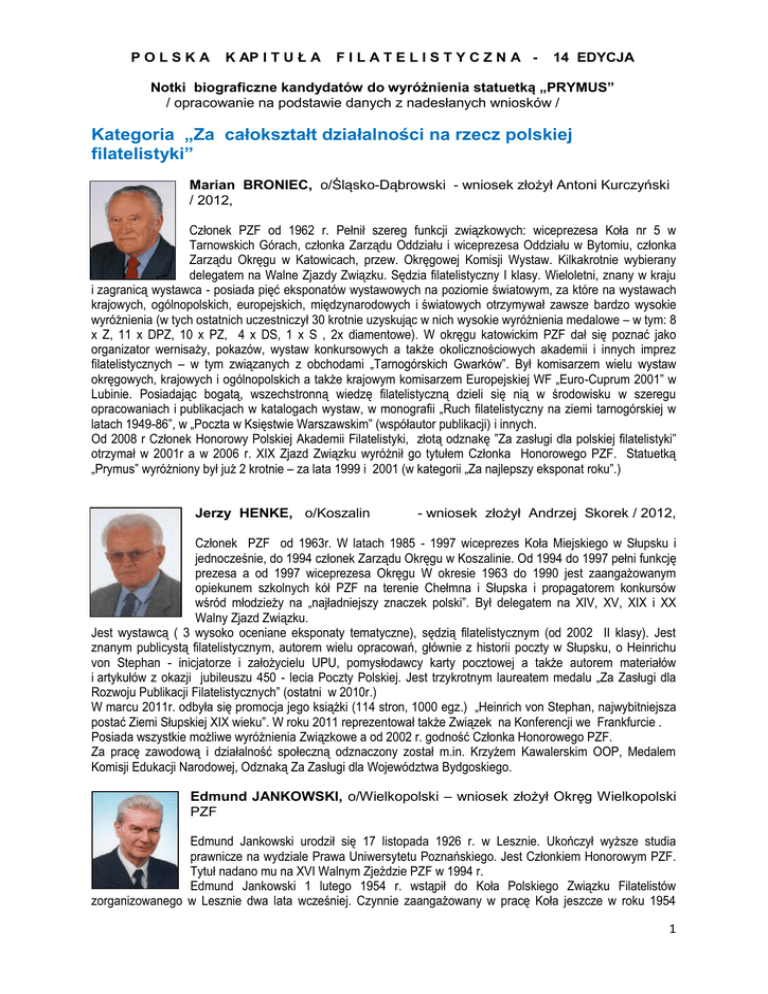 POLSKA K AP I T U Ł A FILATELISTYCZNA - 14 EDYCJA Notki biograficzne kandydatów do wyróżnienia statuetką „PRYMUS” / opracowanie na podstawie danych z nadesłanych wniosków / Kategoria „Za całokształt działalności na rzecz polskiej filatelistyki” Marian BRONIEC, o/Śląsko-Dąbrowski - wniosek złożył Antoni Kurczyński / 2012, Członek PZF od 1962 r. Pełnił szereg funkcji związkowych: wiceprezesa Koła nr 5 w Tarnowskich Górach, członka Zarządu Oddziału i wiceprezesa Oddziału w Bytomiu, członka Zarządu Okręgu w Katowicach, przew. Okręgowej Komisji Wystaw. Kilkakrotnie wybierany delegatem na Walne Zjazdy Związku. Sędzia filatelistyczny I klasy. Wieloletni, znany w kraju i zagranicą wystawca - posiada pięć eksponatów wystawowych na poziomie światowym, za które na wystawach krajowych, ogólnopolskich, europejskich, międzynarodowych i światowych otrzymywał zawsze bardzo wysokie wyróżnienia (w tych ostatnich uczestniczył 30 krotnie uzyskując w nich wysokie wyróżnienia medalowe – w tym: 8 x Z, 11 x DPZ, 10 x PZ, 4 x DS, 1 x S , 2x diamentowe). W okręgu katowickim PZF dał się poznać jako organizator wernisaży, pokazów, wystaw konkursowych a także okolicznościowych akademii i innych imprez filatelistycznych – w tym związanych z obchodami „Tarnogórskich Gwarków”. Był komisarzem wielu wystaw okręgowych, krajowych i ogólnopolskich a także krajowym komisarzem Europejskiej WF „Euro-Cuprum 2001” w Lubinie. Posiadając bogatą, wszechstronną wiedzę filatelistyczną dzieli się nią w środowisku w szeregu opracowaniach i publikacjach w katalogach wystaw, w monografii „Ruch filatelistyczny na ziemi tarnogórskiej w latach 1949-86”, w „Poczta w Księstwie Warszawskim” (współautor publikacji) i innych. Od 2008 r Członek Honorowy Polskiej Akademii Filatelistyki, złotą odznakę ”Za zasługi dla polskiej filatelistyki” otrzymał w 2001r a w 2006 r. XIX Zjazd Związku wyróżnił go tytułem Członka Honorowego PZF. Statuetką „Prymus” wyróżniony był już 2 krotnie – za lata 1999 i 2001 (w kategorii „Za najlepszy eksponat roku”.) Jerzy HENKE, o/Koszalin - wniosek złożył Andrzej Skorek / 2012, Członek PZF od 1963r. W latach 1985 - 1997 wiceprezes Koła Miejskiego w Słupsku i jednocześnie, do 1994 członek Zarządu Okręgu w Koszalinie. Od 1994 do 1997 pełni funkcję prezesa a od 1997 wiceprezesa Okręgu W okresie 1963 do 1990 jest zaangażowanym opiekunem szkolnych kół PZF na terenie Chełmna i Słupska i propagatorem konkursów wśród młodzieży na „najładniejszy znaczek polski”. Był delegatem na XIV, XV, XIX i XX Walny Zjazd Związku. Jest wystawcą ( 3 wysoko oceniane eksponaty tematyczne), sędzią filatelistycznym (od 2002 II klasy). Jest znanym publicystą filatelistycznym, autorem wielu opracowań, głównie z historii poczty w Słupsku, o Heinrichu von Stephan - inicjatorze i założycielu UPU, pomysłodawcy karty pocztowej a także autorem materiałów i artykułów z okazji jubileuszu 450 - lecia Poczty Polskiej. Jest trzykrotnym laureatem medalu „Za Zasługi dla Rozwoju Publikacji Filatelistycznych” (ostatni w 2010r.) W marcu 2011r. odbyła się promocja jego książki (114 stron, 1000 egz.) „Heinrich von Stephan, najwybitniejsza postać Ziemi Słupskiej XIX wieku”. W roku 2011 reprezentował także Związek na Konferencji we Frankfurcie . Posiada wszystkie możliwe wyróżnienia Związkowe a od 2002 r. godność Członka Honorowego PZF. Za pracę zawodową i działalność społeczną odznaczony został m.in. Krzyżem Kawalerskim OOP, Medalem Komisji Edukacji Narodowej, Odznaką Za Zasługi dla Województwa Bydgoskiego. Edmund JANKOWSKI, o/Wielkopolski – wniosek złożył Okręg Wielkopolski PZF Edmund Jankowski urodził się 17 listopada 1926 r. w Lesznie. Ukończył wyższe studia prawnicze na wydziale Prawa Uniwersytetu Poznańskiego. Jest Członkiem Honorowym PZF. Tytuł nadano mu na XVI Walnym Zjeździe PZF w 1994 r. Edmund Jankowski 1 lutego 1954 r. wstąpił do Koła Polskiego Związku Filatelistów zorganizowanego w Lesznie dwa lata wcześniej. Czynnie zaangażowany w pracę Koła jeszcze w roku 1954 1 wybrany został wiceprezesem. W dniu 31 stycznia 1963 r. został jego prezesem. Funkcję prezesa pełnił do 2010 roku. Obecnie jest honorowym prezesem Koła. W roku 1969 wybrano go w skład Zarządu i Prezydium Okręgu Wielkopolskiego. W latach 1994-1997 był prezesem Zarządu Okręgu i członkiem Zarządu Głównego PZF. Wielokrotnie (8 razy) był Delegatem na kolejnych Zjazdach, współprzewodnicząc na zjeździe w Bydgoszczy i przewodnicząc XVI Walnemu Zjazdowi w Poznaniu. Historia Koła to działalność w nim Edmunda Jankowskiego. Pod jego przewodnictwem leszczyńskie Koło PZF (począwszy od 1958 r.) wznowiło przewozy poczty szybowcami i balonami Prawie co roku Koło organizowało ”poczty szybowcowe” i poczty balonowe”. W ciągu minionych 50 lat przewieziono w granicach 160 tys. przesyłek szybowcami i balonami startującymi z Leszna i okolic. Koło szczyci się faktem, że tak duża liczba przesyłek zdobi zbiory filatelistyczne nie tylko w kraju, ale i na całym świecie. Leszczyńskie Koło w okresie swego istnienia pod jego kierownictwem zorganizowało 19 wystaw, w tym 4 krajowe, którymi uczczony został Jubileusz 450-lecia miasta Leszna, 160 Jubileusz Straży Pożarnej, wystawę upamiętniającą 60-lecie odzyskania Niepodległości (jedyną zresztą w Polsce, która skupiła 131 zbiorów na 630 ekranach), oraz rocznice związane z 325-leciem ustanowienia Poczty w Lesznie i 450-lecia Poczty w Polsce. Pozostałe związane były z rocznicami i jubileuszami wydarzeń na trwałe wpisującymi się w historię miasta Leszna. Na wystawę z okazji 325 rocznicy utworzenia Poczty w Lesznie, Edmund Jankowski opracował na kilkudziesięciu stronach historię poczty w Lesznie, zamieszczoną w Katalogu Wystawy liczącym 102 str. Jego autorstwa było te