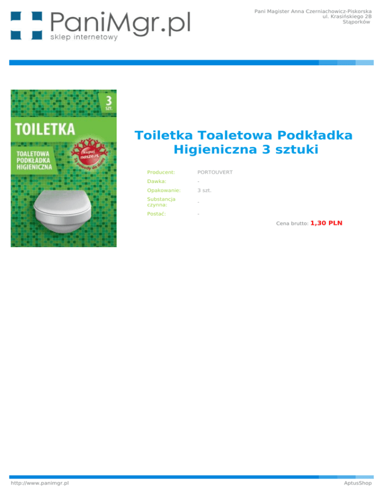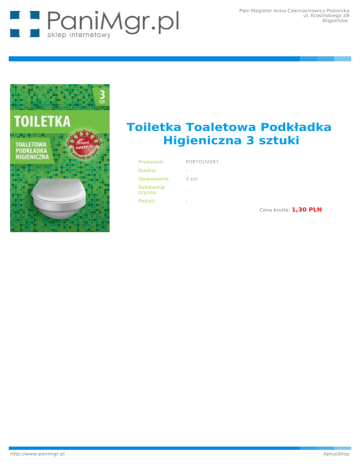 Pani Magister Anna Czerniachowicz-Piskorska ul. Krasińskiego 2B Stąporków Toiletka Toaletowa Podkładka Higieniczna 3 sztuki Producent: PORTOUVERT Dawka: - Opakowanie: 3 szt. Substancja czynna: - Postać: Cena brutto: http://www.panimgr.pl 1,30 PLN AptusShop