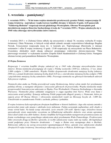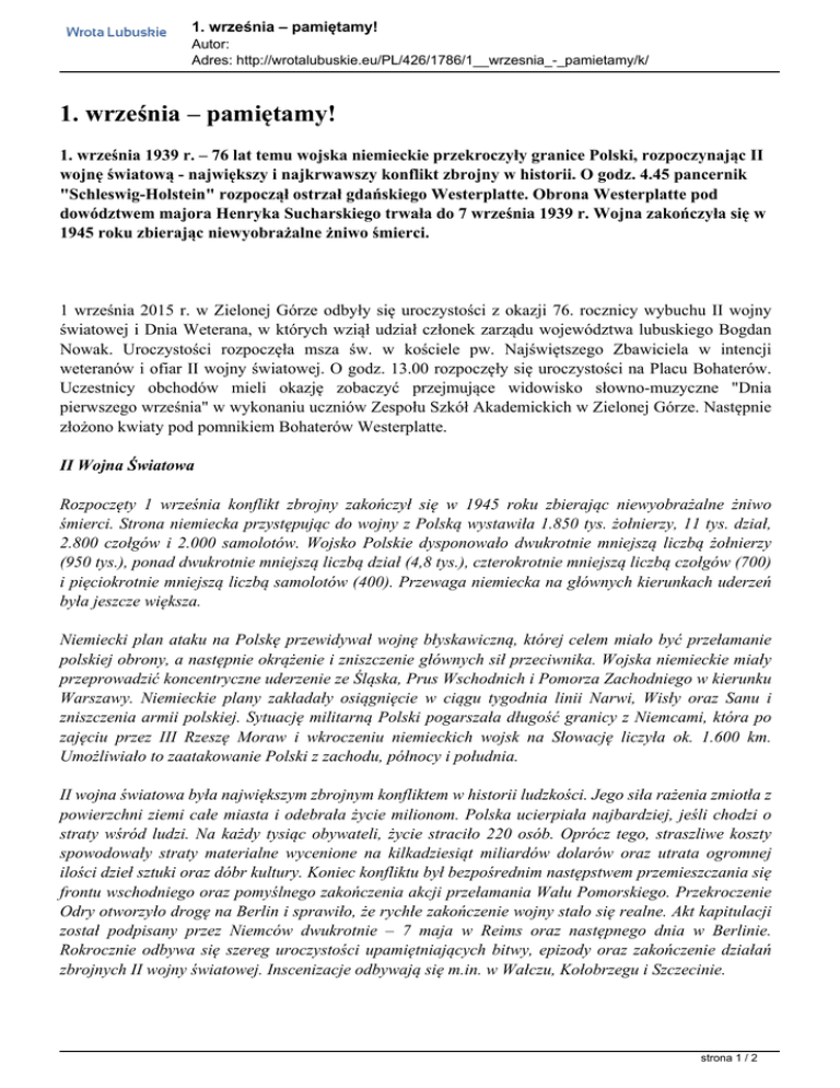 1. września – pamiętamy! Autor: Adres: http://wrotalubuskie.eu/PL/426/1786/1__wrzesnia_-_pamietamy/k/ 1. września – pamiętamy! 1. września 1939 r. – 76 lat temu wojska niemieckie przekroczyły granice Polski, rozpoczynając II wojnę światową - największy i najkrwawszy konflikt zbrojny w historii. O godz. 4.45 pancernik "Schleswig-Holstein" rozpoczął ostrzał gdańskiego Westerplatte. Obrona Westerplatte pod dowództwem majora Henryka Sucharskiego trwała do 7 września 1939 r. Wojna zakończyła się w 1945 roku zbierając niewyobrażalne żniwo śmierci. 1 września 2015 r. w Zielonej Górze odbyły się uroczystości z okazji 76. rocznicy wybuchu II wojny światowej i Dnia Weterana, w których wziął udział członek zarządu województwa lubuskiego Bogdan Nowak. Uroczystości rozpoczęła msza św. w kościele pw. Najświętszego Zbawiciela w intencji weteranów i ofiar II wojny światowej. O godz. 13.00 rozpoczęły się uroczystości na Placu Bohaterów. Uczestnicy obchodów mieli okazję zobaczyć przejmujące widowisko słowno-muzyczne "Dnia pierwszego września" w wykonaniu uczniów Zespołu Szkół Akademickich w Zielonej Górze. Następnie złożono kwiaty pod pomnikiem Bohaterów Westerplatte. II Wojna Światowa Rozpoczęty 1 września konflikt zbrojny zakończył się w 1945 roku zbierając niewyobrażalne żniwo śmierci. Strona niemiecka przystępując do wojny z Polską wystawiła 1.850 tys. żołnierzy, 11 tys. dział, 2.800 czołgów i 2.000 samolotów. Wojsko Polskie dysponowało dwukrotnie mniejszą liczbą żołnierzy (950 tys.), ponad dwukrotnie mniejszą liczbą dział (4,8 tys.), czterokrotnie mniejszą liczbą czołgów (700) i pięciokrotnie mniejszą liczbą samolotów (400). Przewaga niemiecka na głównych kierunkach uderzeń była jeszcze większa. Niemiecki plan ataku na Polskę przewidywał wojnę błyskawiczną, której celem miało być przełamanie polskiej obrony, a następnie okrążenie i zniszczenie głównych sił przeciwnika. Wojska niemieckie miały przeprowadzić koncentryczne uderzenie ze Śląska, Prus Wschodnich i Pomorza Zachodniego w kierunku Warszawy. Niemieckie plany zakładały osiągnięcie w ciągu tygodnia linii Narwi, Wisły oraz Sanu i zniszczenia armii polskiej. Sytuację militarną Polski pogarszała długość granicy z Niemcami, która po zajęciu przez III Rzeszę Moraw i wkroczeniu niemieckich wojsk na Słowację liczyła ok. 1.600 km. Umożliwiało to zaatakowanie Polski z zachodu, północy i południa. II wojna światowa była największym zbrojnym konfliktem w historii ludzkości. Jego siła rażenia zmiotła z powierzchni ziemi całe miasta i odebrała życie milionom. Polska ucierpiała najbardziej, jeśli chodzi o straty wśród ludzi. Na każdy tysiąc obywateli, życie straciło 220 osób. Oprócz tego, straszliwe koszty spowodowały straty materialne wycenione na kilkadziesiąt miliardów dolarów oraz utrata ogromnej ilości dzieł sztuki oraz dóbr kultury. Koniec konfliktu był bezpośrednim następstwem przemieszczania się frontu wschodniego oraz pomyślnego zakończenia akcji przełamania Wału Pomorskiego. Przekroczenie Odry otworzyło drogę na Berlin i sprawiło, że rychłe zakończenie wojny stało się realne. Akt kapitulacji został podpisany przez Niemców dwukrotnie – 7 maja w Reims oraz następnego dnia w Berlinie. Rokrocznie odbywa się szereg uroczystości upamiętniających bitwy, epizody oraz zakończenie działań zbrojnych II wojny światowej. Inscenizacje odbywają się m.in. w Wałczu, Kołobrzegu i Szczecinie. strona 1 / 2 1. września – pamiętamy! Autor: Adres: http://wrotalubuskie.eu/PL/426/1786/1__wrzesnia_-_pamietamy/k/ strona 2 / 2 Powered by TCPDF (www.tcpdf.org)