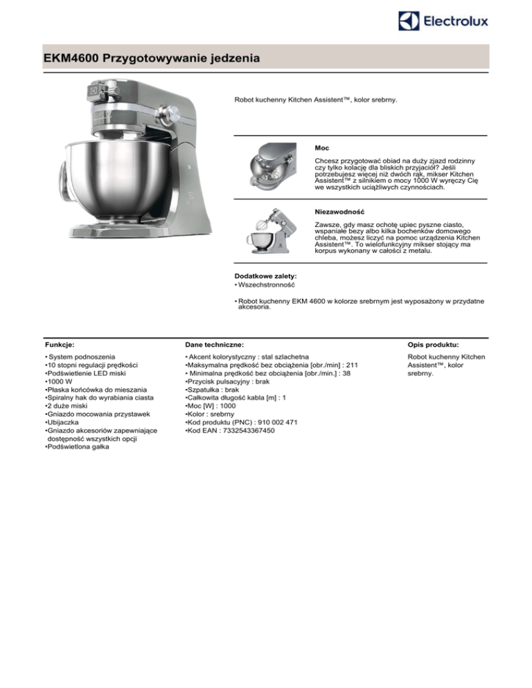 EKM4600 Przygotowywanie jedzenia Robot kuchenny Kitchen Assistent™, kolor srebrny. Moc Chcesz przygotować obiad na duży zjazd rodzinny czy tylko kolację dla bliskich przyjaciół? Jeśli potrzebujesz więcej niż dwóch rąk, mikser Kitchen Assistent™ z silnikiem o mocy 1000 W wyręczy Cię we wszystkich uciążliwych czynnościach. Niezawodność Zawsze, gdy masz ochotę upiec pyszne ciasto, wspaniałe bezy albo kilka bochenków domowego chleba, możesz liczyć na pomoc urządzenia Kitchen Assistent™. To wielofunkcyjny mikser stojący ma korpus wykonany w całości z metalu. Dodatkowe zalety: • Wszechstronność • Robot kuchenny EKM 4600 w kolorze srebrnym jest wyposażony w przydatne akcesoria. Funkcje: Dane techniczne: Opis produktu: • System podnoszenia •10 stopni regulacji prędkości •Podświetlenie LED miski •1000 W •Płaska końcówka do mieszania •Spiralny hak do wyrabiania ciasta •2 duże miski •Gniazdo mocowania przystawek •Ubijaczka •Gniazdo akcesoriów zapewniające dostępność wszystkich opcji •Podświetlona gałka • Akcent kolorystyczny : stal szlachetna •Maksymalna prędkość bez obciążenia [obr./min] : 211 • Minimalna prędkość bez obciążenia [obr./min.] : 38 •Przycisk pulsacyjny : brak •Szpatułka : brak •Całkowita długość kabla [m] : 1 •Moc [W] : 1000 •Kolor : srebrny •Kod produktu (PNC) : 910 002 471 •Kod EAN : 7332543367450 Robot kuchenny Kitchen Assistent™, kolor srebrny.