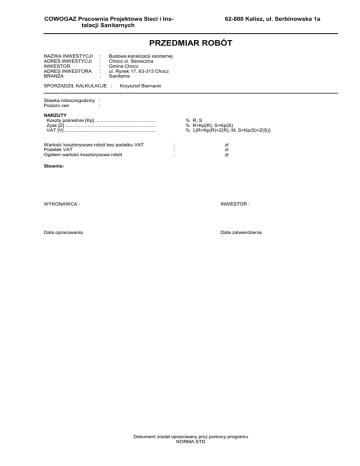 COWOGAZ Pracownia Projektowa Sieci i Instalacji Sanitarnych 62-800 Kalisz, ul. Serbinowska 1a PRZEDMIAR ROBÓT NAZWA INWESTYCJI ADRES INWESTYCJI INWESTOR ADRES INWESTORA BRANŻA : : : : : Budowa kanalizacji sanitarnej Chocz ul. Słoneczna Gmina Chocz ul. Rynek 17, 63-313 Chocz Sanitarna SPORZĄDZIŁ KALKULACJE : Krzysztof Biernacki Stawka roboczogodziny : Poziom cen : NARZUTY Koszty pośrednie [Kp] ............................................ Zysk [Z] .................................................................. VAT [V] .................................................................. Wartość kosztorysowa robót bez podatku VAT Podatek VAT Ogółem wartość kosztorysowa robót % R, S % R+Kp(R), S+Kp(S) % Σ(R+Kp(R)+Z(R), M, S+Kp(S)+Z(S)) : : : zł zł zł Słownie: WYKONAWCA : INWESTOR : Data opracowania Data zatwierdzenia Dokument został opracowany przy pomocy programu NORMA STD kosztorys S11-S12 Kanal 2.1.ath Lp. 1 2 3 4 Nazwa Roboty przygotowawcze Roboty ziemne Roboty montażowe Roboty w zakresie odtworzenia nawierzchni RAZEM netto VAT Razem brutto TABELA ELEMENTÓW SCALONYCH Robocizna Materiały Słownie: -2- Norma STD Wersja 4.34 Nr seryjny: 11296 Użytkownik: Ania Sprzęt Kp Z RAZEM kosztorys S11-S12 Kanal 2.1.ath Lp. Podstawa 1 1 KNR 2-01 d.1 0119-03 analogia OBMIAR Opis i wyliczenia Roboty przygotowawcze Roboty pomiarowe przy liniowych robotach ziemnych - wytyczenie kanalizacji sanitarnej grawitacyjnej 0.048 j.m. 2 5 KNR 2-01 d.2 0206-01 6 KNR 2-01 d.2 0317-0101 7 KNR 2-01 d.2 0301-01 z.sz. 2.2 8 KNNR 1 d.2 0208-02 9 KNR 2-18 d.2 0501-02 10 KNR 2-01 d.2 0320-0401 11 KNR 2-01 d.2 0230-01 12 KNR 2-01 d.2 0236-01 analogia 13 KNR 2-01 d.2 0322-01 14 KNNR 1 d.2 0605-01 Roboty ziemne Roboty ziemne wykonywane koparkami podsiębiernymi o poj.łyżki 0.40 m3 w gr.kat.I-II z transportem urobku samochodami samowyładowczymi na odległość do 1 km 97.98 szt 0.05 1.00 RAZEM 1.00 1.00 RAZEM 1.00 1.00 RAZEM 1.00 97.98 RAZEM 97.98 24.49 RAZEM 24.49 24.49 RAZEM 24.49 122.47 RAZEM 122.47 50.40 RAZEM 50.40 23.69 RAZEM 23.69 91.22 RAZEM 91.22 114.91 RAZEM 114.91 233.28 RAZEM 233.28 64.00 RAZEM 64.00 48.00 RAZEM 48.00 kpl. kpl. m3 m3 Wykopy liniowe o ścianach pionowych pod fundamenty, rurociągi, kolektory w m3 gruntach suchych kat.I-II z wydobyciem urobku łopatą lub wyciągiem ręcznym; głębokość do 1.5 m, szerokość 0.8-1.5 m 24.49 m3 Ręczne roboty ziemne z transportem urobku samochodami samowyładowczy- m3 mi na odległość do 1 km (kat.gr.I-II) Grunt uprzednio odspojony. 24.49 m3 Dodatek za każdy rozp. 1 km transportu ziemi samochodami samowyładowczymi po drogach o nawierzchni utwardzonej(kat.gr. I-IV) Krotność = 4 122.47 m3 Kanały rurowe - podłoża z materiałów sypkich o grubości 15 cm m2 50.4 m2 m3 Zasypywanie wykopów liniowych o ścianach pionowych w gruntach kat.I-II; m3 głębokość do 3.0 m, szerokość 0.8-1.5 m - obsypka 30 cm ponad wierzch rury 23.69 m3 Zasypywanie wykopów spycharkami z przemieszczeniem gruntu na odl. do 10 m3 m w gruncie kat. I-III - pozostała część wykopu (wraz z dostawą piasku) 91.22 m3 Zagęszczenie nasypów ubijakami mechanicznymi; grunty sypkie kat. I-III m3 114.91 m3 Pełne umocnienie pionowych ścian wykopów liniowych o głębok.do 3.0 m wypraskami w grunt.suchych kat.I-II wraz z rozbiór. 233.28 m2 Igłofiltry o średnicy do 50 mm wpłukiwane w grunt do głębokości 4 m. szt. 64 szt. 15 KNNR 1 Pompowanie wody z wykopu za pomocą igfłofiltrów (przyjęto 1.0 m-g na 1m d.2 0603-01 ana- rurociągu) logia 48 3 0.05 RAZEM szt 3 Opłaty administracyjne za zajęcie pasa drogowego na czas wykonywania robót kpl. d.1 wycena indywidualna 1.0 kpl. 4 Oznakowanie robót (znaki drogowe organizacji ruchu dogowego, tablice inford.1 wycena indy- mujące placu budowy) widualna 1.0 Razem km km 2 Obsługa geoodezyjna kanalizacji sanitarnej - inwentaryzacja d.1 wycena indywidualna 1.0 Poszcz Roboty montażowe -3- Norma STD Wersja 4.34 Nr seryjny: 11296 Użytkownik: Ania m2 godz. godz. kosztorys S11-S12 Kanal 2.1.ath Lp. Podstawa 16 KNNR 4 d.3 1308-03 z.sz.3.4. 9913-2 17 KNNR 4 d.3 1413-03 OBMIAR Opis i wyliczenia j.m. Kanały z rur PVC łączonych na wcisk o śr. zewn. 200 mm - wykopy umocnione m 48 m Studnie rewizyjne z kręgów betonowych o śr. 1000 mm w gotowym wykopie stud. 1 stud. 18 KNR-W 2-15 Włazy żeliwno-betonowe klasy D400 d.3 0227-04 1 19 KNR 2-18 d.3 0804-02 Razem 48.00 RAZEM 48.00 1.00 RAZEM 1.00 1.00 RAZEM 1.00 48.00 RAZEM 48.00 50.40 RAZEM 50.40 szt. szt. Próba szczelności kanałów rurowych o śr.nom. 200 mm m 48 m 4 Roboty w zakresie odtworzenia nawierzchni 20 KNR-W 2-01 Ręczne plantowanie powierzchni gruntu rodzimego kat. I-III d.4 0505-01 50.4 -4- Norma STD Wersja 4.34 Nr seryjny: 11296 Użytkownik: Ania Poszcz m2 m2 kosztorys S11-S12 Kanal 2.1.ath Lp. Podstawa 1 1 KNR 2-01 d.1 0119-03 analogia Opis jm Roboty przygotowawcze Roboty pomiarowe przy liniowych robotach ziemnych - wytyczenie kanalizacji sanitarnej grawitacyjnej obmiar = 0.048 = 0.05 km Nakłady Koszt jedn. R M S km 1* -- R -robocizna 117*0.955=111.735r-g/km r-g 5.587 2* -- M -słupki drewniane iglaste śr.70mm 0.104m3/km m3 0.005 m-g 0.375 -- S -samochód dostawczy 0.9 t 7.5m-g/km Razem koszty bezpośrednie: Jednostkowe koszty bezpośrednie: Cena jednostkowa: 2 Obsługa geoodezyjna kanalizacji sanitarnej d.1 wycena indy- inwentaryzacja widualna obmiar = 1.0 szt 3* -- M -obsługa geodezyjna kanalizacji sanitarnej 1kpl./szt Razem koszty bezpośrednie: Jednostkowe koszty bezpośrednie: Cena jednostkowa: 3 Opłaty administracyjne za zajęcie pasa drogod.1 wycena indy- wego na czas wykonywania robót widualna obmiar = 1.0 kpl. 1* szt kpl. 1.000 kpl. -- M -opłaty administracyjne za zajęcie pasa drogo- kpl. wego na czas wykonywania robót 1kpl./kpl. Razem koszty bezpośrednie: Jednostkowe koszty bezpośrednie: Cena jednostkowa: 4 Oznakowanie robót (znaki drogowe organizacji kpl. d.1 wycena indy- ruchu dogowego, tablice informujące placu buwidualna dowy) obmiar