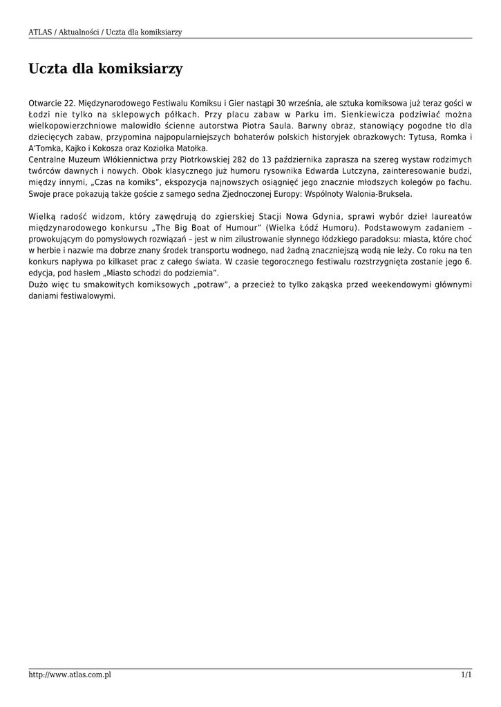 ATLAS / Aktualności / Uczta dla komiksiarzy Uczta dla komiksiarzy Otwarcie 22. Międzynarodowego Festiwalu Komiksu i Gier nastąpi 30 września, ale sztuka komiksowa już teraz gości w Łodzi nie tylko na sklepowych półkach. Przy placu zabaw w Parku im. Sienkiewicza podziwiać można wielkopowierzchniowe malowidło ścienne autorstwa Piotra Saula. Barwny obraz, stanowiący pogodne tło dla dziecięcych zabaw, przypomina najpopularniejszych bohaterów polskich historyjek obrazkowych: Tytusa, Romka i A’Tomka, Kajko i Kokosza oraz Koziołka Matołka. Centralne Muzeum Włókiennictwa przy Piotrkowskiej 282 do 13 października zaprasza na szereg wystaw rodzimych twórców dawnych i nowych. Obok klasycznego już humoru rysownika Edwarda Lutczyna, zainteresowanie budzi, między innymi, „Czas na komiks”, ekspozycja najnowszych osiągnięć jego znacznie młodszych kolegów po fachu. Swoje prace pokazują także goście z samego sedna Zjednoczonej Europy: Wspólnoty Walonia-Bruksela. Wielką radość widzom, który zawędrują do zgierskiej Stacji Nowa Gdynia, sprawi wybór dzieł laureatów międzynarodowego konkursu „The Big Boat of Humour” (Wielka Łódź Humoru). Podstawowym zadaniem – prowokującym do pomysłowych rozwiązań – jest w nim zilustrowanie słynnego łódzkiego paradoksu: miasta, które choć w herbie i nazwie ma dobrze znany środek transportu wodnego, nad żadną znaczniejszą wodą nie leży. Co roku na ten konkurs napływa po kilkaset prac z całego świata. W czasie tegorocznego festiwalu rozstrzygnięta zostanie jego 6. edycja, pod hasłem „Miasto schodzi do podziemia”. Dużo więc tu smakowitych komiksowych „potraw”, a przecież to tylko zakąska przed weekendowymi głównymi daniami festiwalowymi. http://www.atlas.com.pl 1/1