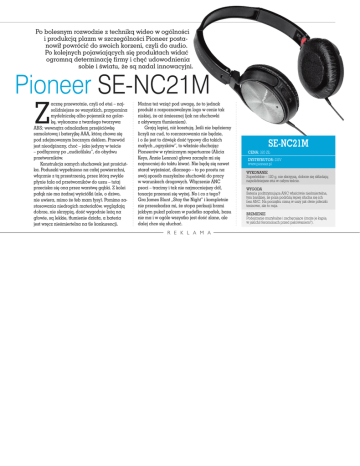 Po bolesnym rozwodzie z techniką wideo w ogólności i produkcją plazm w szczególności Pioneer postanowił powrócić do swoich korzeni, czyli do audio. Po kolejnych pojawiających się produktach widać ogromną determinację firmy i chęć udowodnienia sobie i światu, że są nadal innowacyjni. Pioneer SE-NC21M Z acznę przewrotnie, czyli od etui – najsolidniejsze ze wszystkich, przypomina mydelniczkę albo pojemnik na golarkę, wykonane z twardego tworzywa ABS; wewnątrz odnalazłem przejściówkę samolotową i bateryjkę AAA, którą chowa się pod zdejmowanym bocznym deklem. Przewód jest nieodpinany, choć – jako jedyny w teście – podłączony po „audiofilsku”, do obydwu przetworników. Konstrukcja samych słuchawek jest prościutka. Poduszki wypełniono na całej powierzchni, włącznie z tą przestrzenią, przez którą zwykle płynie fala od przetworników do uszu – tutaj przeciska się ona przez warstwę gąbki. Z kolei pałąk nie ma żadnej wyściółki (ale, o dziwo, nie uwiera, mimo że łeb mam łysy). Pomimo zastosowania niedrogich materiałów, wyglądają dobrze, nie skrzypią, dość wygodnie leżą na głowie, są lekkie, tłumienie działa, a bateria jest wręcz nieśmiertelna na tle konkurencji. Można też wziąć pod uwagę, że to jednak produkt z rozpoznawalnym logo w cenie tak niskiej, że aż śmiesznej (jak na słuchawki z aktywnym tłumieniem). Grają lepiej, niż kosztują. Jeśli nie będziemy liczyli na cud, to rozczarowania nie będzie, i o ile jest to dźwięk dość typowy dla takich małych „ogryzków”, to właśnie słuchając Pioneerów w rytmicznym repertuarze (Alicia Keys, Annie Lennox) głowa zaczęła mi się najmocniej do taktu kiwać. Nie będę się nawet starał wyjaśniać, dlaczego – to po prostu na swój sposób muzykalne słuchawki do pracy w warunkach drogowych. Włączenie ANC psoci – tracimy i tak nie najmocniejszy dół, tonacja przenosi się wyżej. No i co z tego? Gra James Blunt „Stay the Night” i kompletnie nie przeszkadza mi, że stopa perkusji brzmi jakbym pukał palcem w pudełko zapałek, basu nie ma i w ogóle wszystko jest dość zlane, ale dalej chce się słuchać. SE-NC21M CENA: 320 ZŁ DYSTRYBUTOR: DSV www.pioneer.pl Wykonanie Superlekkie – 120 g, nie skrzypią, dobrze się składają; najsolidniejsze etui w całym teście. wygoda Bateria podtrzymująca ANC właściwie nieśmiertelna, tym bardziej, że poza podróżą lepiej słucha się ich bez ANC. Na początku cisną w uszy jak dwie piłeczki tenisowe, ale to mija. brzmienie Podejrzanie muzykalne i zachęcające (może je kąpią w jakichś feromonach przed pakowaniem?). R E K L A M A www.audio.com.pl czerwiec 2013 57