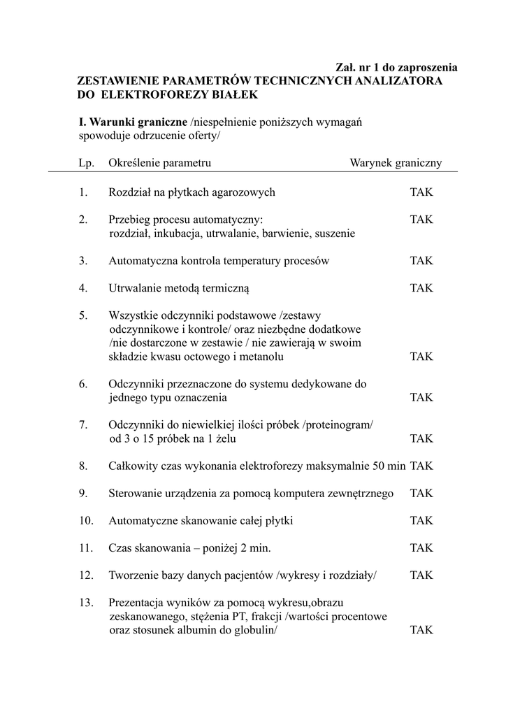 Zał. nr 1 do zaproszenia ZESTAWIENIE PARAMETRÓW TECHNICZNYCH ANALIZATORA DO ELEKTROFOREZY BIAŁEK I. Warunki graniczne /niespełnienie poniższych wymagań spowoduje odrzucenie oferty/ Lp. Określenie parametru 1. Rozdział na płytkach agarozowych TAK 2. Przebieg procesu automatyczny: rozdział, inkubacja, utrwalanie, barwienie, suszenie TAK 3. Automatyczna kontrola temperatury procesów TAK 4. Utrwalanie metodą termiczną TAK 5. Wszystkie odczynniki podstawowe /zestawy odczynnikowe i kontrole/ oraz niezbędne dodatkowe /nie dostarczone w zestawie / nie zawierają w swoim składzie kwasu octowego i metanolu TAK Odczynniki przeznaczone do systemu dedykowane do jednego typu oznaczenia TAK Odczynniki do niewielkiej ilości próbek /proteinogram/ od 3 o 15 próbek na 1 żelu TAK 6. 7. Warynek graniczny 8. Całkowity czas wykonania elektroforezy maksymalnie 50 min TAK 9. Sterowanie urządzenia za pomocą komputera zewnętrznego TAK 10. Automatyczne skanowanie całej płytki TAK 11. Czas skanowania – poniżej 2 min. TAK 12. Tworzenie bazy danych pacjentów /wykresy i rozdziały/ TAK 13. Prezentacja wyników za pomocą wykresu,obrazu zeskanowanego, stężenia PT, frakcji /wartości procentowe oraz stosunek albumin do globulin/ TAK 14. Możliwość wprowadzenia modyfikacji wykresów TAK 15. Możliwość obliczania ilości białka z zaznaczeniem fragmentu krzywej /białko monoklonalne/ TAK Aparat posiada funkcję porównania rozdziałów tego samego pacjenta TAK 17. Wydruk po zatwierdzeniu przez operatora TAK 18. System operacyjny komputera – Windows XP TAK 19. Zewnętrzna drukarka laserowa TAK 20. Wyrób medyczny oznaczony znakiem CE TAK 21. Instrukcja obsługi systemu w jężyku polskim TAK 22. Kontrola jakości w oparciu o surowicę N i P /kontrola na 2 poziomach/ TAK Możliwość przesyłania do sieci laboratoryjnej krzywej /proteinogram/ TAK Bezpłatny serwis przez cały okres trwania umowy /koszty napraw, wymiany podzespołów, okresowe przeglądu, itp./. Działania naprawcze będą podejmowane bez jakichkolwiek warunków wstępnych. TAK Instalacja, uruchomienie, szkolenie personelu na koszt oferenta TAK 16. 23. 24. 25. Parametry oceniane: Lp. 1. 2. Określenie parametru Objętość analizowanej próbki Możliwość wyboru wielkości wydruku Opis - do 10 µl - od 10 ul do 20 µl 5 pkt -powyżej 20 µl 0 pkt wydruk A-4 lub A-5 10 pkt w zależności od potrzeb wydruk tylko A-4 lub tylko A-5 3. Możliwość wprowadzenia danych pacjenta przed lub po zeskanowaniu próbek Możliwość wprowadzenia danych pacjenta tylko po zeskanowaniu Ocena 10 pkt 0 pkt 10 pkt 0 pkt