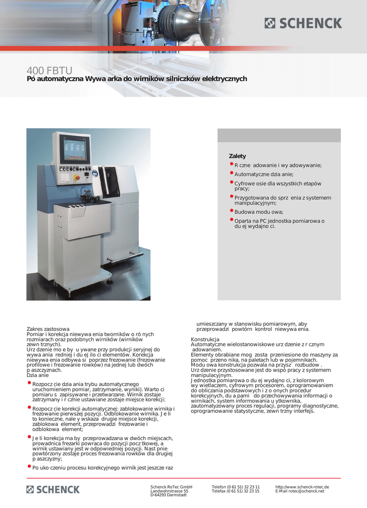 400 FBTU Pó automatyczna Wywa arka do wirników silniczków elektrycznych Zalety • R czne adowanie i wy adowywanie; • Automatyczne dzia anie; • Cyfrowe osie dla wszystkich etapów pracy; • Przygotowana do sprz enia z systemem manipulacyjnym; • Budowa modu owa; • Oparta na PC jednostka pomiarowa o du ej wydajno ci. Zakres zastosowa Pomiar i korekcja niewywa enia tworników o ró nych rozmiarach oraz podobnych wirników (wirników zewn trznych). Urz dzenie mo e by u ywane przy produkcji seryjnej do wywa ania redniej i du ej ilo ci elementów. Korekcja niewywa enia odbywa si poprzez frezowanie (frezowanie profilowe i frezowanie rowków) na jednej lub dwóch p aszczyznach. Dzia anie • Rozpocz cie dzia ania trybu automatycznego uruchomieniem pomiar, zatrzymanie, wyniki). Warto ci pomiaru s zapisywane i przetwarzane. Wirnik zostaje zatrzymany i r cznie ustawiane zostaje miejsce korekcji; • Rozpocz cie korekcji automatycznej: zablokowanie wirnika i frezowanie pierwszej pozycji. Odblokowanie wirnika. Je li to konieczne, nale y wskaza drugie miejsce korekcji, zablokowa element, przeprowadzi frezowanie i odblokowa element; umieszczany w stanowisku pomiarowym, aby przeprowadzi powtórn kontrol niewywa enia. Konstrukcja Automatyczne wielostanowiskowe urz dzenie z r cznym adowaniem. Elementy obrabiane mog zosta przeniesione do maszyny za pomoc przeno nika, na paletach lub w pojemnikach. Modu owa konstrukcja pozwala na przysz rozbudow . Urz dzenie przystosowane jest do wspó pracy z systemem manipulacyjnym. Jednostka pomiarowa o du ej wydajno ci, z kolorowym wy wietlaczem, cyfrowym procesorem, oprogramowaniem do obliczania podstawowych i z o onych procedur korekcyjnych, du a pami do przechowywania informacji o wirnikach, system informowania u ytkownika, zautomatyzowany proces regulacji, programy diagnostyczne, oprogramowanie statystyczne, zewn trzny interfejs. • Je li korekcja ma by przeprowadzana w dwóch miejscach, prowadnica frezarki powraca do pozycji pocz tkowej, a wirnik ustawiany jest w odpowiedniej pozycji. Nast pnie powtórzony zostaje proces frezowania rowków dla drugiej p aszczyzny; • Po uko czeniu procesu korekcyjnego wirnik jest jeszcze raz Schenck RoTec GmbH Landwehrstrasse 55 D-64293 Darmstadt Telefon (0 61 51) 32 23 11 Telefax (0 61 51) 32 23 15 http://www.schenck-rotec.de E-Mail [email protected] 400 FBTU Pó automatyczna Wywa arka do wirników silniczków elektrycznych The rotor is loaded into the balancing unit that has been setup for the rotor type and accelerated to balancing speed by the belt-drive. The measured unbalance values are calculated for correction and stored. Finally the rotor is stopped in a defined position.Runup, measurement, brake and indexing are automatic.One or two measuring stations are possible. Change over to a new rotor type is quick and without problems. Only the bearing inserts and axial retainers of the balancing unit must be set up and the clamping piece for the correction station changed.Calibration data, milling curves, milling plane distances, etc. are simply called from the memory for each rotor type.For the mechanical change over the supervisor is guided by a color display. The rotor is clamped from above during milling. The milling cutter plunges into the rotor stack. The milling depth varies according to initial unbalance and rotor geometry. The chips drop down into a container.All movements like indexing, moving into the correction plane, and milling advance, are controlled digitally.All milling actions are selectable without control changes. 1 Measuring station2 Correction station3 Feed (example)4 Outlet (example)5 Place of deposit, out of tolerance (example)6 Switch cabinet7 Swarf extractor (option) Plan view (non-binding example) Schenck RoTec GmbH Landwehrstrasse 55 D-64293 Darmstadt Telefon (0 61 51) 32 23 11 Telefax (0 61 51) 32 23 15 http://www.schenck-rotec.de E-Mail [email protected] 400 FBTU Pó automatyczna Wywa arka do wirników silniczków elektrycznych Technical data at a glance 421 FBTU 422 FBTU Measuring unit CAB 850 CAB 850 Polar profile milling • Slot-milling in components • Commutator armatures Weight [kg] 0,1 - 2,0 0,1 - 2,0 Diameter [mm] 24 - 66 24 - 82 Stack length [mm] 12 - 65 30 - 65 Total length [mm] 90 - 250 90 - 250 Stack inclination [mm] straight/skewed straight/skewed Width A [mm] 1465 1465 Depth B [mm] 1870 1870 Height C [mm] 2046 2046 Balancing speed [min -1] 900 - 2000 900 - 2000 Measurement uncertainty [gmm] 0,02 - 0,1 0,02 - 0,1 Achievable tolerance [gmm] 0,4 - 1,8 0,4 - 1,8 [s] 15 - 18 18 - 20 Change over time [min] 5 - 15 5 - 15 Air pressure [kPa] 450 450 Air consumption [m3/h] 1 1 Power consumption [kVA] 6 6 Order No. R0170100.01 R0170200.01 Order No. R0170103.01 R0170203.01 Order No. R0170105.01 R0170205.01 Machine Cycle time Pneumatic sliding spindle 2) Dependent on initial unbalance and operator skill 3) Data non-binding, dependent on the respective equipment o.r. on request Schenck RoTec GmbH Landwehrstrasse 55 D-64293 Darmstadt Telefon (0 61 51) 32 23 11 Telefax (0 61 51) 32 23 15 http://www.schenck-rotec.de E-Mail [email protected]