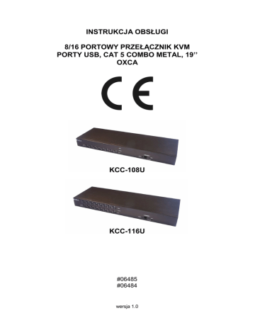 INSTRUKCJA OBSŁUGI 8/16 PORTOWY PRZEŁĄCZNIK KVM PORTY USB, CAT 5 COMBO METAL, 19’’ OXCA KCC-108U KCC-116U #06485 #06484 wersja 1.0 Wstęp Przełącznik KVM umoŜliwia dostęp lokalny lub zdalny do 8/16 komputerów z jednej konsoli sterującej. Do konfiguracji nie są wymagane dodatkowe urządzenia ani oprogramowanie. Obsługa urządzenia moŜliwa jest poprzez uŜycie skrótów klawiaturowych, przycisków na panelu przednim urządzenia oraz menu OSD. Oświadczenie dotyczące zakłóceń KVM został przetestowany pod kątem wymagań stawianych urządzeniom generującym zakłócenia elektromagnetyczne. Stwierdzono, Ŝe emisja pola elektromagnetycznego przez przełącznik nie przekracza poziomów zawartych w normach. Instalacja i eksploatacja niezgodna z zaleceniami znajdującymi się w tej instrukcji, moŜe zakłócić komunikację w otoczeniu urządzenia. Bezpieczeństwo uŜytkowania Urządzenie zostało zaprojektowane i wyprodukowane z najwyŜszą starannością o bezpieczeństwo osób instalujących i uŜytkujących. Dla zapewnienia bezpieczeństwa pracy, naleŜy stosować się do wszelkich wskazań zawartych w tej instrukcji jak i instrukcjach obsługi urządzeń towarzyszących (np. komputera PC). 1. Zawartość opakowania - przełącznik KVM KCC-108U / KCC-116U, - kabel zasilający, - śrubki (4 duŜe, 8 małych), - uchwyty montaŜowe, - przyłącze RJ-45, - przyłącze do konsoli lokalnej, - angielska wersja instrukcji obsługi, - niniejsza instrukcja obsługi. Podczas dostawy naleŜy upewnić się, Ŝe opakowanie nie jest uszkodzone. W przypadku stwierdzonych uszkodzeń naleŜy niezwłocznie skontaktować się z dostawcą. Prosimy równieŜ o sprawdzenie zgodności zawartości opakowania z powyŜej zamieszczoną listą. 2. Zawartość instrukcji Instrukcja ta zawiera opis przełącznika KVM z procedurą instalacji, konfiguracji i uŜytkowania. Przed przystąpieniem do instalacji urządzenia naleŜy dokładnie przeczytać całość tej instrukcji, a w szczególności punkty poświęcone bezpieczeństwu. 3. Zasady bezpieczeństwa Urządzenie jest zgodne z przepisami w zakresie bezpieczeństwa uŜytkowania urządzeń elektrycznych. – gniazdo sieciowe musi być uziemione zgodnie z obowiązującymi przepisami, – przed przeniesieniem lub wykonywaniem innych operacji technicznych urządzenie naleŜy odłączyć od zasilania, – w momencie czyszczenia urządzenia, naleŜy wyłączyć zasilanie. Do czyszczenia nie uŜywać detergentów ciekłych lub w aerozolu, zaleca się uŜywanie wilgotnej tafty. – nie stosować uszkodzonych lub zuŜytych przewodów zasilania, gdyŜ powodują one znaczne zagroŜenie dla bezpieczeństwa uŜytkownika, – prace instalacyjne muszą być wykonywane przez odpowiednio przeszkolony personel techniczny, – nie stosować urządzenia w miejscach występowania substancji łatwopalnych, – zabezpieczyć urządzenie przed dostępem dzieci lub osób niepowołanych, – upewnić się, Ŝe urządzenie zostało odpowiednio zamocowane, 2 – urządzenie traktowane jest jako wyłączone dopiero po odłączeniu przewodów zasilania oraz przewodów łączących je z innymi urządzeniami, – jeśli urządzenie zostanie przeniesione z miejsca chłodnego do ciepłego, w jego wnętrzu moŜe skroplić się para wodna uniemoŜliwiając prawidłowe funkcjonowanie. NaleŜy wówczas odczekać, aŜ wilgoć odparuje. Uwaga: Nie naleŜy dotykać styków gniazd znajdujących się na obudowie urządzenia. Wyładowanie elektrostatyczne moŜe spowodować trwałe uszkodzenie urządzenia. 4. Instalacja sprzętu 4.1 Zasilanie Urządzenie jest zasilane poprzez wewnętrzny zasilacz. Przełącznik naleŜy podłączyć do gniazda źródła zasilania 230V AC 50Hz przy uŜyciu kabla zasilającego. 4.2 Oprogramowanie Dla prawidłowego funkcjonowania urządzenia nie jest wymagane dodatkowe oprogramowanie. 4.3 Środowisko pracy Urządzenie jest przeznaczone do pracy wewnątrz pomieszczeń. NaleŜy zadbać, aby umieszczone było w sposób zapewniający dobry przepływ powietrza i łatwy dostęp do portów. Powietrze powinno być wolne od zanieczyszczeń, a urządzenie nie powinno znajdować się w bezpośredniej bliskości źródeł ciepła (piece, grzejniki, bezpośrednie nasłonecznienie) bądź urządzeń generujących zakłócenia elektromagnetyczne (silniki, telewizory itp.). 4.4 Budowa urządzenia Panel przedni (na przykładzie KCC-116U) : Rys. 1 Panel przedni 1) 2) Dioda ONLINE Dioda SELECTED – świecenie sygnalizuje podłączenie komputera do portu – świecenie diody sygnalizuje podłączone zasilanie do podłączonego komputera 3) Przycisk 1-8/16 – słuŜy do wyboru komputera podłączonego do przełącznika 4) Dioda POWER – świecenie sygnalizuje podłączone zasilanie 5) Dioda LINK – świecenie sygnalizuje podłączenie zdalnej kontroli 6) Dioda CONSOLE – świecenie sygnalizuje wybranie zdalnej konsoli 7) Przycisk konsoli – słuŜy do wyboru między lokalną a zdalną konsolą 8) Port F/W UPGRADE – port słuŜący do aktualizacji oprogramowania przełącznika 9) Przełącznik OFF BOOT – przełącznik pozwalający na restartowanie urządzenia po niepomyślnej aktualizacji oprogramowania (domyślne ustawienie: pozycja OFF) 10) Przycisk RESET – przycisk słuŜący do restartowania urządzenia. 3 Panel tylni Rys. 2 Panel tylni 1) 2) 3) 4) 5) 6) Gniazdo i przełącznik zasilania Port RJ-45 do połączeń kaskadowych/zdalnej konsoli Port VGA HBD-15 Port USB myszy Port USB klawiatury 8/16 poty RJ-45 do podłączenia komputerów 4.5 Instalacja 4.5.1 Instalacja podstawowa Rys. 3 Instalacja podstawowa 4 Przed przystąpieniem do instalacji naleŜy upewnić się, Ŝe wszystkie stacje robocze są wyłączone. Aby poprawie podłączyć urządzenie naleŜy kolejno: − podłączyć monitor, mysz i klawiaturę do portów HDDB15 i USB na tylnym panelu przełącznika KVM (porty do podłączenia konsoli), następnie podłączyć monitor do źródła zasilania, − podłączy