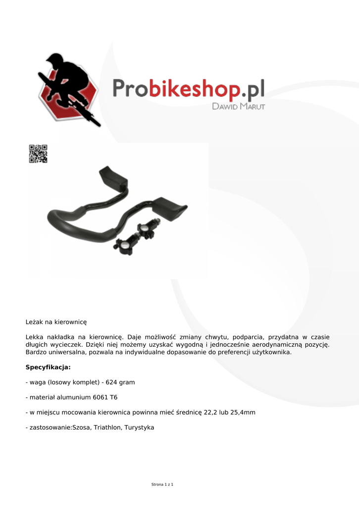 Leżak na kierownicę Lekka nakładka na kierownicę. Daje możliwość zmiany chwytu, podparcia, przydatna w czasie długich wycieczek. Dzięki niej możemy uzyskać wygodną i jednocześnie aerodynamiczną pozycję. Bardzo uniwersalna, pozwala na indywidualne dopasowanie do preferencji użytkownika. Specyfikacja: - waga (losowy komplet) - 624 gram - materiał alumunium 6061 T6 - w miejscu mocowania kierownica powinna mieć średnicę 22,2 lub 25,4mm - zastosowanie:Szosa, Triathlon, Turystyka Strona 1 z 1