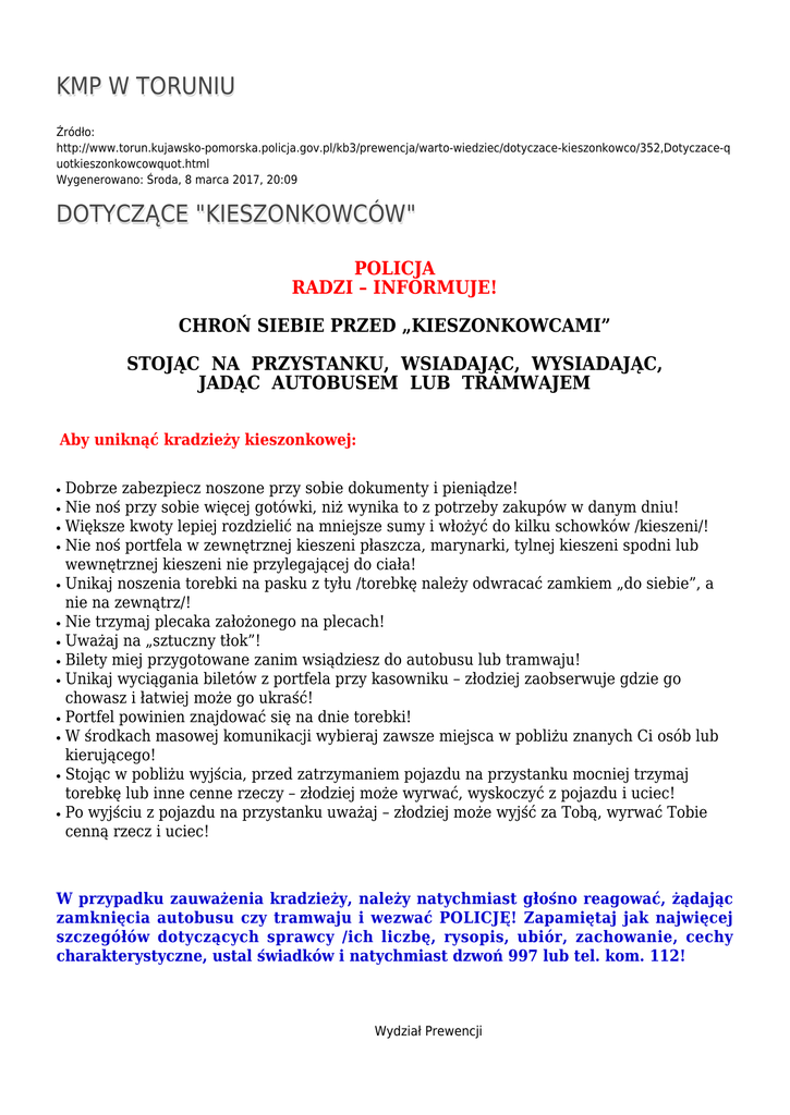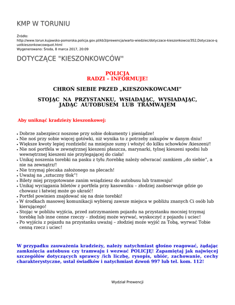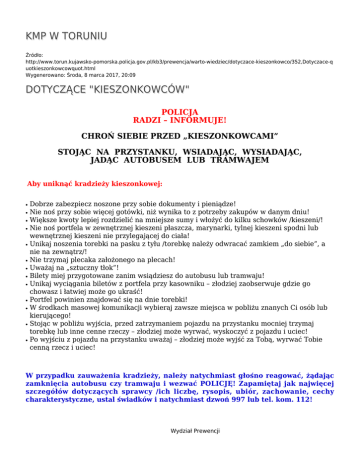 KMP W TORUNIU Źródło: http://www.torun.kujawsko-pomorska.policja.gov.pl/kb3/prewencja/warto-wiedziec/dotyczace-kieszonkowco/352,Dotyczace-q uotkieszonkowcowquot.html Wygenerowano: Środa, 8 marca 2017, 20:09 DOTYCZĄCE "KIESZONKOWCÓW" POLICJA RADZI – INFORMUJE! CHROŃ SIEBIE PRZED „KIESZONKOWCAMI” STOJĄC NA PRZYSTANKU, WSIADAJĄC, WYSIADAJĄC, JADĄC AUTOBUSEM LUB TRAMWAJEM Aby uniknąć kradzieży kieszonkowej: ● ● ● ● ● ● ● ● ● ● ● ● ● Dobrze zabezpiecz noszone przy sobie dokumenty i pieniądze! Nie noś przy sobie więcej gotówki, niż wynika to z potrzeby zakupów w danym dniu! Większe kwoty lepiej rozdzielić na mniejsze sumy i włożyć do kilku schowków /kieszeni/! Nie noś portfela w zewnętrznej kieszeni płaszcza, marynarki, tylnej kieszeni spodni lub wewnętrznej kieszeni nie przylegającej do ciała! Unikaj noszenia torebki na pasku z tyłu /torebkę należy odwracać zamkiem „do siebie”, a nie na zewnątrz/! Nie trzymaj plecaka założonego na plecach! Uważaj na „sztuczny tłok”! Bilety miej przygotowane zanim wsiądziesz do autobusu lub tramwaju! Unikaj wyciągania biletów z portfela przy kasowniku – złodziej zaobserwuje gdzie go chowasz i łatwiej może go ukraść! Portfel powinien znajdować się na dnie torebki! W środkach masowej komunikacji wybieraj zawsze miejsca w pobliżu znanych Ci osób lub kierującego! Stojąc w pobliżu wyjścia, przed zatrzymaniem pojazdu na przystanku mocniej trzymaj torebkę lub inne cenne rzeczy – złodziej może wyrwać, wyskoczyć z pojazdu i uciec! Po wyjściu z pojazdu na przystanku uważaj – złodziej może wyjść za Tobą, wyrwać Tobie cenną rzecz i uciec! W przypadku zauważenia kradzieży, należy natychmiast głośno reagować, żądając zamknięcia autobusu czy tramwaju i wezwać POLICJĘ! Zapamiętaj jak najwięcej szczegółów dotyczących sprawcy /ich liczbę, rysopis, ubiór, zachowanie, cechy charakterystyczne, ustal świadków i natychmiast dzwoń 997 lub tel. kom. 112! Wydział Prewencji Komendy Miejskiej Policji w Toruniu Autor: Publikacja: Ocena: 0/5 (0) Tweetnij