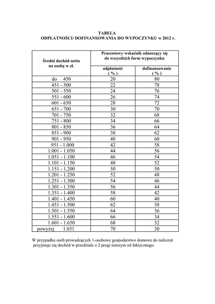 TABELA ODPŁATNOŚCI/ DOFINANSOWANIA DO WYPOCZYNKU w 2012 r. Średni dochód netto na osobę w zł. do 450 451 - 500 501 - 550 551 - 600 601 - 650 651 - 700 701 - 750 751 - 800 801 - 850 851 - 900 901 - 950 951 - 1.000 1.001 - 1.050 1.051 - 1.100 1.101 - 1.150 1.151 - 1.200 1.201 - 1.250 1.251 - 1.300 1.301 - 1.350 1.351 - 1.400 1.401 - 1.450 1.451 - 1.500 1.501 - 1.550 1.551 - 1.600 1.601 - 1.650 powyżej 1.651 Procentowy wskaźnik odnoszący się do wszystkich form wypoczynku odpłatność (%) dofinansowanie (%) 20 22 24 26 28 30 32 34 36 38 40 42 44 46 48 50 52 54 56 58 60 62 64 66 68 70 80 78 76 74 72 70 68 66 64 62 60 58 56 54 52 50 48 46 44 42 40 38 36 34 32 30 W przypadku osób prowadzących 1-osobowe gospodarstwo domowe do naliczeń przyjmuje się dochód w przedziale o 2 progi niższym od faktycznego.