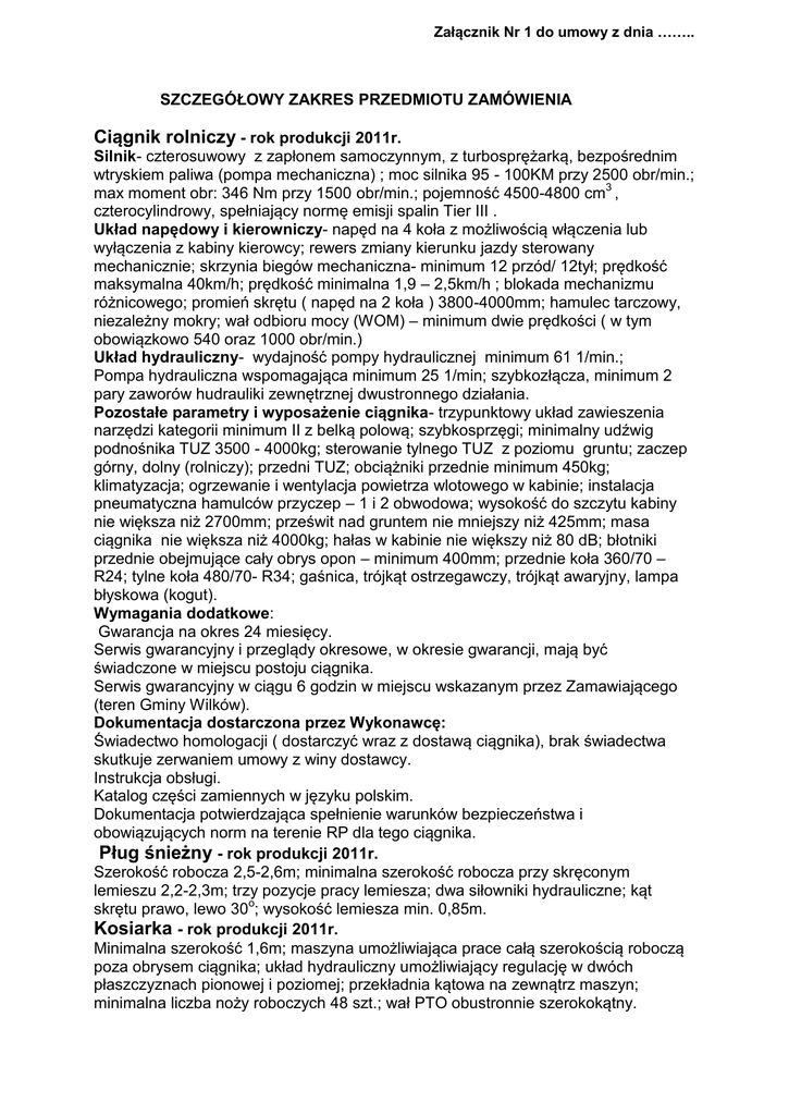 Załącznik Nr 1 do umowy z dnia …….. SZCZEGÓŁOWY ZAKRES PRZEDMIOTU ZAMÓWIENIA Ciągnik rolniczy - rok produkcji 2011r. Silnik- czterosuwowy z zapłonem samoczynnym, z turbosprężarką, bezpośrednim wtryskiem paliwa (pompa mechaniczna) ; moc silnika 95 - 100KM przy 2500 obr/min.; max moment obr: 346 Nm przy 1500 obr/min.; pojemność 4500-4800 cm3 , czterocylindrowy, spełniający normę emisji spalin Tier III . Układ napędowy i kierowniczy- napęd na 4 koła z możliwością włączenia lub wyłączenia z kabiny kierowcy; rewers zmiany kierunku jazdy sterowany mechanicznie; skrzynia biegów mechaniczna- minimum 12 przód/ 12tył; prędkość maksymalna 40km/h; prędkość minimalna 1,9 – 2,5km/h ; blokada mechanizmu różnicowego; promień skrętu ( napęd na 2 koła ) 3800-4000mm; hamulec tarczowy, niezależny mokry; wał odbioru mocy (WOM) – minimum dwie prędkości ( w tym obowiązkowo 540 oraz 1000 obr/min.) Układ hydrauliczny- wydajność pompy hydraulicznej minimum 61 1/min.; Pompa hydrauliczna wspomagająca minimum 25 1/min; szybkozłącza, minimum 2 pary zaworów hudrauliki zewnętrznej dwustronnego działania. Pozostałe parametry i wyposażenie ciągnika- trzypunktowy układ zawieszenia narzędzi kategorii minimum II z belką polową; szybkosprzęgi; minimalny udźwig podnośnika TUZ 3500 - 4000kg; sterowanie tylnego TUZ z poziomu gruntu; zaczep górny, dolny (rolniczy); przedni TUZ; obciążniki przednie minimum 450kg; klimatyzacja; ogrzewanie i wentylacja powietrza wlotowego w kabinie; instalacja pneumatyczna hamulców przyczep – 1 i 2 obwodowa; wysokość do szczytu kabiny nie większa niż 2700mm; prześwit nad gruntem nie mniejszy niż 425mm; masa ciągnika nie większa niż 4000kg; hałas w kabinie nie większy niż 80 dB; błotniki przednie obejmujące cały obrys opon – minimum 400mm; przednie koła 360/70 – R24; tylne koła 480/70- R34; gaśnica, trójkąt ostrzegawczy, trójkąt awaryjny, lampa błyskowa (kogut). Wymagania dodatkowe: Gwarancja na okres 24 miesięcy. Serwis gwarancyjny i przeglądy okresowe, w okresie gwarancji, mają być świadczone w miejscu postoju ciągnika. Serwis gwarancyjny w ciągu 6 godzin w miejscu wskazanym przez Zamawiającego (teren Gminy Wilków). Dokumentacja dostarczona przez Wykonawcę: Świadectwo homologacji ( dostarczyć wraz z dostawą ciągnika), brak świadectwa skutkuje zerwaniem umowy z winy dostawcy. Instrukcja obsługi. Katalog części zamiennych w języku polskim. Dokumentacja potwierdzająca spełnienie warunków bezpieczeństwa i obowiązujących norm na terenie RP dla tego ciągnika. Pług śnieżny - rok produkcji 2011r. Szerokość robocza 2,5-2,6m; minimalna szerokość robocza przy skręconym lemieszu 2,2-2,3m; trzy pozycje pracy lemiesza; dwa siłowniki hydrauliczne; kąt skrętu prawo, lewo 30o; wysokość lemiesza min. 0,85m. Kosiarka - rok produkcji 2011r. Minimalna szerokość 1,6m; maszyna umożliwiająca prace całą szerokością roboczą poza obrysem ciągnika; układ hydrauliczny umożliwiający regulację w dwóch płaszczyznach pionowej i poziomej; przekładnia kątowa na zewnątrz maszyn; minimalna liczba noży roboczych 48 szt.; wał PTO obustronnie szerokokątny. Przyczepa - rok produkcji 2011r. Przyczepa jednoosiowa; trójstronny wywrót; minimalna ładowność 3500kg; centralny system ryglowania burt; okno zsypowe w tylnej ścianie; minimalna pojemność ładunkowa 6,1m3; masa własna nie większa niż 1500kg; wysokość platformy od podłoża nie większa niż 1,03m. Realizacja przedmiotu zamówienia będzie jednorazowa. Wykonawca przeszkoli pracownika Zamawiającego w zakresie obsługi dostarczanego sprzętu. Dostarczenie sprzętu do siedziby Zamawiającego.