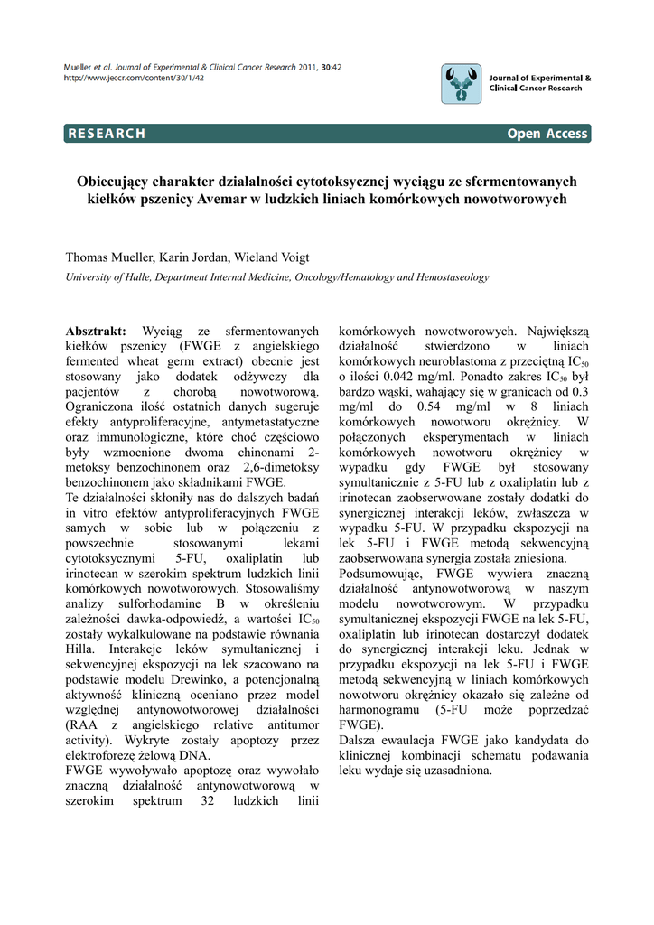 Obiecujący charakter działalności cytotoksycznej wyciągu ze sfermentowanych kiełków pszenicy Avemar w ludzkich liniach komórkowych nowotworowych Thomas Mueller, Karin Jordan, Wieland Voigt University of Halle, Department Internal Medicine, Oncology/Hematology and Hemostaseology Absztrakt: Wyciąg ze sfermentowanych kiełków pszenicy (FWGE z angielskiego fermented wheat germ extract) obecnie jest stosowany jako dodatek odżywczy dla pacjentów z chorobą nowotworową. Ograniczona ilość ostatnich danych sugeruje efekty antyproliferacyjne, antymetastatyczne oraz immunologiczne, które choć częściowo były wzmocnione dwoma chinonami 2metoksy benzochinonem oraz 2,6-dimetoksy benzochinonem jako składnikami FWGE. Te działalności skłoniły nas do dalszych badań in vitro efektów antyproliferacyjnych FWGE samych w sobie lub w połączeniu z powszechnie stosowanymi lekami cytotoksycznymi 5-FU, oxaliplatin lub irinotecan w szerokim spektrum ludzkich linii komórkowych nowotworowych. Stosowaliśmy analizy sulforhodamine B w określeniu zależności dawka-odpowiedź, a wartości IC50 zostały wykalkulowane na podstawie równania Hilla. Interakcje leków symultanicznej i sekwencyjnej ekspozycji na lek szacowano na podstawie modelu Drewinko, a potencjonalną aktywność kliniczną oceniano przez model względnej antynowotworowej działalności (RAA z angielskiego relative antitumor activity). Wykryte zostały apoptozy przez elektroforezę żelową DNA. FWGE wywoływało apoptozę oraz wywołało znaczną działalność antynowotworową w szerokim spektrum 32 ludzkich linii komórkowych nowotworowych. Największą działalność stwierdzono w liniach komórkowych neuroblastoma z przeciętną IC50 o ilości 0.042 mg/ml. Ponadto zakres IC50 był bardzo wąski, wahający się w granicach od 0.3 mg/ml do 0.54 mg/ml w 8 liniach komórkowych nowotworu okrężnicy. W połączonych eksperymentach w liniach komórkowych nowotworu okrężnicy w wypadku gdy FWGE był stosowany symultanicznie z 5-FU lub z oxaliplatin lub z irinotecan zaobserwowane zostały dodatki do synergicznej interakcji leków, zwłaszcza w wypadku 5-FU. W przypadku ekspozycji na lek 5-FU i FWGE metodą sekwencyjną zaobserwowana synergia została zniesiona. Podsumowując, FWGE wywiera znaczną działalność antynowotworową w naszym modelu nowotworowym. W przypadku symultanicznej ekspozycji FWGE na lek 5-FU, oxaliplatin lub irinotecan dostarczył dodatek do synergicznej interakcji leku. Jednak w przypadku ekspozycji na lek 5-FU i FWGE metodą sekwencyjną w liniach komórkowych nowotworu okrężnicy okazało się zależne od harmonogramu (5-FU może poprzedzać FWGE). Dalsza ewaulacja FWGE jako kandydata do klinicznej kombinacji schematu podawania leku wydaje się uzasadniona.