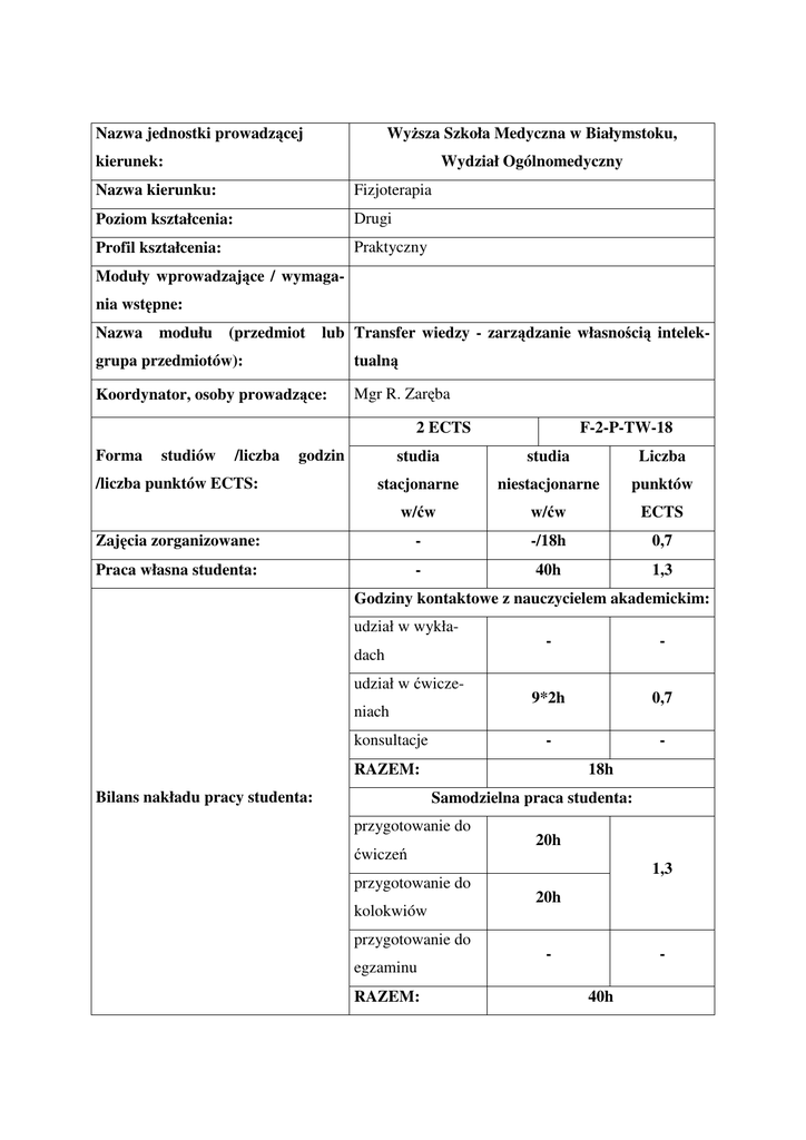 Nazwa jednostki prowadzącej Wyższa Szkoła Medyczna w Białymstoku, kierunek: Wydział Ogólnomedyczny Nazwa kierunku: Fizjoterapia Poziom kształcenia: Drugi Profil kształcenia: Praktyczny Moduły wprowadzające / wymagania wstępne: Nazwa modułu (przedmiot lub Transfer wiedzy - zarządzanie własnością intelek- grupa przedmiotów): tualną Koordynator, osoby prowadzące: Mgr R. Zaręba 2 ECTS Forma studiów /liczba godzin F-2-P-TW-18 studia studia Liczba stacjonarne niestacjonarne punktów w/ćw w/ćw ECTS Zajęcia zorganizowane: - -/18h 0,7 Praca własna studenta: - 40h 1,3 /liczba punktów ECTS: Godziny kontaktowe z nauczycielem akademickim: udział w wykładach udział w ćwiczeniach konsultacje - - 9*2h 0,7 - - RAZEM: Bilans nakładu pracy studenta: 18h Samodzielna praca studenta: przygotowanie do 20h ćwiczeń przygotowanie do kolokwiów przygotowanie do egzaminu RAZEM: 1,3 20h - 40h Cele modułu: Student nabędzie wiedzę z zakresu Kodeksu postępowania dla uczelni wyższych - zalecenia Komisji UE oraz Ministerstwa Nauki i Szkolnictwa Wyższego w sprawie zarządzania własnością intelektualną w ramach działań związanych z transferem wiedzy Efekty kształcenia: Odniesienie do Przedmiotowy kierunkowych Efekty kształcenia efekt kształcenia efektów kształcenia P_W01 ma wiedzę z zakresu zarządzania własnością intelektu- K2_W38 alną, przepisów prawnych związanych z własnością intelektualną P_U01 analizuje zagadnienia związane z transferem wiedzy P_U02 wykorzystuje techniki informatyczne K2_U24 przydatne K2_U24 w transferze wiedzy, sporządza projekt umowy przenoszącej prawa autorskie majątkowe P_K01 współpracuje w grupie i krytycznie ocenia podejmowa- K2_K04 ne działania, stosuje przepisy prawa zgodnie z zasadami K2_K05 etyki K2_K06 Wiedza – student: • ma wiedzę z zakresu zarządzania własnością intelektualną, przepisów prawnych związanych z własnością intelektualną Umiejętności – student: • analizuje zagadnienia związane z transferem wiedzy, • wykorzystuje techniki informatyczne przydatne w transferze wiedzy, sporządza projekt umowy przenoszącej prawa autorskie majątkowe Kompetencje społeczne – student: • współpracuje w grupie i krytycznie ocenia podejmowane działania, stosuje przepisy prawa zgodnie z zasadami etyki Forma zajęć/metody dydaktyczne: Prezentacje multimedialne, ćwiczenia, praca w grupie Forma i warunki zaliczenia przedmiotu w odniesieniu do efektów kształcenia. Nr efektu Metody weryfikacji efektu kształcenia kształcenia Formujące: P_W01 Podsumowujące: Kolokwium teoretyczne ocena w sys- Zaliczenie pisemne – student generuje / temie punktowym rozpoznaje odpowiedź (esej, raport; krótkie strukturyzowane pytania /SSQ/; test wielokrotnego wyboru /MCQ/; test wielokrotnej odpowiedzi /MRQ/; test dopasowania; test T/N; test uzupełniania odpowiedzi) P_U01 Ocena przygotowania do zajęć Projekt, prezentacja P_U02 P_K01 Ocena aktywności studenta w czasie Przedłużona obserwacja przez opiekuzajęć na / nauczyciela prowadzącego Ocena 360° (opinie nauczycieli, kolegów/koleżanek, pacjentów, innych współpracowników) Treści programowe: Ćwiczenia: 18 godzin 1. Przyjęcie transferu wiedzy jako misji we wszystkich organizacjach badawczych, w tym wyższych uczelniach. 3h 2. Strategie polityczne i procedury zarządzania własnością intelektualną zgodnie z Kodeksem praktyk „Kodeks postępowania dla uczelni wyższych i innych publicznych instytucji badawczych dotyczących zarządzania własnością intelektualną w ramach działań związanych z transferem wiedzy” Dz. U. Unii Europejskiej 5.6.2008. 3h 3. Podejmowanie działań zmierzających do zwiększenia świadomości i umiejętności studentów – zwłaszcza w dziedzinie nauki i techniki – w zakresie działalności intelektualnej, transferu wiedzy i przedsiębiorczości – na przykładzie działań w Polsce (Wrocław, Poznań), Finlandii i na Litwie. 3h 4. Trans graniczna współpraca a transfer wiedzy – procedury transferu technologii. 3h 5. Systemy archiwizacji baz danych (w tym internetowe bazy danych). 2h 6. Modele współpracy - Parki Technologiczne i Centra Transferu Technologii. 2h 7. Umowa o prawach autorskich i prawach pokrewnych (autorskie prawa majątkowe, autorskie prawa osobiste). 2h Literatura podstawowa: Prezentacje multimedialne: 1. Wrocławski Park Technologiczny S.A. oraz Wrocławskie Centrum Transferu Technologii. 2. Poznański Park Naukowo-Technologiczny oraz Centrum Transferu Technologii przy PPNT. 3. North – Town Technology Park and Lithuanian Innovation Centre (LIC). 4. Stowarzyszenie Zbiorowego Zarządzania Prawami Autorskimi Twórców Dzieł Naukowych i technicznych (Obwieszczenie Ministra Kultury z dnia 13 kwietnia 2004r. Monitor polski nr. 18 poz. 322. 5. Zarządzanie własnością intelektualną w dziedzinie transferu wiedzy oraz Kodeks postępowania dla uczelni wyższych i innych publicznych organizacji badawczych 18 września 2009 r. Komisja Europejska przyjęła Zalecenia w sprawie zarządzania własnością intelektualną w ramach działań związanych z transferem wiedzy oraz towarzyszący im Kodeks postępowania dla uczelni wyższych i innych publicznych organizacji badawczych. Dokument opublikowany w Dzienniku Urzędowym UE Seria L Nr 146 Tom 51 z dnia 5 czerwca 2008 r. dostępny w języku polskim pod adresem: http://eur-lex.europa.eu/LexUriServ Literatura uzupełniająca: 1. Wybrane artkuły Program opracował/a, data opracowania programu