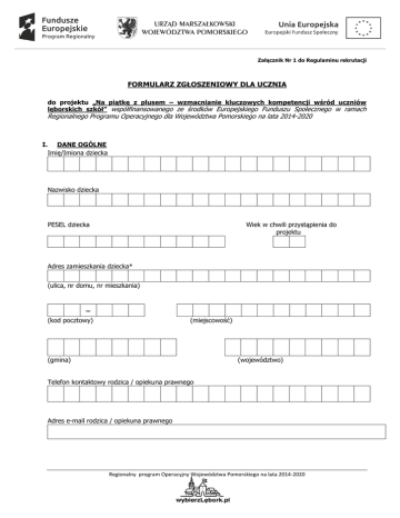 Załącznik Nr 1 do Regulaminu rekrutacji FORMULARZ ZGŁOSZENIOWY DLA UCZNIA do projektu „Na piątkę z plusem – wzmacnianie kluczowych kompetencji wśród uczniów lęborskich szkół” współfinansowanego ze środków Europejskiego Funduszu Społecznego w ramach Regionalnego Programu Operacyjnego dla Województwa Pomorskiego na lata 2014-2020 I. DANE OGÓLNE Imię/Imiona dziecka Nazwisko dziecka PESEL dziecka Wiek w chwili przystąpienia do projektu Adres zamieszkania dziecka* (ulica, nr domu, nr mieszkania) _ (kod pocztowy) (miejscowość) (gmina) (województwo) Telefon kontaktowy rodzica / opiekuna prawnego Adres e-mail rodzica / opiekuna prawnego Regionalny program Operacyjny Województwa Pomorskiego na lata 2014-2020 Formy wsparcia dla szkół podstawowych Nazwa zajęć Rozwijane kompetencje Zajęcia z zastosowaniem programu edukacyjnego dla klas I-VI z platformą e-learningową wsparte pokazami naukowymi Wstaw znak „X” jeśli wybierasz tę formę wsparcia Kompetencje kluczowe niezbędne na rynku pracy: - kompetencje matematyczne i podstawowe kompetencje naukowotechniczne - kompetencje uczenia się - kompetencje społeczne Ocena predyspozycji i potrzeb rozwojowych Punkty(wypełnia koordynator szkolny) wysoka przydatność - 4 pkt., umiarkowana przydatność - 2 pkt., niska przydatność – 0 pkt. …………………….pkt. Posiadane kompetencje(wypełnia koordynator szkolny) niski poziom -2 pkt., średni poziom – 1 pkt., wysoki poziom – 0 pkt. …………………pkt. Suma punktów ……………………….. Zajęcia języka angielskiego wraz z platformą e-learningową Kompetencje kluczowe niezbędne na rynku pracy: - kompetencje językowe (porozumiewanie się w językach obcych) – j. angielski Ocena predyspozycji i potrzeb rozwojowych Punkty(wypełnia koordynator szkolny) wysoka przydatność - 4 pkt., umiarkowana przydatność - 2 pkt., niska przydatność – 0 pkt. …………………….pkt. Posiadane kompetencje(wypełnia koordynator szkolny) niski poziom -2 pkt., średni poziom – 1 pkt., wysoki poziom – 0 pkt. …………………pkt. Suma punktów ……………………….. Formy wsparcia dla gimnazjów Nazwa zajęć Rozwijane kompetencje Zajęcia z zastosowaniem programu ogólnorozwojowego dla klas I-III Gimnazjum wraz z platformą e-learningową Wstaw znak „X” jeśli wybierasz tę formę wsparcia Kompetencje kluczowe niezbędne na rynku pracy: - kompetencje matematyczne i podstawowe kompetencje naukowo-techniczne - kompetencje uczenia się Ocena predyspozycji i potrzeb rozwojowych Punkty(wypełnia koordynator szkolny) wysoka przydatność - 4 pkt., umiarkowana przydatność - 2 pkt., niska przydatność – 0 pkt. …………………….pkt. Regionalny program Operacyjny Województwa Pomorskiego na lata 2014-2020 Posiadane kompetencje(wypełnia koordynator szkolny) niski poziom -2 pkt., średni poziom – 1 pkt., wysoki poziom – 0 pkt. …………………pkt. Suma punktów ……………………….. Zajęcia z zastosowaniem programu edukacyjnego dla klas I-III Gim. Kompetencje kluczowe niezbędne na rynku pracy: - kompetencje społeczne Ocena predyspozycji i potrzeb rozwojowych Punkty(wypełnia koordynator szkolny) wysoka przydatność - 4 pkt., umiarkowana przydatność - 2 pkt., niska przydatność – 0 pkt. …………………….pkt. Posiadane kompetencje(wypełnia koordynator szkolny) niski poziom -2 pkt., średni poziom – 1 pkt., wysoki poziom – 0 pkt. …………………pkt. Suma punktów ……………………….. Zajęcia języka angielskiego wraz z platformą e-learningową Kompetencje kluczowe niezbędne na rynku pracy: - kompetencje językowe (porozumiewanie się w językach obcych) – j. angielski Ocena predyspozycji i potrzeb rozwojowych Punkty(wypełnia koordynator szkolny) wysoka przydatność - 4 pkt., umiarkowana przydatność - 2 pkt., niska przydatność – 0 pkt. …………………….pkt. Posiadane kompetencje(wypełnia koordynator szkolny) Niski poziom -2 pkt., średni poziom – 1 pkt., wysoki poziom – 0 pkt. …………………pkt. Suma punktów ……………………….. Doradztwo edukacyjno – zawodowe Kompetencje kluczowe niezbędne na rynku pracy: - inicjatywność i przedsiębiorczość Ocena predyspozycji i potrzeb rozwojowych Punkty(wypełnia koordynator szkolny) wysoka przydatność - 4 pkt., umiarkowana przydatność - 2 pkt., niska przydatność – 0 pkt. …………………….pkt. Posiadane kompetencje(wypełnia koordynator szkolny) Niski poziom -2 pkt., średni poziom – 1 pkt., wysoki poziom – 0 pkt. …………………pkt. Suma punktów ……………………….. Ocena motywacji do uczestnictwa w danej formie wsparcia Wypełnia uczeń lub rodzic/opiekun prawny w przypadku niepełnoletniego ucznia. Pole nieobowiązkowe – uczeń może, ale nie musi wypełniać pola dot. uzasadnienia chęci/niezbędności kształtowania i rozwijania kompetencji kluczowych niezbędnych na rynku pracy i udziału w konkretnych zajęciach. Regionalny program Operacyjny Województwa Pomorskiego na lata 2014-2020 …………………………………………………………………………………………………………………………………………………… …………………………………………………………………………………………………………………………………………………… …………………………………………………………………………………………………………………………………………………… …………………………………………………………………………………………………………………………………………………… …………………………………………………………………………………………………………………………………………………… …………………………