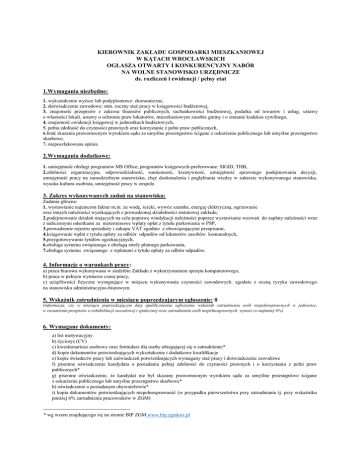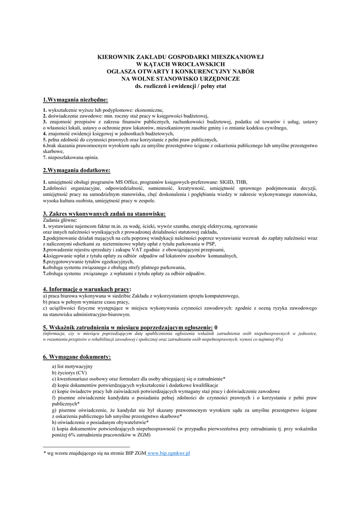KIEROWNIK ZAKŁADU GOSPODARKI MIESZKANIOWEJ W KĄTACH WROCŁAWSKICH OGŁASZA OTWARTY I KONKURENCYJNY NABÓR NA WOLNE STANOWISKO URZĘDNICZE ds. rozliczeń i ewidencji / pełny etat 1.Wymagania niezbędne: 1. wykształcenie wyższe lub podyplomowe: ekonomiczne, 2. doświadczenie zawodowe: min. roczny staż pracy w księgowości budżetowej, 3. znajomość przepisów z zakresu finansów publicznych, rachunkowości budżetowej, podatku od towarów i usług, ustawy o własności lokali, ustawy o ochronie praw lokatorów, mieszkaniowym zasobie gminy i o zmianie kodeksu cywilnego, 4. znajomość ewidencji księgowej w jednostkach budżetowych, 5. pełna zdolność do czynności prawnych oraz korzystanie z pełni praw publicznych, 6.brak skazania prawomocnym wyrokiem sądu za umyślne przestępstwo ścigane z oskarżenia publicznego lub umyślne przestępstwo skarbowe, 7. nieposzlakowana opinia. 2.Wymagania dodatkowe: 1. umiejętność obsługi programów MS Office, programów księgowych-preferowane: SIGID, THB, 2.zdolności organizacyjne, odpowiedzialność, sumienność, kreatywność, umiejętność sprawnego podejmowania decyzji, umiejętność pracy na samodzielnym stanowisku, chęć doskonalenia i pogłębiania wiedzy w zakresie wykonywanego stanowiska, wysoka kultura osobista, umiejętność pracy w zespole. 3. Zakres wykonywanych zadań na stanowisku: Zadania główne: 1. wystawianie najemcom faktur m.in. za wodę, ścieki, wywóz szamba, energię elektryczną, ogrzewanie oraz innych należności wynikających z prowadzonej działalności statutowej zakładu, 2.podejmowanie działań mających na celu poprawę windykacji należności poprzez wystawianie wezwań do zapłaty należności wraz z naliczonymi odsetkami za nieterminowe wpłaty opłat z tytułu parkowania w PSP, 3.prowadzenie rejestru sprzedaży i zakupu VAT zgodnie z obowiązującymi przepisami, 4.księgowanie wpłat z tytułu opłaty za odbiór odpadów od lokatorów zasobów komunalnych, 5.przygotowywanie tytułów egzekucyjnych, 6.obsługa systemu związanego z obsługą strefy płatnego parkowania, 7.obsługa systemu związanego z wpłatami z tytułu opłaty za odbiór odpadów. 4. Informacje o warunkach pracy: a) praca biurowa wykonywana w siedzibie Zakładu z wykorzystaniem sprzętu komputerowego, b) praca w pełnym wymiarze czasu pracy, c) uciążliwości fizyczne występujące w miejscu wykonywania czynności zawodowych: zgodnie z oceną ryzyka zawodowego na stanowisku administracyjno-biurowym. 5. Wskaźnik zatrudnienia w miesiącu poprzedzającym ogłoszenie: 0 (informacja, czy w miesiącu poprzedzającym datę upublicznienia ogłoszenia wskaźnik zatrudnienia osób niepełnosprawnych w jednostce, w rozumieniu przepisów o rehabilitacji zawodowej i społecznej oraz zatrudnianiu osób niepełnosprawnych, wynosi co najmniej 6%) 6. Wymagane dokumenty: a) list motywacyjny b) życiorys (CV) c) kwestionariusz osobowy oraz formularz dla osoby ubiegającej się o zatrudnienie* d) kopie dokumentów potwierdzających wykształcenie i dodatkowe kwalifikacje e) kopie świadectw pracy lub zaświadczeń potwierdzających wymagany staż pracy i doświadczenie zawodowe f) pisemne oświadczenie kandydata o posiadaniu pełnej zdolności do czynności prawnych i o korzystaniu z pełni praw publicznych* g) pisemne oświadczenie, że kandydat nie był skazany prawomocnym wyrokiem sądu za umyślne przestępstwo ścigane z oskarżenia publicznego lub umyślne przestępstwo skarbowe* h) oświadczenie o posiadanym obywatelstwie* i) kopia dokumentów potwierdzających niepełnosprawność (w przypadku pierwszeństwa przy zatrudnianiu tj. przy wskaźniku poniżej 6% zatrudnienia pracowników w ZGM) * wg wzoru znajdującego się na stronie BIP ZGM www.bip.zgmkwr.pl Wymagane dokumenty aplikacyjne należy składać osobiście w siedzibie Zakładu Gospodarki Mieszkaniowej w Kątach Wrocławskich przy ul. Kościuszki 16a lub pocztą elektroniczną na adres [email protected] w przypadku posiadanych uprawnień do podpisu elektronicznego lub pocztą na adres Zakładu Gospodarki Mieszkaniowej w Kątach Wrocławskich z dopiskiem: Dotyczy naboru na stanowisko ds. rozliczeń i ewidencji w terminie do dnia 08.12.2016r. do godz. 15.00 Aplikacje, które wpłyną po wyżej określonym terminie nie będą rozpatrywane. Informacja o terminie i miejscu postępowania rekrutacyjnego zostanie przekazana pisemnie lub telefonicznie. Wymagane dokumenty aplikacyjne - list motywacyjny, CV - powinny być opatrzone klauzulą: Wyrażam zgodę na przetwarzanie danych osobowych zawartych w ofercie pracy dla potrzeb niezbędnych do realizacji procesu rekrutacji zgodnie z ustawą z dnia 29 sierpnia 1997r. o ochronie danych osobowych (Dz.U. 2015r. poz. 2135). Informacja o wynikach naboru będzie umieszczona na stronie internetowej Biuletynu Informacji Publicznej www.bip.zgmkwr.pl oraz na tablicy informacyjnej Zakładu Gospodarki Mieszkaniowej w Kątach Wrocławskich.