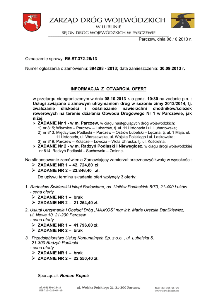 Parczew, dnia 08.10.2013 r. Oznaczenie sprawy: R5.ST.372-26/13 Numer ogłoszenia o zamówieniu: 394298 - 2013; data zamieszczenia: 30.09.2013 r. INFORMACJA Z OTWARCIA OFERT w przetargu nieograniczonym w dniu 08.10.2013 r. o godz. 10:30 na zadanie p.n. : Usługi związane z zimowym utrzymaniem dróg w sezonie zimy 2013/2014, tj. zwalczanie śliskości i odśnieżanie nawierzchni chodników/ścieżek rowerowych na terenie działania Obwodu Drogowego Nr 1 w Parczewie, jak niżej: Ø ZADANIE Nr 1 - w m. Parczew, w ciągu następujących dróg wojewódzkich: 1) nr 815; Wisznice – Parczew – Lubartów, tj. ul. 11 Listopada i ul. Lubartowska; 2) nr 813; Międzyrzec Podlaski – Parczew – Ostrów Lubelski – Łęczna, tj. ul. 1 Maja, ul. 11 Listopada, ul. Warszawska, ul. Wojska Polskiego i ul. Laskowska; 3) nr 819; Parczew – Kołacze – Łowcza – Wola Uhruska, tj. ul. Kościelna, Ø ZADANIE Nr 2 - w m. Radzyń Podlaski i Niewęgłosz, w ciągu drogi wojewódzkiej nr 814; Radzyń Podlaski – Suchowola – Żminne. Na sfinansowanie zamówienia Zamawiający zamierzał przeznaczyć kwotę w wysokości: Ø ZADANIE NR 1 – 42. 724,80 zł. Ø ZADANIE NR 2 – 23.846,40 zł. Do upływu terminu składania ofert wpłynęły 3 oferty: 1. Radosław Świderski-Usługi Budowlane, os. Unitów Podlaskich 8/70, 21-400 Łuków - cena oferty Ø ZADANIE NR 1 – brak Ø ZADANIE NR 2 – 21.254,40 zł. 2. Usługi Utrzymania i Obsługi Dróg „MAJKOŚ” mgr inż. Maria Urszula Danilkiewicz, ul. Nowa 10, 21-200 Parczew - cena oferty Ø ZADANIE NR 1 – 41.796,00 zł. Ø ZADANIE NR 2 – brak 3. Przedsiębiorstwo Usług Komunalnych Sp. z o.o. , ul. Lubelska 5, 21-300 Radzyń Podlaski - cena oferty Ø ZADANIE NR 1 – brak Ø ZADANIE NR 2 – 22.550,40 zł. Sporządził: Roman Kopeć
