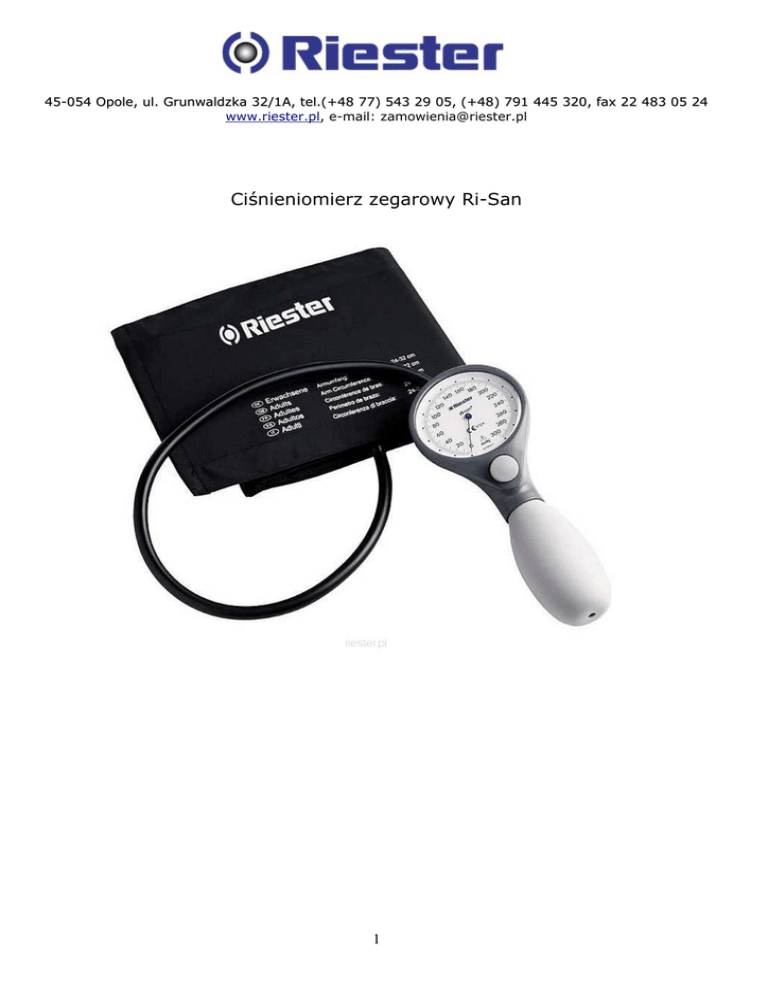 45-054 Opole, ul. Grunwaldzka 32/1A, tel.(+48 77) 543 29 05, (+48) 791 445 320, fax 22 483 05 24 www.riester.pl, e-mail: [email protected] Ciśnieniomierz zegarowy Ri-San 1 Nowoczesny ciśnieniomierz zegarowy z ergonomicznym systemem spustowym. Zawór spustowy w postaci przycisku umieszczony pośrodku, wygodnie regulowany za pomocą palca, umożliwia obsługę przez osoby prawo i leworęczne. Opcjonalnie dostępny w wersji bez-lateksowej. Jednoprzewodowy ciśnieniomierz zegarowy z wyraźnie znakowaną skalą, przewód łączący z mankietem podłączony osiowo na górnej części ciśnieniomierza, wygodny w użytku dla osób prawo jak i leworęcznych, ergonomiczny zawór spustowy i system pomiarowy z zabezpieczeniem anty kurzowym w postaci mikrofiltrów, specjalnie utwardzana berylem i miedzią membrana, wytrzymałość membrany testowana do 600 mm Hg, maksymalny błąd pomiarowy +/- 3 mm Hg, Łatwa do odczytania skala liniowa Ø 64 mm, znakowana do 300 mm Hg, z podziałką co 2 mm, bez konieczności zerowania wskazówki, dostępny w czterech wersjach kolorystycznych z szeroką gamą mankietów, całość w winylowym etui. Do ciśnieniomierza pasują poniższe mankiety: Nazwa mankietu Rozmiar mankietu (dł. x szer.) Obwód ręki Mankiet zawijany 40 x 15 cm 24 - 32 cm Mankiet na zaczepy 58 x 16 cm 24 - 32 cm Mankiet na rzepy dla dorosłych 54,5 x 14,5 cm 24 - 32 cm Mankiet na rzepy dla dorosłych mały 42 x 13 cm 17 - 26 cm Mankiet na rzepy dla dorosłych duży 58,5 x 18,5 cm 32 - 42 cm Mankiet na rzepy dla dorosłych na udo 70 x 22 cm 42 - 50 cm Mankiety na rzepy dla dorosłych na udo XL 100 x 26 cm 50 - 70 cm Mankiet na rzepy dla dzieci 35,5 x 10 cm 13 - 20 cm Mankiet na rzepy dla niemowląt 23 x 7,2 cm 7,5 - 13 cm Mankiet na rzepy dla noworodków 15,5 x 5 cm 5 - 7,5 cm 2 Dostępne kolory ciśnieniomierza: 3