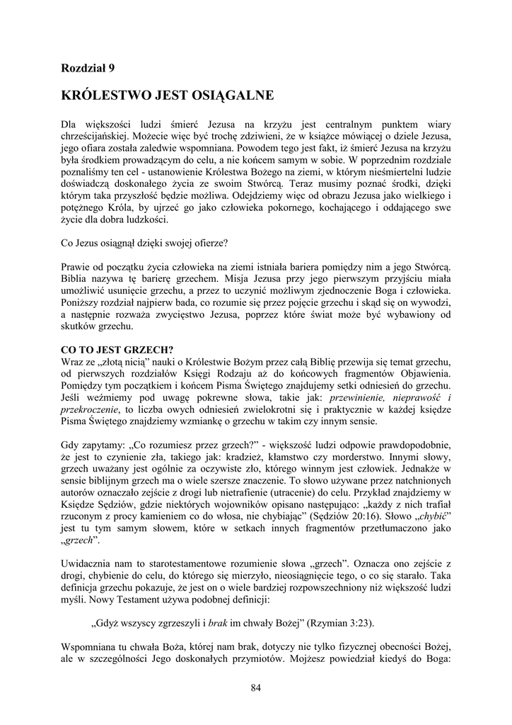 Rozdział 9 KRÓLESTWO JEST OSIĄGALNE Dla większości ludzi śmierć Jezusa na krzyżu jest centralnym punktem wiary chrześcijańskiej. Możecie więc być trochę zdziwieni, że w książce mówiącej o dziele Jezusa, jego ofiara została zaledwie wspomniana. Powodem tego jest fakt, iż śmierć Jezusa na krzyżu była środkiem prowadzącym do celu, a nie końcem samym w sobie. W poprzednim rozdziale poznaliśmy ten cel - ustanowienie Królestwa Bożego na ziemi, w którym nieśmiertelni ludzie doświadczą doskonałego życia ze swoim Stwórcą. Teraz musimy poznać środki, dzięki którym taka przyszłość będzie możliwa. Odejdziemy więc od obrazu Jezusa jako wielkiego i potężnego Króla, by ujrzeć go jako człowieka pokornego, kochającego i oddającego swe życie dla dobra ludzkości. Co Jezus osiągnął dzięki swojej ofierze? Prawie od początku życia człowieka na ziemi istniała bariera pomiędzy nim a jego Stwórcą. Biblia nazywa tę barierę grzechem. Misja Jezusa przy jego pierwszym przyjściu miała umożliwić usunięcie grzechu, a przez to uczynić możliwym zjednoczenie Boga i człowieka. Poniższy rozdział najpierw bada, co rozumie się przez pojęcie grzechu i skąd się on wywodzi, a następnie rozważa zwycięstwo Jezusa, poprzez które świat może być wybawiony od skutków grzechu. CO TO JEST GRZECH? Wraz ze „złotą nicią” nauki o Królestwie Bożym przez całą Biblię przewija się temat grzechu, od pierwszych rozdziałów Księgi Rodzaju aż do końcowych fragmentów Objawienia. Pomiędzy tym początkiem i końcem Pisma Świętego znajdujemy setki odniesień do grzechu. Jeśli weźmiemy pod uwagę pokrewne słowa, takie jak: przewinienie, nieprawość i przekroczenie, to liczba owych odniesień zwielokrotni się i praktycznie w każdej księdze Pisma Świętego znajdziemy wzmiankę o grzechu w takim czy innym sensie. Gdy zapytamy: „Co rozumiesz przez grzech?” - większość ludzi odpowie prawdopodobnie, że jest to czynienie zła, takiego jak: kradzież, kłamstwo czy morderstwo. Innymi słowy, grzech uważany jest ogólnie za oczywiste zło, którego winnym jest człowiek. Jednakże w sensie biblijnym grzech ma o wiele szersze znaczenie. To słowo używane przez natchnionych autorów oznaczało zejście z drogi lub nietrafienie (utracenie) do celu. Przykład znajdziemy w Księdze Sędziów, gdzie niektórych wojowników opisano następująco: „każdy z nich trafiał rzuconym z procy kamieniem co do włosa, nie chybiając” (Sędziów 20:16). Słowo „chybić” jest tu tym samym słowem, które w setkach innych fragmentów przetłumaczono jako „grzech”. Uwidacznia nam to starotestamentowe rozumienie słowa „grzech”. Oznacza ono zejście z drogi, chybienie do celu, do którego się mierzyło, nieosiągnięcie tego, o co się starało. Taka definicja grzechu pokazuje, że jest on o wiele bardziej rozpowszechniony niż większość ludzi myśli. Nowy Testament używa podobnej definicji: „Gdyż wszyscy zgrzeszyli i brak im chwały Bożej” (Rzymian 3:23). Wspomniana tu chwała Boża, której nam brak, dotyczy nie tylko fizycznej obecności Bożej, ale w szczególności Jego doskonałych przymiotów. Mojżesz powiedział kiedyś do Boga: 84 „Pokaż mi, proszę, chwałę twoją!”(2 Mojżeszowa 33:18). Gdy Bóg wysłuchał prośby Mojżesza, nacisk położył na ukazanie swych cech: „Wtedy Pan przeszedł obok niego, a on zawołał: Panie, Panie, Boże miłosierny i łaskawy, nieskory do gniewu, bogaty w łaskę i wierność, zachowujący łaskę dla tysięcy, odpuszczający winę, występek i grzech, nie pozostawiający w żadnym razie bez kary” (2 Mojżeszowa 34:6-7). Fakt, że chwała Boża oznaczała przede wszystkim Jego cechy moralne, a nie fizyczną obecność, wyrażony został przez Jana, gdy mówił o Jezusie: „I ujrzeliśmy chwałę jego, chwałę, jaką ma jedyny Syn od Ojca, pełne łaski i prawdy” (Jan 1:14). Kiedy Jezus był na ziemi, nie ujawnił dosłownej chwały Boga. Sposobem, w jaki ukazał chwałę swego Ojca, było doskonałe odbicie Bożego charakteru. Chwała Boga jest sumą Jego cnót, takich jak te, które rozważaliśmy w rozdziale 3. I według apostoła Pawła „brak” takiej chwały - nieosiągnięcie takich wyżyn - jest grzechem. Wobec powyższej definicji nie dziwi fakt, że wszyscy zgrzeszyliśmy. To prowadzi nas do kolejnych słów Biblii, które opisują grzech. W swoich listach Jan napisał: „Wszelka nieprawość jest grzechem” (1 Jana 5:17). „Grzech jest bezprawiem” (1 Jana 3:4, BT). Zobaczymy, że te cytaty wyrażają tę samą myśl. W rozdziale 3 rozważaliśmy prawość i sprawiedliwość Boga i zauważyliśmy, że określenia te opisują Jego doskonałe cechy. Nieprawość człowieka, niemożność życia według takiego standardu jest grzechem w znaczeniu biblijnym, mimo iż pozornie człowiek może wieść dobre i nienaganne życie. W podobny sposób grzech jest „bezprawiem”, stanem umysłu, w którym człowiek nie akceptuje praw Boga jako reguł własnego życia. Proszę zauważyć, iż dotyczy to także osób, które nie znają ani cech Boga, ani Jego woli. Ludzie winni są grzechu, nawet jeśli nie słyszeli o prawach Bożych. Nie ma w tym nic nierozsądnego: nawet w naszym systemie prawnym nieznajomość prawa nie jest usprawiedliwieniem dla przestępcy. Bóg dał jednak ludziom szczególne prawa, których mają przestrzegać. Biblia jest pełna odniesień do tego, co powinniśmy i czego nie powinniśmy robić. Ci, którzy znają przykazania, a jednak ich nie przestrzegają, grzeszą w głębszym sensie. Grzech spowodowany złamaniem nakazów Boga nazywa się przekroczeniem wyznaczonych norm lub wkroczeniem na zakazany teren. Stąd grzech oznacza tu przekroczenie linii lub zasady, którą ustanowił Bóg. Tak więc możemy być grzesznikami z dwóch powodów: po pierwsze z powodu ogólnej niemożności osiągnięcia charakteru Bożego lub po drugie poprze