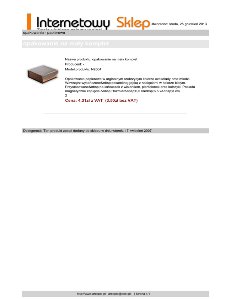 Utworzono: środa, 25 grudzień 2013 opakowania - papierowe opakowanie na mały komplet Nazwa produktu: opakowanie na mały komplet Producent: Model produktu: N2604 Opakowanie papierowe w orginalnym srebrzysym kolorze czekolady oraz miedzi. Wewnątrz wykończone aksamitną gąbką z nacięciami w kolorze białym. Przystosowane na łańcuszek z wisiorkiem, pierścionek oraz kolczyki. Posiada magnetyczne zapięcie. Rozmiar 6,5 x 6,5 x 3 cm. 2 Cena: 4.31zł z VAT (3.50zł bez VAT) Dostępność: Ten produkt został dodany do sklepu w dniu wtorek, 17 kwiecień 2007 http://www.arexpol.pl | [email protected] | | Strona 1/1
