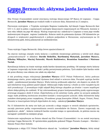 Coppa Bernocchi: aktywna jazda Jarosława Marycza Elia Viviani (Cannondale) został zwycięzcą wyścigu klasycznego GP Banca di Legnano – Coppa Bernocchi. Jarosław Marycz po trudach walki w ucieczce dnia, finiszował na 21.miejscu. Pierwszym wyścigiem z Tryptyku wyścigów Regionu Lombardia, był klasyk Coppa Bernocchi (kat UCI 1.1). Jest to jeden z najstarszych wyścigów klasycznych rozgrywanych we Włoszech, bowiem w tym roku odbyła się jego 96 edycja. Wyścig rozpoczął się i zakończył w Legnano a trasa jego wiodła malowniczymi drogami regionu Lombardia. Kolarze mieli do pokonania dystans 190 kilometrów po drogach w większości pagórkowatych z jednym podjazdem w Morazzone, usytuowanym na 16 kilometrowej pętli, którą pokonywali aż siedmiokrotnie. Trasa wyścigu Coppa Bernocchi. (http://www.spaziociclismo.it/ Na starcie wyścigu stanęło wielu kolarzy z czołówki światowego peletonu a wśród nich ekipa „pomarańczowych” w składzie: Davide Rebellin, Bartłomiej Matysiak, Jarosław Marycz, Nikolay Mihaylov, Maciej Paterski, Marek Rutkiewicz, Branislau Samoilau i Mateusz Taciak. Rywalizacja kolarzy na trasie wyścigu miała bardzo dynamiczny przebieg. Od samego startu kolarzy w Legnano rozpoczęły się liczne ataki i próby porozrywania peletonu. Tych ataków było bardzo wiele ale przez dłuższy czas nikomu nie udało się odjechać. A tak przebieg etapu relacjonuje Jarosław Marycz (CCC Polsat Polkowice), który podczas dzisiejszego startu, przez większość dystansu brał udział w ucieczce dnia. Początek wyścigu bardzo szybki – poinformował Jarosław Marycz. Wielu kolarzy próbowało odjechać, ale dopiero na około 50tym kilometrze trasy peleton puścił odjazd. Odskoczyła trójka kolarzy i chwile za nimi ruszyłem by do nich przeskoczyć. Z prowadzące trójki odpadł Belg którego złapałem po drodze i razem wspólnymi siłami dołączyliśmy do czołówki. W tej czteroosobowej grupce kontynuowaliśmy jazdę wypracowując przewagę siegajaca około 6 minut. Dojechalismy aż do ostatniej rundy, gdzie na szczycie podjazdu mając małe problemy techniczne straciłem kontakt z towarzyszami ucieczki. Kilka kilometrów dalej zostałem doścignięty przez rozpędzoną, 20-osobowa grupę faworytów (Nibali, Sagan, Viviani, Ponzi, Pozzato) w towarzystwie których dojechałem do mety – zakończył Jarosław Marycz. Na 15 kilometrów do mety nie było już ucieczki a ekipy mające w swoich składach sprinterów, zaczęły pierwsze próby rozprowadzania swoich zawodników do finiszu. Znowu rozpoczęły się pojedyncze „skoki” , kolarze rozkręcili bardzo wysokie tempo co spowodowało, że peleton mocno się naciągnał i podzielił na mniejsze grupy. Ostatecznie najszybszym na finiszu okazał się Elia Viviani (Cannondale) i to on został zwycięzcą wyścigu Coppa Bernocchi. W sprinterskim pojedynku pokonał Filippo Pozzato (Lampre – Merida) i Simone Ponzi (Neri Sottoli). Najlepszym z ekipy CCC Polsat Polkowice okazał się “uciekinier” Jarosław Marycz, który minął linię mety na 21. miejscu, tracąc do zwycięzcy 6 sekund. Wyniki Coppa Bernocchi 2014 (Legnano – Legnano, 190,3 km): 1. Elia Viviani (Cannondale) 4:27:06 2. Filippo Pozzato (Lampre-Merida) 3. Simone Ponzi (Neri Sottoli) 21. Jarosław Marycz 00:06 33. Maciej Paterski 00:21 35. Marek Rutkiewicz 40. Bartłomiej Matysiak 60. Branislau Samoilau 88. Davide Rebellin 01:56 DNF Mateusz Taciak DNF Nikolay Mihaylov info: A.Dyszyński