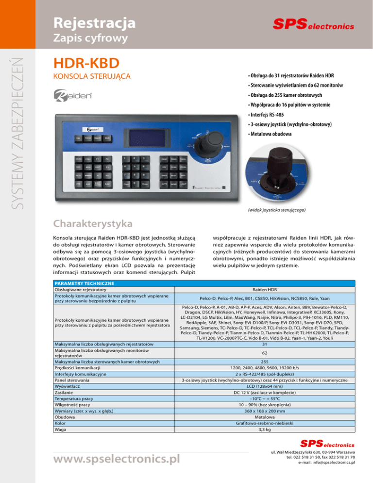 Rejestracja SYSTEMY ZABEZPIECZEŃ Zapis cyfrowy HDR-KBD KONSOLA STERUJĄCA • Obsługa do 31 rejestratorów Raiden HDR • Sterowanie wyświetlaniem do 62 monitorów • Obsługa do 255 kamer obrotowych • Współpraca do 16 pulpitów w systemie • Interfejs RS-485 • 3-osiowy joystick (wychylno-obrotowy) • Metalowa obudowa (widok joysticka sterującego) Charakterystyka Konsola sterująca Raiden HDR-KBD jest jednostką służącą do obsługi rejestratorów i kamer obrotowych. Sterowanie odbywa się za pomocą 3-osiowego joysticka (wychylnoobrotowego) oraz przycisków funkcyjnych i numerycznych. Podświetlany ekran LCD pozwala na prezentację informacji statusowych oraz komend sterujących. Pulpit współpracuje z rejestratorami Raiden linii HDR, jak również zapewnia wsparcie dla wielu protokołów komunikacyjnych (różnych producentów) do sterowania kamerami obrotowymi, ponadto istnieje możliwość współdziałania wielu pulpitów w jednym systemie. PARAMETRY TECHNICZNE Obsługiwane rejestratory Protokoły komunikacyjne kamer obrotowych wspierane przy sterowaniu bezpośrednio z pulpitu Protokoły komunikacyjne kamer obrotowych wspierane przy sterowaniu z pulpitu za pośrednictwem rejestratora Maksymalna liczba obsługiwanych rejestratorów Maksymalna liczba obsługiwanych monitorów rejestratorów Maksymalna liczba sterowanych kamer obrotowych Prędkości komunikacji Interfejsy komunikacyjne Panel sterowania Wyświetlacz Zasilanie Temperatura pracy Wilgotność pracy Wymiary (szer. x wys. x głęb.) Obudowa Kolor Waga Raiden HDR Pelco-D, Pelco-P, Alec, B01, CS850, HikVision, NCS850, Rule, Yaan Pelco-D, Pelco-P, A-01, AB-D, AP-P, Aces, ADV, Alson, Anten, BBV, Bewator-Pelco-D, Dragon, DSCP, HikVision, HY, Honeywell, Infinowa, IntegrativeP, KC3360S, Kony, LC-D2104, LG Multix, Lilin, MaoWang, Naijie, Nitro, Philips-3, PIH-1016, PLD, RM110, RedApple, SAE, Shinei, Sony-EVI-D100/P, Sony-EVI-D3031, Sony-EVI-D70, SPD, Samsung, Siemens, TC-Pelco-D, TC-Pelco-P, TCL-Pelco-D, TCL-Pelco-P, Tiandy, TiandyPelco-D, Tiandy-Pelco-P, Tianmin-Pelco-D, Tianmin-Pelco-P, TL-HHX2000, TL-Pelco-P, TL-V1200, VC-2000PTC-C, Vido B-01, Vido B-02, Yaan-1, Yaan-2, Youli 31 www.spselectronics.pl 62 255 1200, 2400, 4800, 9600, 19200 b/s 2 x RS-422/485 (pół-dupleks) 3-osiowy joystick (wychylno-obrotowy) oraz 44 przyciski: funkcyjne i numeryczne LCD (128x64 mm) DC 12 V (zasilacz w komplecie) –10°C ~ + 55°C 10 – 90% (bez skroplenia) 360 x 108 x 200 mm Metalowa Grafitowo-srebrno-niebieski 3,3 kg ul. Wał Miedzeszyński 630, 03-994 Warszawa tel. 022 518 31 50, fax 022 518 31 70 e-mail: [email protected]