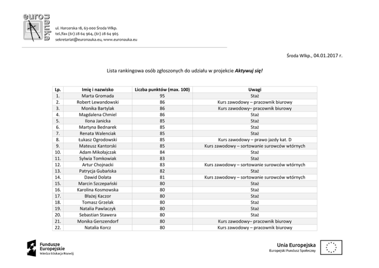 ul. Harcerska 18, 63-000 Środa Wlkp. tel./fax (61) 28 64 964, (61) 28 64 965 [email protected], www.euronauka.eu Środa Wlkp., 04.01.2017 r. Lista rankingowa osób zgłoszonych do udziału w projekcie Aktywuj się! Lp. 1. 2. 3. 4. 5. 6. 7. 8. 9. 10. 11. 12. 13. 14. 15. 16. 17. 18. 19. 20. 21. 22. Imię i nazwisko Marta Gromada Robert Lewandowski Monika Bartylak Magdalena Chmiel Ilona Janicka Martyna Bednarek Renata Walenciak Łukasz Ogrodowski Mateusz Kantorski Adam Mikołajczak Sylwia Tomkowiak Artur Chojnacki Patrycja Gubańska Dawid Dolata Marcin Szczepański Karolina Kosmowska Błażej Kaczor Tomasz Grzelak Natalia Pawlaczyk Sebastian Stawera Monika Gerszendorf Natalia Korcz Liczba punktów (max. 100) 95 86 86 86 85 85 85 85 85 84 83 83 82 81 80 80 80 80 80 80 80 80 Uwagi Staż Kurs zawodowy – pracownik biurowy Kurs zawodowy– pracownik biurowy Staż Staż Staż Staż Kurs zawodowy – prawo jazdy kat. D Kurs zawodowy – sortowanie surowców wtórnych Staż Staż Kurs zawodowy – sortowanie surowców wtórnych Staż Kurs zawodowy – sortowanie surowców wtórnych Staż Staż Staż Staż Staż Staż Kurs zawodowy– pracownik biurowy Kurs zawodowy – pracownik biurowy ul. Harcerska 18, 63-000 Środa Wlkp. tel./fax (61) 28 64 964, (61) 28 64 965 [email protected], www.euronauka.eu 23. 24. 25. 26. 27. 28. 29. 30. 31. 32. 33. 34. 35. 36. 37. 38. 39. Marcin Chmiel Wojciech Gabała Przemysław Bednarek Izabela Buczkowska Tomasz Pieczyński Sandra Bogusławska Dorota Tupalska Łukasz Jankowski Marta Hudak Paweł Szymkowiak Agata Bagrowska Robert Radek Rafał Sobczak Joanna Ligocka Klaudia Dubisz Natalia Walenciak Jolanta Rumińska 80 80 80 79 78 78 78 77 77 77 77 77 76 75 74 72 63 Kurs zawodowy – prawo jazdy kat. D Kurs zawodowy – prawo jazdy kat. D Kurs zawodowy – systemy fotowoltaiczne Staż Staż Staż Kurs zawodowy– pracownik biurowy Staż Kurs zawodowy– pracownik biurowy Staż Staż Kurs zawodowy– pracownik biurowy Staż Staż Staż Staż Staż