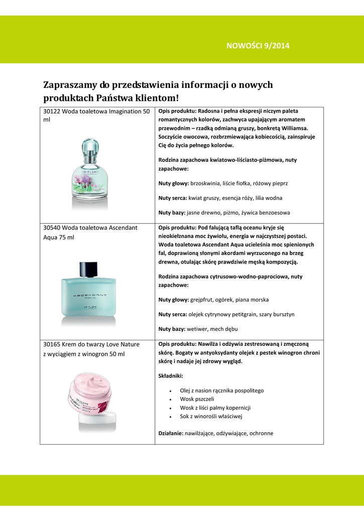NOWOŚCI 9/2014 ORIFLAME POLAND Zapraszamy do przedstawienia informacji o nowych produktach Państwa klientom! 30122 Woda toaletowa Imagination 50 ml Opis produktu: Radosna i pełna ekspresji niczym paleta romantycznych kolorów, zachwyca upajającym aromatem przewodnim – rzadką odmianą gruszy, bonkretą Williamsa. Soczyście owocowa, rozbrzmiewająca kobiecością, zainspiruje Cię do życia pełnego kolorów. Rodzina zapachowa kwiatowo-liściasto-piżmowa, nuty zapachowe: Nuty głowy: brzoskwinia, liście fiołka, różowy pieprz Nuty serca: kwiat gruszy, esencja róży, lilia wodna Nuty bazy: jasne drewno, piżmo, żywica benzoesowa 30540 Woda toaletowa Ascendant Aqua 75 ml Opis produktu: Pod falującą taflą oceanu kryje się nieokiełznana moc żywiołu, energia w najczystszej postaci. Woda toaletowa Ascendant Aqua ucieleśnia moc spienionych fal, doprawioną słonymi akordami wyrzuconego na brzeg drewna, otulając skórę prawdziwie męską kompozycją. Rodzina zapachowa cytrusowo-wodno-paprociowa, nuty zapachowe: Nuty głowy: grejpfrut, ogórek, piana morska Nuty serca: olejek cytrynowy petitgrain, szary bursztyn Nuty bazy: wetiwer, mech dębu 30165 Krem do twarzy Love Nature z wyciągiem z winogron 50 ml Opis produktu: Nawilża i odżywia zestresowaną i zmęczoną skórę. Bogaty w antyoksydanty olejek z pestek winogron chroni skórę i nadaje jej zdrowy wygląd. Składniki:     Olej z nasion rącznika pospolitego Wosk pszczeli Wosk z liści palmy kopernicji Sok z winorośli właściwej Działanie: nawilżające, odżywiające, ochronne NOWOŚCI 9/2014 30168 Złuszczający żel oczyszczający Love Nature z wyciągiem z winogron 125 ml Opis produktu: Delikatny żel łagodnie złuszcza skórę, by ORIFLAME POLAND oczyścić ją, zmiękczyć i nadać jej blask. Odpowiedni do codziennego użycia. Składniki:   Oliwa z oliwek Sok z winorośli właściwej Działanie: złuszczające, oczyszczające, zmiękczające 30167 Krem pod oczy Love Nature z wyciągiem z winogron 15 ml Opis produktu: Nawilża i chroni delikatną skórę wokół oczu przed działaniem wolnych rodników. Sprawia, że cera jest gładka i miękka w dotyku. Formuła z dodatkiem olejku z pestek winogron o wysokiej zawartości antyoksydantów, bezzapachowa, testowana okulistycznie. Działanie: nawilżające, ochronne, zmiękczające 30159 Kremowe mleczko oczyszczające z rumiankiem Love Nature 125 ml Opis produktu: Kremowe mleczko usuwa ze skóry zanieczyszczenia i uczucie ściągnięcia oraz sprawia, że jest ona świeża i czysta. Uspokaja skórę wrażliwą dzięki zawartości ekstraktu z rumianku. Składniki:    Masło shea Kwas mlekowy Ekstrakt z kwiatów rumianku pospolitego Działanie: oczyszczające, odświeżające, kojące NOWOŚCI 9/2014 30158 Tonik do twarzy z rumiankiem Love Nature 150 ml Opis produktu: Świeży, bezbarwny tonik delikatnie oczyszcza ORIFLAME POLAND skórę nie powodując jej przesuszania się. Dzięki zawartości ekstraktu z rumianku przynosi cerze ukojenie. Składniki:    Ekstrakt z kwiatów rumianku pospolitego Kwas mlekowy Alantoina Działanie: oczyszczające, odświeżające, kojące 30157 Krem do twarzy z rumiankiem Love Nature 50 ml Opis produktu: Delikatna konsystencja kremu z dodatkiem ekstraktu z rumianku koi, uspokaja i przynosi ulgę wrażliwej skórze. Bez barwników, o niskiej zawartości substancji zapachowych. Składniki:  Ekstrakt z kwiatów rumianku pospolitego Działanie: kojące, uspokajające 30954 – 30958 Pomadka w płynie Giordani Gold Iconic 4,5 ml Opis produktu: Ultralekka, płynna formuła z regenerującym olejkiem arganowym tworzy na ustach efekt długotrwałego koloru i głębokiego połysku. Innowacyjna dzięki lekkiej konsystencji, składnikom nawilżającym oraz głębi koloru, dzięki której usta wyglądają zmysłowo i nonszalancko. 30883 Ochronne mydełko Nature Secrets z wanilią i granatem 75 g Opis produktu: Mydełko o przyjemnym owocowym zapachu z formułą zawierającą glicerynę, która zapobiega utracie nawilżenia, nawilżającą wanilię i ochronny ekstrakt z granatu. Wystarczająco delikatne, byś mogła używać go codziennie. Składniki:    Ekstrakt z granatowca właściwego Ekstrakt z owoców wanilii płaskolistnej Gliceryna NOWOŚCI 9/2014 Działanie: kojące, uspokajające 30882 Ochronny krem pod prysznic Nature Secrets z wanilią i granatem 250 ml ORIFLAME POLAND Opis produktu: Delikatny krem pod prysznic oczyszcza skórę nie powodując jej przesuszania się. Formuła z nawilżającym ekstraktem z wanilii i ochronnym z granatu pomaga chronić skórę przed zewnętrznymi agresorami i sprawia, że jest ona nawilżona i piękna. Składniki:   Ekstrakt z granatowca właściwego Ekstrakt z owoców wanilii płaskolistnej Działanie: oczyszczające, nawilżające, ochronne 30884 Ochronny krem do rąk Nature Secrets z wanilią i granatem 75 ml Opis produktu: Bogata formuła o zbalansowanym pH zapewnia skórze dłoni intensywne nawilżenie i maksymalną ochronę przed wysychaniem. Z dodatkiem nawilżającego ekstraktu z wanilii, ochronnego ekstraktu z granatu i olejku migdałowego, gwarantujących piękny wygląd Twoich dłoni. Składniki:    Ekstrakt z granatowca właściwego Ekstrakt z owoców wanilii płaskolistnej Olejek ze słodkich migdałów Działanie: nawilżające, ochronne