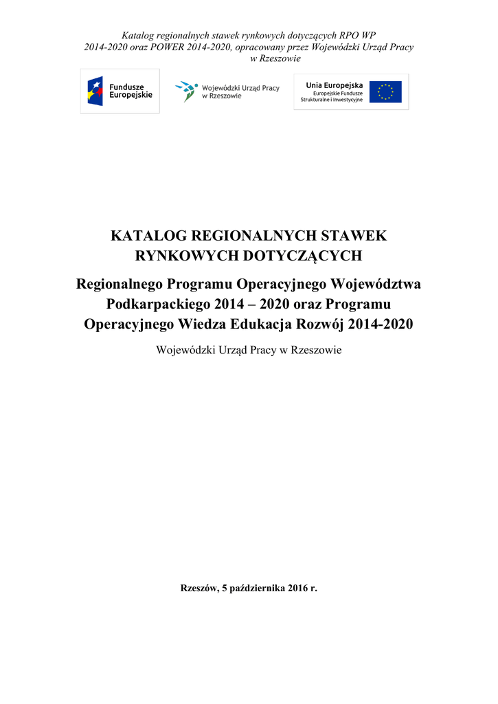Katalog regionalnych stawek rynkowych dotyczących RPO WP 2014-2020 oraz POWER 2014-2020, opracowany przez Wojewódzki Urząd Pracy w Rzeszowie KATALOG REGIONALNYCH STAWEK RYNKOWYCH DOTYCZĄCYCH Regionalnego Programu Operacyjnego Województwa Podkarpackiego 2014 – 2020 oraz Programu Operacyjnego Wiedza Edukacja Rozwój 2014-2020 Wojewódzki Urząd Pracy w Rzeszowie Rzeszów, 5 października 2016 r. Spis treści: Wprowadzenie ........................................................................................................................ 2 1.Personel specjalistyczny ...................................................................................................... 4 2. Szkolenia/kursy .................................................................................................................. 8 3. Podnoszenie kompetencji osób dorosłych w obszarze Technologii informacyjnokomunikacyjnych (TIK) ....................................................................................................... 12 4. Szkolenia językowe ........................................................................................................ 12 5. Zestawienie stawek jednostkowych obowiązujących w województwie podkarpackim... 12 6. Stypendia .......................................................................................................................... 14 7. Wyposażenie ..................................................................................................................... 15 7.1. Sprzęt elektroniczny ...................................................................................................... 15 7.2. Wynajem sali ................................................................................................................. 21 8. Materiały szkoleniowe ...................................................................................................... 25 9. Koszty towarzyszące ........................................................................................................ 26 10. Przykładowe wydatki związane z bieżącą działalnością żłobków, przedszkoli, klubów dziecięcych oraz dziennych opiekunów ............................................................................... 31 2 Wprowadzenie Katalog Regionalnych Stawek Rynkowych zalecanych dla Regionalnego Programu Operacyjnego Województwa Podkarpackiego na lata 2014 – 2020 oraz Programu Operacyjnego Wiedza Edukacja Rozwój obowiązuje dla konkursów i naborów ogłaszanych przez Wojewódzki Urząd Pracy w Rzeszowie. Dokument został opracowany zgodnie z „Wytycznymi w zakresie kwalifikowalności wydatków w ramach Europejskiego Funduszu Rozwoju Regionalnego, Europejskiego Funduszu Społecznego oraz Funduszu Spójności na lata 2014-2020” ( Rozdział 6.2 pkt.7, Rozdział 8.3 pkt 10 Wytycznych), „Wytycznymi w zakresie realizacji przedsięwzięć z udziałem środków Europejskiego Funduszu Społecznego w obszarze rynku pracy na lata 2014-2020”, „Wytycznymi w zakresie realizacji przedsięwzięć z udziałem środków Europejskiego Funduszu Społecznego w obszarze edukacji na lata 2014-2020”, a także w oparciu o rozeznanie cen rynkowych, na podstawie dostępnych źródeł, w tym stron internetowych oraz dotychczasowych pozycji występujących w budżetach wniosków o dofinansowanie projektów w ramach EFS. Opracowanie dokumentu zawierającego zestawienie standardu i cen rynkowych w zakresie najczęściej finansowanych wydatków w ramach PO WER i RPO WP 2014-2020 ma na celu: zapewnienie stosowania przez wnioskodawców/beneficjentów racjonalnych i efektywnych cen, niezawyżonych w stosunku do cen i stawek rynkowych; usprawnienie i ujednolicenie procesu oceny wniosków o dofinansowanie projektów konkursowych i pozakonkursowych. Założenia: 1. Katalog jest dokumentem obowiązującym przy konstruowaniu oraz ocenie budżetu projektów i stanowi załącznik do Regulaminu Konkursu i jest dostępny dla Wnioskodawców i Oceniających. Powinien być wykorzystywany przez osoby nadzorujące realizację projektów, pracowników dokonujących weryfikacji wniosków o płatność oraz członków zespołów kontrolujących w trakcie prowadzonych czynności kontrolnych. „Katalog Regionalnych Stawek Rynkowych” zawiera zestawienie maksymalnych zalecanych cen rynkowych dla towarów i usług (w tym wynagrodzeń). Wszystkie kwoty wynagrodzeń i stypendiów należy rozumieć jako kwoty brutto, tj. kwoty wraz ze składkami po stronie pracownika i pracodawcy. 2. Katalog określa wysokości wybranych rodzajów kosztów tj. kosztów najczęściej występujących w projektach współfinansowanych ze środków unijnych, co oznacza, że nie jest on katalogiem zamkniętym i w budżetach projektów dopuszcza się stosowanie kategorii kosztów, które nie zostały ujęte w tym katalogu. 2 3. Stawki ujęte w Katalogu są maksymalnymi cenami rynkowymi, co oznacza, że stawki w budżecie projektu nie powinny przekraczać ich wysokości i w takim przypadku nie ma potrzeby uzasadniania ich wysokości. Dopuszcza się odstępstwa od określonych w katalogu stawek tj. stosowania stawek wyższych, jednakże w takiej sytuacji wymagane jest uzasadnienie zaplanowanej wysokości wydatku oraz wykazanie racjonalności i efektywności kosztu. W przypadku umieszczenia w budżecie projektu stawki przekraczającej maksymalną cenę rynkową, projektodawca zobowiązany jest do uzasadnienia przyjętej w budżecie stawki oraz przedstawienia sposobu wyliczenia jej wysokości. 4. Wykaz maksymalnych cen rynkowych będzie aktualizowany i uzupełniany o nowe pozycje oraz weryfikowany pod względem wysokości stawki nie rzadziej niż raz w roku kalendarzowym, jeżeli w danym roku zaplanowano ogłoszenie naboru wniosków o dofinansowanie w trybie konkursowym. 3 1.Personel specjalistyczny Lp. Stanowisko Warunki kwalifikowania wydatku na etapie oceny projektów Maksymalna cena rynkowa (PLN brutto) Dodatkowe zalecenia wydate