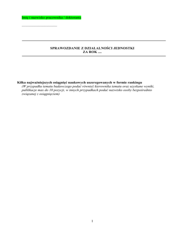Imię i nazwisko pracownika / doktoranta ....................................... SPRAWOZDANIE Z DZIAŁALNOŚCI JEDNOSTKI ZA ROK .... Kilka najważniejszych osiągnięć naukowych uszeregowanych w formie rankingu (W przypadku tematu badawczego podać również kierownika tematu oraz uzyskane wyniki, publikacje max do 10 pozycji, w innych przypadkach podać nazwisko osoby bezpośrednio związanej z osiągnięciem) 1 Publikacje naukowe Ogólna liczba publikacji: (Podać zgodnie z tabelą) Liczba publikacji Liczba publikacji umieszczonych na liście Filadelfijskiego Instytutu Informacji Naukowej - Liczba publikacji ogółem wg miejsca wydania: -w tym: wydawnictwa własne: inne krajowe: zagraniczne: Należy podać następujące informacje : autor, tytuł, miejsce, wydawnictwo, rok wydania, liczba stron, w przypadku rozdziału i artykułu podaje się liczbę stron od ..do). Dodatkowo podać język publikacji, czy jest to tłumaczenie i z jakiego języka, czy jest bibliografia, streszczenie i w jakim języku oraz określić oznaczeniem R – recenzowano, NR – nie recenzowano, F – pozycja znajduje się na liście Filadelfijskiej Instytutu Informacji Naukowej, K- materiał konferencyjny, D – dokument elektroniczny Kategorie wg Typu dokumentu: I. Książka Przedmowy, wstępy, posłowia proszę podawać przy opisie książki. 1. Monografia 2 Recenzje Inne (komunikaty, streszczenia, wywiady, dyskusje) Artykuły w czasopismach Artykuły problemowe Inne (komunikaty, streszczenia, biogramy i) Hasło encyklopedyczne Rozdziały w książkach Opracowanie problemowe Prace zbiorowa (więcej niż 3 autorów) Książki inne (poradnik, słownik, biografia, katalog itp.) Prace redakcyjne, redakcja tomu Podręczniki, skrypty Monografie Razem Książki 2. Skrypt, podręcznik 3. Prace redakcyjne, redakcja tomu 4. Prace zbiorowe (powyżej 3 autorów, bez redakcji) 5. Książki inne (poradnik, słownik, literatura piękna, katalog wystaw, biografia, bibliografia, tłumaczenie książki i in.) II. Rozdział 1. Opracowanie problemowe 2. Hasło encyklopedyczne 3. Inne (komunikaty, streszczenia, biogramy, varia) III. Artykuł 1. Artykuły problemowe 2. Inne (komunikaty, streszczenia, biogramy, varia, sprawozdania, wywiady, dyskusje) IV. Recenzja, polemika Wydawane czasopisma i serie naukowe 1) w ramach AUW : 2) inne : Prowadzone w jednostce w sposób ciągły badania naukowe i prace badawczo-rozwojowe z określeniem dyscyplin i kierunków: Proszę opisać badania prowadzone w .... roku i/lub przedstawić streszczenia publikacji wydanych w tym roku. Liczba realizowanych tematów badawczych Liczba realizowanych tematów badawczych ogółem: Projekty badawcze MNiSW: W ramach działalności statutowej MNiSW: W ramach badań własnych MNiSW : 3 Zlecenia z przemysłu : Inne na zlecenie : -w tym finansowane przez partnerów zagranicznych : Własne tematy badawcze wykonywane bez nakładów finansowych : Liczba zakończonych tematów badawczych ogółem: w tym Projekty badawcze MNiSW a) wykaz zakończonych i rozliczonych projektów własnych, promotorskich i zamawiane; b) wykaz zakończonych i rozliczonych projektów celowych. W ramach działalności statutowej MNiSW: W ramach badań własnych MNiSW: Inne na zlecenie : - w tym finansowane przez partnerów zagranicznych : Zlecenia z przemysłu : Własne tematy badawcze wykonywane bez nakładów finansowych : 4 Dane o wdrożeniach i patentach Liczba i wykaz uzyskanych patentów międzynarodowych. Liczba i wykaz patentów krajowych. Liczba i wykaz wydanych praw ochronnych na wzory użytkowe. Liczba i wykaz wdrożeń. Udział w realizacji międzynarodowych programów Ogólna liczba realizowanych projektów: - w tym W ramach programów Unii Europejskiej - badawczych KE (5 Program Ramowy, 6 Program Ramowy, w tym stypendiów M. Curie ): - edukacyjnych KE (CEEPUS, Jean Monet, Leonardo da Vinci, Sokrates Erasmus, Soktates Mundi, Sokrates Grundvigt) - projektów specjalnych będących częścią międzynarodowego Programu (COST, Eureka, ICARUS) - w ramach innych programów (stypendium NATO, granty na organizację konferencji, inne): Udział w realizacji projektów z funduszy strukturalnych: - W ramach Zintegrowanego Programu Rozwoju Regionalnego (ZPORR) – jako lider, partner, podwykonawca - w ramach Sektorowego Programu Operacyjnego Rozwój Zasobów Ludzkich (SPO RZL) - W ramach innych programów (INTERREG IIIC) Opis międzynarodowych programów naukowych: ( Podać nazwę programu, tytuł projektu, nazwisko kierownika projektu, instytucja koordynująca, wspólne osiągnięcia, inne istotne informacje) Dane o dwustronnych umowach międzynarodowych zawartych przez wydział, instytut, katedrę: (Podać nazwę placówki, kraj, okres trwania umowy, liczba wyjazdów, wspólne osiągnięcia) 5 Członkostwo z wyboru w Akademiach Nauk Nazwisko i imię: Nazwa akademii: Rok wyboru: Członkostwo z wyboru w komitetach redakcyjnych czasopism naukowych o zasięgu światowym Nazwisko i imię: Nazwa czasopisma Rok wydania Członkostwo z wyboru w międzynarodowych w organizacjach naukowych Nazwisko i imię: Nazwa organizacji: Rok wyboru: Współpraca z placówkami krajowymi Współpraca naukowa z placówkami PAN, PAU i innymi organizacjami naukowymi: Prace w redakcjach i kolegiach wydawniczych: zagranicznych i krajowych. Współpraca gospodarcza: Konferencje naukowe Liczba konferencji międzynarodowych zorganizowanych przez jednostkę: Proszę wpisać nazwę konferencji, organizatora (organizatorów), miejsce, datę, Liczba konferencji krajowych zorganizowanych przez jednostkę: Liczba i tytuły zgłoszonych referatów zagranicznych na międzynarodowych konferencjach zorganizowanych przez jednostkę: Liczba pracowników uczestniczących w konferencjach krajowych: - w tym wygłaszających referaty lub komunikaty: Proszę wpisać nazwisko i imię (także współautora / współautorów), tytuł wystąpienia, formę wystąpienia (wykład, referat, komunikat, plakat), nazwę konferencji, nazwę organiz
