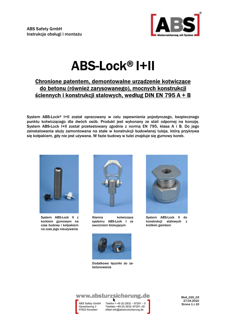 ABS Safety GmbH Instrukcja obsługi i montażu ABS-Lock® I+II Chronione patentem, demontowalne urządzenie kotwiczące do betonu (również zarysowanego), mocnych konstrukcji ściennych i konstrukcji stalowych, według DIN EN 795 A + B System ABS-Lock® I+II został opracowany w celu zapewnienia pojedynczego, bezpiecznego punktu kotwiczącego dla dwóch osób. Produkt jest wykonany ze stali odpornej na korozję. System ABS-Lock I+II został przetestowany zgodnie z normą EN 795, klasa A i B. Do jego zainstalowania służy zamontowana na stałe w konstrukcji budowlanej tuleja, którą przykrywa się kołpakiem, gdy nie jest używana. W fazie budowy w tulei znajduje się gumowy korek. System ABS-Lock II z korkiem gumowym na czas budowy i kołpakiem na czas jego nieużywania Klamra kotwicząca systemu ABS-Lock I ze sworzniem blokującym System ABS-Lock II do konstrukcji stalowych z krótkim gwintem Dodatkowe łączniki do zabetonowania ABS Safety GmbH Gewerbering 3 47623 Kevelaer Telefon + 49 (0) 2832 – 97281 – 0 Telefaks +49 (0) 2832–97281–29 eMail [email protected] MoA_020_03 27.04.2010 Strona 1 z 10 ABS Safety GmbH Instrukcja obsługi i montażu KONTROLA (PRZED KAŻDYM UŻYCIEM) • • • • • Należy przestrzegać zaleceń stosowania innych produktów powiązanych z niniejszym produktem. Punkt kotwiczący musi być bez uszkodzeń i oznak korozji. Punkt kotwiczący musi być w dobrym stanie technicznym bez oznak zużycia lub odkształcenia. Każda konstrukcja pod punkt kotwiczących musi być w dobrym stanie bez widocznych uszkodzeń i rys. Nie wolno korzystać z punktu kotwiczącego, jeśli nie są spełnione wyszczególnione wyżej kryteria. Uwaga:Raz w roku punkt kotwiczący musi przejść kontrolę, przeprowadzoną przez upoważnionego przez producenta specjalistę, pod względem ścisłego przestrzegania instrukcji producenta. Kontrola ta ma istotne znaczenie, ponieważ bezpieczeństwo użytkownika zależy od skuteczności i wytrzymałości wyposażenia. PRZEPISY BEZPIECZEŃSTWA • • • • • • • • • • • • • Nigdy nie wolno wykorzystywać urządzenia kotwiczącego do transportu materiałów. O ile to możliwe, nie pracować nad punktem kotwiczącym (patrz instrukcja użytkowania lonży). Nigdy nie mocować urządzenia kotwiczącego na ścianie z betonu klasy niższej niż B25. Produkt ten może być stosowany jako pojedynczy punkt kotwiczący dla maks. 2 osób. Produkt może być używany tylko przez odpowiednio poinstruowanych i przeszkolonych pracowników. Przed użyciem należy rozważyć, jakie środki ratunkowe mogą być przedsięwzięte w sposób rozsądny i skuteczny podczas użytkowania produktu. Nie wolno podejmować żadnych zmian na urządzeniu kotwiczącym. Podczas użytkowania zwracać uwagę na bezpieczeństwo (ostrzeżenie przed upadkiem wskutek potknięcia). Produkt należy stosować tylko z szelkami bezpieczeństwa i innymi środkami ochrony osobistej przed upadkiem (np. linka asekuracyjna z absorberem energii według norm EN 354 i EN 355, mechanizm samozaciskowy wraz z giętką prowadnicą według normy EN 353-2 lub urządzeniem samohamownym według normy EN 360) oraz łącznikami (według normy EN 362). Po upadku produkt należy wyłączyć z dalszego użytkowania i przekazać do kontroli przez producenta. Punkt kotwiczący nie powinien mieć kontaktu z chemikaliami ani innymi substancjami agresywnymi; w przypadku wystąpienia wątpliwości skontaktować się z producentem. Jeśli istnieją wątpliwości co do bezpiecznego działania punktu kotwiczącego, należy go wycofać z użytku i przekazać producentowi do kontroli. Konstrukcja nośna dla punku kotwiczącego musi mieć odpowiednią nośność, w przypadku wątpliwości zwrócić się do specjalisty od statyki konstrukcji budowlanych. Ograniczenia zdrowotne (problemy z sercem i układem krążenia, używanie leków) mogą wpływać na bezpieczeństwo użytkownika podczas prac na wysokości. W przypadku wątpliwości co do stanu fizycznego użytkownika, należy przed korzystaniem z systemu zasięgnąć porady lekarza. Z systemu nie powinny korzystać dzieci i kobiety ciężarne. Musi istnieć plan postępowania uwzględniający środki ratunkowe dla wszystkich możliwych niebezpiecznych wypadków podczas pracy. ABS Safety GmbH Gewerbering 3 47623 Kevelaer Telefon + 49 (0) 2832 – 97281 – 0 Telefaks +49 (0) 2832–97281–29 eMail [email protected] MoA_020_03 27.04.2010 Strona 2 z 10 ABS Safety GmbH Instrukcja obsługi i montażu MONTAŻ W BETONIE Rodzaj montażu: Zaprawa wtryskowa Warunki, jakie musi spełniać element wsporczy pod produkt: Minimalna grubość ściany: Średnica otworu: Głębokość otworu: Minimalna odległość pomiędzy urządzeniem kotwiczącym a krawędzią konstrukcji: Maksymalny występ nad powierzchnię konstrukcji żelbetowej: 110 mm 24 mm 70 mm 85 mm 30 mm (dla kotew o długości 100 mm) Inne wielkości tylko po ustaleniu z firmą ABS Safety! W przypadku innych warunków należy zwrócić się do producenta (ABS Safety)! Kolejność montażu: Uwagi: W razie potrzeby urządzenie kotwiczące, które ma być stosowane jako pojedynczy punkt kotwiczący należy przetestować pod działaniem siły 5 kN przez 15 sekund, aby potwierdzić odpowiedniość konstrukcji. Należy pamiętać o włożeniu gumowego korka, aby uniknąć zanieczyszczenia mechanizmu zatrzaskowego. 1. Wywiercenie otworu W konstrukcji żelbetowej wywiercić otwór 24 mm. 2. Czyszczenie 3. Wklejanie 4. Osadzenie tulei 5. Zakończenie Otwór wyczyścić najpierw szczotką, potem wydmuchać brudy pompką. Wstrzyknąć zaprawę wtryskową do otworu. Wcisnąć tuleję ze stali szlachetnej do otworu. Tuleję wkręcać jak śrubę, dzięki czemu nie powstaną żadne pęcherzyki powietrza wypierające klej. Tuleję wkręcić tak, aby była równo z powierzchnią. Przestrzegać czasu wiązania zgodnie z instrukcją stosowania kleju. Powtórzyć to jeszcze raz. Przestrzegać instrukcji stos