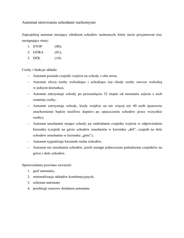Automat sterowania schodami ruchomymi Zaprojektuj automat sterujący silnikiem schodów ruchomych, który może przyjmować trzy następujące stany: 1. STOP (00), 2. GÓRA (01), 3. DÓŁ (10). Cechy i funkcje układu: − Automat posiada czujniki wejścia na schody z obu stron, − Automat zlicza osoby wchodzące i schodzące (na chody osoby zawsze wchodzą w jednym kierunku), − Automat zatrzymuje schody po przesunięciu 32 stopni od momentu zejścia z nich ostatniej osoby, − Automat zatrzymuje schody, kiedy wejdzie na nie więcej niż 40 osób (ponowne uruchomienie będzie możliwe dopiero po opuszczeniu schodów przez wszystkie osoby), − Automat uruchamia stojące schody po zadziałaniu czujnika wejścia w odpowiednim kierunku (czujnik na górze schodów uruchamia w kierunku „dół”, czujnik na dole schodów uruchamia w kierunku „góra”), − Automat sygnalizuje kierunek ruchu schodów, − Automat nie uruchamia schodów, jeżeli nastąpi jednoczesne pobudzenie czujników na górze i dole schodów. Sprawozdanie powinno zawierać: 1. graf automatu, 2. minimalizacje układów kombinacyjnych, 3. schemat automatu 4. przebiegi czasowe działania automatu