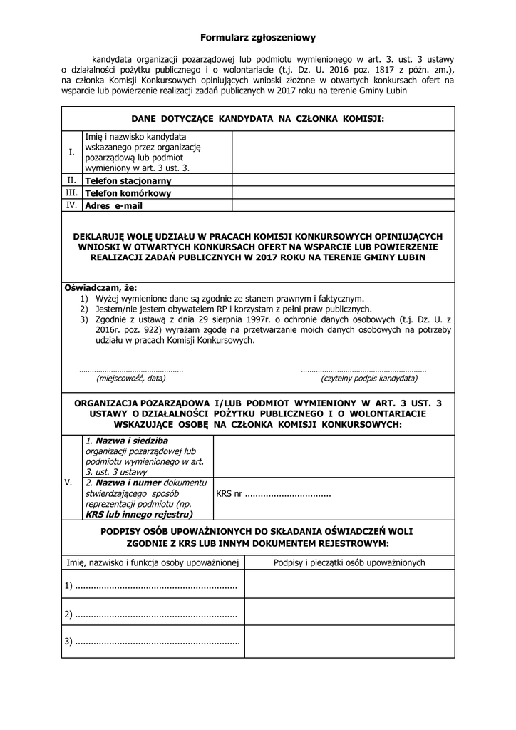 Formularz zgłoszeniowy kandydata organizacji pozarządowej lub podmiotu wymienionego w art. 3. ust. 3 ustawy o działalności pożytku publicznego i o wolontariacie (t.j. Dz. U. 2016 poz. 1817 z późn. zm.), na członka Komisji Konkursowych opiniujących wnioski złożone w otwartych konkursach ofert na wsparcie lub powierzenie realizacji zadań publicznych w 2017 roku na terenie Gminy Lubin DANE DOTYCZĄCE KANDYDATA NA CZŁONKA KOMISJI: Imię i nazwisko kandydata wskazanego przez organizację I. pozarządową lub podmiot wymieniony w art. 3 ust. 3. II. Telefon stacjonarny III. Telefon komórkowy IV. Adres e-mail DEKLARUJĘ WOLĘ UDZIAŁU W PRACACH KOMISJI KONKURSOWYCH OPINIUJĄCYCH WNIOSKI W OTWARTYCH KONKURSACH OFERT NA WSPARCIE LUB POWIERZENIE REALIZACJI ZADAŃ PUBLICZNYCH W 2017 ROKU NA TERENIE GMINY LUBIN Oświadczam, że: 1) Wyżej wymienione dane są zgodnie ze stanem prawnym i faktycznym. 2) Jestem/nie jestem obywatelem RP i korzystam z pełni praw publicznych. 3) Zgodnie z ustawą z dnia 29 sierpnia 1997r. o ochronie danych osobowych (t.j. Dz. U. z 2016r. poz. 922) wyrażam zgodę na przetwarzanie moich danych osobowych na potrzeby udziału w pracach Komisji Konkursowych. …………………………………………. (miejscowość, data) ……………………………………….…………. (czytelny podpis kandydata) ORGANIZACJA POZARZĄDOWA I/LUB PODMIOT WYMIENIONY W ART. 3 UST. 3 USTAWY O DZIAŁALNOŚCI POŻYTKU PUBLICZNEGO I O WOLONTARIACIE WSKAZUJĄCE OSOBĘ NA CZŁONKA KOMISJI KONKURSOWYCH: V. 1. Nazwa i siedziba organizacji pozarządowej lub podmiotu wymienionego w art. 3. ust. 3 ustawy 2. Nazwa i numer dokumentu stwierdzającego sposób reprezentacji podmiotu (np. KRS lub innego rejestru) KRS nr ................................. PODPISY OSÓB UPOWAŻNIONYCH DO SKŁADANIA OŚWIADCZEŃ WOLI ZGODNIE Z KRS LUB INNYM DOKUMENTEM REJESTROWYM: Imię, nazwisko i funkcja osoby upoważnionej 1) .............................................................. 2) .............................................................. 3) ............................................................... Podpisy i pieczątki osób upoważnionych