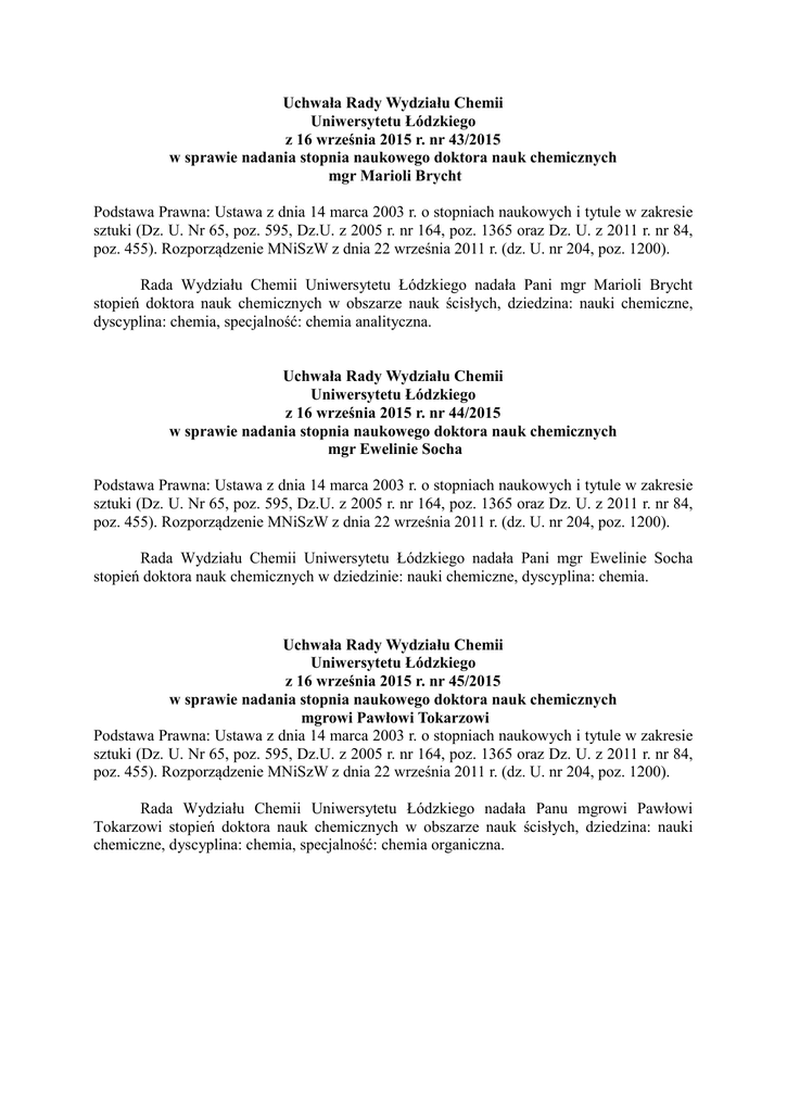 Uchwała Rady Wydziału Chemii Uniwersytetu Łódzkiego z 16 września 2015 r. nr 43/2015 w sprawie nadania stopnia naukowego doktora nauk chemicznych mgr Marioli Brycht Podstawa Prawna: Ustawa z dnia 14 marca 2003 r. o stopniach naukowych i tytule w zakresie sztuki (Dz. U. Nr 65, poz. 595, Dz.U. z 2005 r. nr 164, poz. 1365 oraz Dz. U. z 2011 r. nr 84, poz. 455). Rozporządzenie MNiSzW z dnia 22 września 2011 r. (dz. U. nr 204, poz. 1200). Rada Wydziału Chemii Uniwersytetu Łódzkiego nadała Pani mgr Marioli Brycht stopień doktora nauk chemicznych w obszarze nauk ścisłych, dziedzina: nauki chemiczne, dyscyplina: chemia, specjalność: chemia analityczna. Uchwała Rady Wydziału Chemii Uniwersytetu Łódzkiego z 16 września 2015 r. nr 44/2015 w sprawie nadania stopnia naukowego doktora nauk chemicznych mgr Ewelinie Socha Podstawa Prawna: Ustawa z dnia 14 marca 2003 r. o stopniach naukowych i tytule w zakresie sztuki (Dz. U. Nr 65, poz. 595, Dz.U. z 2005 r. nr 164, poz. 1365 oraz Dz. U. z 2011 r. nr 84, poz. 455). Rozporządzenie MNiSzW z dnia 22 września 2011 r. (dz. U. nr 204, poz. 1200). Rada Wydziału Chemii Uniwersytetu Łódzkiego nadała Pani mgr Ewelinie Socha stopień doktora nauk chemicznych w dziedzinie: nauki chemiczne, dyscyplina: chemia. Uchwała Rady Wydziału Chemii Uniwersytetu Łódzkiego z 16 września 2015 r. nr 45/2015 w sprawie nadania stopnia naukowego doktora nauk chemicznych mgrowi Pawłowi Tokarzowi Podstawa Prawna: Ustawa z dnia 14 marca 2003 r. o stopniach naukowych i tytule w zakresie sztuki (Dz. U. Nr 65, poz. 595, Dz.U. z 2005 r. nr 164, poz. 1365 oraz Dz. U. z 2011 r. nr 84, poz. 455). Rozporządzenie MNiSzW z dnia 22 września 2011 r. (dz. U. nr 204, poz. 1200). Rada Wydziału Chemii Uniwersytetu Łódzkiego nadała Panu mgrowi Pawłowi Tokarzowi stopień doktora nauk chemicznych w obszarze nauk ścisłych, dziedzina: nauki chemiczne, dyscyplina: chemia, specjalność: chemia organiczna. Uchwała Rady Wydziału Chemii Uniwersytetu Łódzkiego z 16 września 2015 r. nr 46/2015 w sprawie powołania recenzentów w przewodzie doktorskim mgr Moniki Wyszczelskiej-Rokiel Podstawa Prawna: Ustawa z dnia 14 marca 2003 r. o stopniach naukowych i tytule w zakresie sztuki (Dz. U. Nr 65, poz. 595, Dz.U. z 2005 r. nr 164, poz. 1365 oraz Dz. U. z 2011 r. nr 84, poz. 455). Rozporządzenie MNiSzW z dnia 22 września 2011 r. (dz. U. nr 204, poz. 1200). Rada Wydziału w głosowaniu tajnym podjęła uchwałę o powołaniu recenzentów w przewodzie doktorskim mgr Moniki Wyszczelskiej-Rokiel: prof. nadzw. dr hab. Renatę Gadzałę-Kopciuch z Uniwersytetu M. Kopernika w Toruniu prof. nadzw. dr hab. inż. Joannę Kałużną-Czaplińską z Politechniki Łódzkiej. Uchwała Rady Wydziału Chemii Uniwersytetu Łódzkiego z dnia 16 września 2015 r. nr 47/2015 w sprawie wszczęcia przewodu doktorskiego mgr Marii Rodriguez Moya, powołania promotora oraz skierowania przewodu doktorskiego do Komisji I ds. przewodów doktorskich z chemii Podstawa Prawna: Ustawa z dnia 14 marca 2003 r. o stopniach naukowych i tytule w zakresie sztuki (Dz. U. Nr 65, poz. 595, Dz.U. z 2005 r. nr 164, poz. 1365 oraz Dz. U. z 2011 r. nr 84, poz. 455). Rozporządzenie MNiSzW z dnia 22 września 2011 r. (dz. U. nr 204, poz. 1200). Rada Wydziału Chemii w głosowaniach tajnym: wszczęła przewód doktorski mgr Marii Rodriguez Moya, przygotowującej rozprawę doktorską p.t. „Badania nad syntezą pochodnych (1-pirenylo)fosfonoglicyny oraz ich właściwości fotofizycznych i cytotoksycznych” (jednomyślnie 25 głosy „tak”) powołała promotora w przewodzie doktorskim w osobie prof. UŁ dr hab. Jarosława Lewkowskiego (jednomyślnie 25 głosy „tak”) powołała promotora pomocniczego w przewodzie doktorskim w osobie dr Anny WronyPiotrowicz (24 głosy „tak”, 1 głos „nie” skierowała sprawę do Komisji I ds. przewodów doktorskich z chemii ( 24 głosy „tak”, 1 głos „wstrzymujący się”) Uchwała Rady Wydziału Chemii Uniwersytetu Łódzkiego w dniu 16 września 2015 r. nr 48/2015 w sprawie: przyjęcia harmonogramu posiedzeń Rady Wydziału Chemii w roku akademickim 2015/2016. §1 Rada Wydziału Chemii Uniwersytetu Łódzkiego przyjęła harmonogram posiedzeń w roku akademickim 2015/2016. §2 Terminy posiedzeń: 21 października 2015 r. 18 listopada 2015 r. 16 grudnia 2015 r. 20 stycznia 2016 r. 17 lutego 2016 r. 16 marca 2016 r. 20 kwietnia 2016 r. 18 maja 2016 r. 22 czerwca 2016 r. 06 lipca 2015 r. 21 września 2016 r. §3 Rada Wydziału Chemii przyznała Dziekanowi uprawnienia do dokonywania korekt w harmonogramie posiedzeń w roku akademickim 2015/2016 r. Uchwała wchodzi w życie z dniem podjęcia.