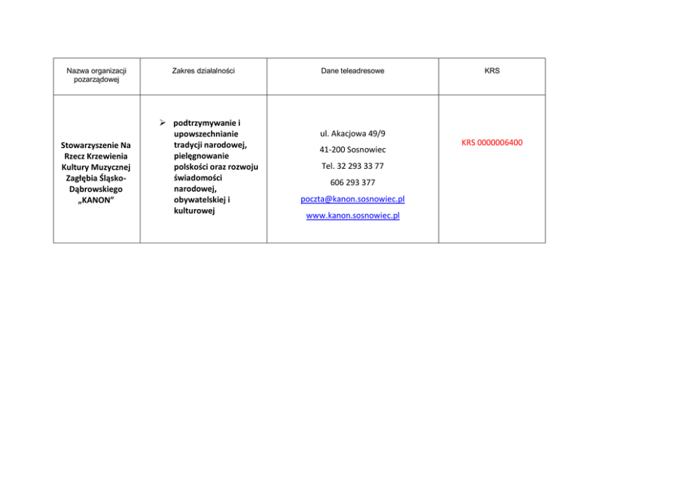 Nazwa organizacji pozarządowej Stowarzyszenie Na Rzecz Krzewienia Kultury Muzycznej Zagłębia ŚląskoDąbrowskiego „KANON” Zakres działalności  podtrzymywanie i upowszechnianie tradycji narodowej, pielęgnowanie polskości oraz rozwoju świadomości narodowej, obywatelskiej i kulturowej Dane teleadresowe ul. Akacjowa 49/9 41-200 Sosnowiec Tel. 32 293 33 77 606 293 377 [email protected] www.kanon.sosnowiec.pl KRS KRS 0000006400