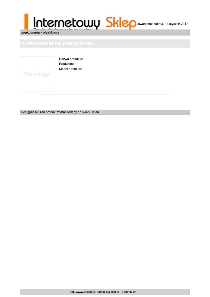 Utworzono: sobota, 14 styczeń 2017 opakowania - plastikowe opakowanie na pierścionek Nazwa produktu: Producent: Model produktu: - No image Dostępność: Ten produkt został dodany do sklepu w dniu http://www.arexpol.pl | [email protected] | | Strona 1/1