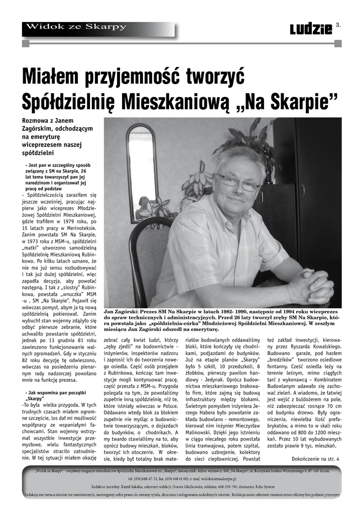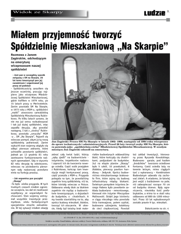 ludzie Widok ze Skarpy Miałem przyjemność tworzyć Spółdzielnię Mieszkaniową „Na Skarpie” Rozmowa z Janem Zagórskim, odchodzącym na emeryturę wiceprezesem naszej spółdzielni - Jest pan w szczególny sposób związany z SM na Skarpie, 26 lat temu towarzyszył pan jej narodzinom i organizował jej pracę od podstaw - Spółdzielczością zaraziłem się jeszcze wcześniej, pracując najpierw jako wiceprezes Młodzieżowej Spółdzielni Mieszkaniowej, gdzie trafiłem w 1979 roku, po 15 latach pracy w Merinoteksie. Zanim powstała SM Na Skarpie, w 1973 roku z MSM-u, spółdzielni „matki” utworzono samodzielną Spółdzielnię Mieszkaniową Rubinkowo. Po kilku latach uznano, że nie ma już sensu rozbudowywać i tak już dużej spółdzielni, więc zapadła decyzja, aby powołać następną. I tak z „siostry” Rubinkowa, powstała „wnuczka” MSM -u , SM „Na Skarpie”. Pojawił się wówczas pomysł, abym ja tą nową spółdzielnią pokierował. Zanim wybuchł stan wojenny zdążyło się odbyć pierwsze zebranie, które uchwaliło powstanie spółdzielni, jednak po 13 grudnia 81 roku zawieszono funkcjonowanie walnych zgromadzeń. Gdy w styczniu 82 roku decyzję tę odwieszono, wówczas na posiedzeniu plenarnym rady nadzorczej powołano mnie na funkcję prezesa. - Jak wspomina pan początki „Skarpy” -To była wielka przygoda. W tych trudnych czasach miałem ogromne szczęście, los dał mi możliwość współpracy ze wspaniałymi fachowcami. Stan wojenny wstrzymał wszystkie inwestycje przemysłowe, wielu fantastycznych specjalistów straciło zatrudnienie. W tej sytuacji miałem okazję Jan Zagórski: Prezes SM Na Skarpie w latach 1982- 1990, następnie od 1994 roku wiceprezes do spraw technicznych i administracyjnych. Przed 26 laty tworzył zręby SM Na Skarpie, która powstała jako „spółdzielnia-córka” Młodzieżowej Spółdzielni Mieszkaniowej. W zeszłym miesiącu Jan Zagórski odszedł na emeryturę. zebrać cały kwiat ludzi, którzy „zęby zjedli” na budownictwie inżynierów, inspektorów nadzoru i zaprosić ich do tworzenia nowego osiedla. Część osób przejąłem z Rubinkowa, kończąc tam inwestycje mogli kontynuować pracę, część przeszła z MSM-u. Przygoda polegała na tym, że powołaliśmy zupełnie inną spółdzielnię, niż te, które istniały wówczas w Polsce. Oddawano wtedy blok za blokiem zupełnie nie myśląc o budownictwie towarzyszącym, o dojazdach do budynków, o chodnikach. A my twardo stawialiśmy na to, aby oprócz budowy mieszkań, bloków, tworzyć ich otoczenie. W okresie, kiedy był totalny brak mate- riałów budowlanych oddawaliśmy bloki, które kończyły się chodnikami, podjazdami do budynków. Już na etapie planów „Skarpy” było 5 szkół, 10 przedszkoli, 8 żłobków, pierwszy pawilon handlowy - Jedynak. Oprócz budownictwa mieszkaniowego brakowało firm, które zajmą się budową infrastruktury między blokami. Świetnym pomysłem inżyniera Jerzego Habera było powołanie zakładu budowlano - remontowego, kierował nim inżynier Mieczysław Malinowski. Dzięki jego istnieniu w ciągu niecałego roku powstała linia tramwajowa, potem szpital, budowano uzbrojenie, kolektory do sieci ciepłowniczej. Powstał też zakład inwestycji, kierowany przez Ryszarda Kowalskiego. Budowano garaże, pod hasłem „brodzików” tworzono osiedlowe fontanny. Cześć osiedla leży na terenie leśnym, mimo ciągłych tarć z wykonawcą – Kombinatem Budowlanym udawało się zachować zieleń. A wiadomo, że łatwiej jest wejść z buldożerem na pole, niż zabezpieczać rosnące 70 cm od budynku drzewo. Były ograniczenia, niewielka ilość prefabrykatów, a mimo to w skali roku oddawano od 800 do 1200 mieszkań. Przez 10 lat wybudowanych zostało prawie 9 tys. mieszkań. Dokończenie na str. 4