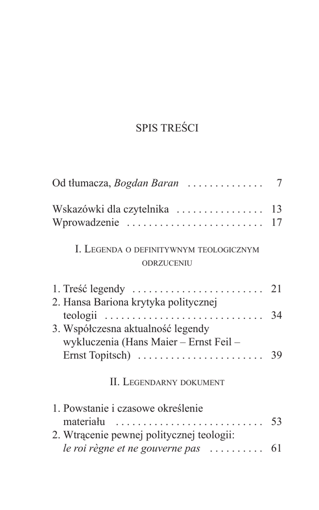 Spis treści Od tłumacza, Bogdan Baran . . . . . . . . . . . . . . . 7 Wskazówki dla czytelnika . . . . . . . . . . . . . . . . 13 Wprowadzenie . . . . . . . . . . . . . . . . . . . . . . . . . 17 I. Legenda o definitywnym teologicznym odrzuceniu 1. Treść legendy . . . . . . . . . . . . . . . . . . . . . . . . 21 2. Hansa Bariona krytyka politycznej teologii . . . . . . . . . . . . . . . . . . . . . . . . . . . . . 34 3. Współczesna aktualność legendy wykluczenia (Hans Maier – Ernst Feil – Ernst Topitsch) . . . . . . . . . . . . . . . . . . . . . . . 39 II. Legendarny dokument 1. Powstanie i czasowe określenie materiału . . . . . . . . . . . . . . . . . . . . . . . . . . . . 53 2. Wtrącenie pewnej politycznej teologii: le roi règne et ne gouverne pas . . . . . . . . . . . 61 Spis treści 3. Ograniczenie materiału i problematyki po stronie politycznej: monarchia . . . . . . . . 67 4. Ograniczenie materiału i problematyki po stronie teologicznej: monoteizm . . . . . . 74 5. Euzebiusz jako prototyp politycznej teologii . . . . . . . . . . . . . . . . . . . . . . . . . . . . 79 6. Konfrontacja Euzebiusz–Augustyn . . . . . . 102 III. Legendarna teza końcowa 1. Sformułowania z tezy końcowej . . . . . . . . . 109 2. Zakres tezy końcowej . . . . . . . . . . . . . . . . . 111 Posłowie. O dzisiejszej sytuacji problemu: Prawomocność nowożytności . . . . 125 Wskazówki dla czytelnika Tytuł Teologia polityczna 2 nawiązuje do mojego tekstu Politische Theologie, który w 1922 (wydanie drugie: 1934) roku ukazał się w niniejszym wydawnictwie. Teraz rozważam krótką rozprawkę teologiczną z 1935 roku, która z czasem stała się naukową legendą. Legenda ta głosi, że powyższa rozprawka rozprawiła się definitywnie z wszelką polityczną teologią. Podobnie brzmi też końcowa teza tego tekstu. Nie należy burzyć tak pięknej legendy – zresztą zburzyć jej i tak nie sposób. Dlatego moje rozważania dotyczą wewnętrznej relacji, jaka zachodzi między argumentacją a końcową tezą rozprawki. Teologiczne dzieło jej autora, profesora Erika Petersona, zwłaszcza rozwój jego teologii w okresie 1922–1960, nie jest już tematem tej konkretnej mojej analizy. Przedkładając wąską analizę tej rozprawy z 1935 roku tak wybitnemu teologowi, znawcy historii Kościoła, kanoniście oraz historykowi prawa jak Hans Zob. Teologia polityczna, dz. cyt. Teologia polityczna 2 14 Barion 16 grudnia 1969 roku – w dniu Jego uro- dzin – muszę uprzedzić pewne możliwe nieporozumienia. Dzieło naukowe Bariona jest zbyt doniosłe i rozległe, by mogło zostać należycie uhonorowane tym dedykowaniem Mu niewielkiej pracy. Barion to prawnik rangi Rudolfa Sohma, jednego z wy bitnych, uniwersalnych badaczy i nauczycieli nauk prawnych. Dlatego zadaję sobie pytanie, czy moje opusculum nie wywoła wrażenia nieadekwatnego gestu i czy w konsekwencji nie byłoby lepiej nie zamieszczać tej osobistej dedykacji. Mam wiele merytorycznych i osobistych powo dów do przekazania mu wyrazów szacunku i wdzięczności nie tylko za jego publikacje naukowe, które stały się dla mnie wzorem i inspiracją, lecz także za jego szczególne zainteresowanie moimi badaniami w dziedzinie nauk prawnych. Poddał on je krytycznej ocenie w obszernych artykułach z lat 1959, 1965 i 1968. Ostatni z nich znajduje się w jego piątym studium o II soborze watykańskim, które ukazało się w księdze pamiątkowej Epirrhosis z okazji moich 80 urodzin w 1968 roku. Dotyczy problemu politycz Hans Barion, Ordung und Ortung im kanonischen Recht, w: H. Barion, E. Forsthoff i W. Weber (red.), Festschrift für Carl Schmitt, Berlin 1959, s. 1–34; tenże, Kirche oder Partei? Römischer Katholizismus und politische Form, „Der Staat”, 4 (1965), s. 131–176; tenże, Weltgeschichtliche Machtform? Eine Studie zur Politischen Theologie des II. Vatikanischen Konzils, w: Festschrift Epirrhosis, Berlin 1968, s. 13–59. Hans Barion, Das Zweite Vatikanische Konzil. Kanonis tischer Bericht I („Der Staat”, 3 [1964], s. 221–226); Bericht II Wskazówki dla czytelnika 15 nej teologii. Barion pisze tam o rozprawie Petersona, uważa polemikę z nią za niezbędną i nazywa ją „atakiem politycznym”. To sformułowanie dało mi do myślenia i zainspirowało mnie do podjęcia starego wyzwania i do wyjęcia z rany partyjskiej strzały. Tak powstała moja szczegółowa analiza. Stano- wi ona tylko wstęp do innej i nie więcej niż raport z pewnej katarktycznej operacji, jaki tu składam, niż świadectwo długiej, bogatej w teoretyczne, praktyczne i osobiste doświadczenia, czterdziestoletniej wspólnej drogi, jaka połączyła prawnika i kanonistę w duchu ich jus utrumque. Kontynuacja od strony treści i tematu mojej pracy Teologia polityczna z 1922 roku postępuje w kierunku, który wychodzi od XVI‑wiecznego jus reformandi, osiąga szczyt u Hegla i dziś jest rozpoznawalny wszędzie: od politycznej teologii do politycznej chrystologii. grudzień 1969 Carl Schmitt („Der Staat”, 4 [1965], s. 341–359); Bericht III („Der Staat”, 5 [1966], s. 341–352). Bericht IV traktuje o nauce społecznej soboru i jest opublikowany w księdze pamiątkowej Säkula risation und Utopie, Ebracher Studien, Ernst Forsthoff zum 65. Geburtstag, Stuttgart 1967, s. 187–233, pod tytułem Das konziliare Utopia. Eine Studie zur Soziallehre des I. Vatikani schen Konzils; Bericht V dotyczy nauki soboru o państwie i jest opublikowany w księdze pamiątkowej z okazji 80 rocznicy urodzin Carla Schmitta Epirrhosis, dz. cyt., s. 13–59, pod tytułem Weltgeschichtliche Machtform? Eine Studie zur Politi schen Theologie des II. Vatikanischen Konzils. Wprowadzenie Dla ateistów, anarchistów oraz pozytywistycznych scjentystów wszelka polityczna teologia – jak też wszelka polityczna metafizyka – są w sensie nau kowym od dawna martwe, gdyż także teologia i metafizyka są dla nich martwe jako nauka. Używają tego terminu już tylko polem