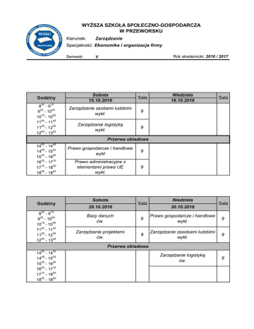 WYŻSZA SZKOŁA SPOŁECZNO-GOSPODARCZA W PRZEWORSKU Kierunek: Zarządzanie Specjalność: Ekonomika i organizacja firmy Semestr: Godziny 830 - 915 920 - 1005 1010 - 1055 1100 - 1145 1150 - 1235 1240 - 1325 Rok akademicki: 2016 / 2017 V Sobota 15.10.2016 Sala Zarządzanie zaobami ludzkimi wykł. 9 Zarządzanie logistyką wykł. 9 Niedziela 16.10.2016 Sala Przerwa obiadowa 00 45 14 - 14 1445 - 1530 1535 - 1620 1625 - 1710 1715 - 1800 1805 - 1850 Godziny 830 - 915 920 - 1005 1010 - 1055 1100 - 1145 1150 - 1235 1240 - 1325 Prawo gospodarcze i handlowe wykł 9 Prawo administracyjne z elementami prawa UE wykł. 9 Sobota 29.10.2016 Sala Niedziela 30.10.2016 Sala Bazy danych ćw. 9 Prawo gospodarcze i handlowe wykł. 9 Zarządzanie projektami ćw. 9 Zarządzanie zasobami ludzkimi wykł. 9 Zarządzanie logistyką ćw. 9 Przerwa obiadowa 00 45 14 - 14 1445 - 1530 1535 - 1620 1625 - 1710 1715 - 1800 1805 - 1850 Godziny 830 - 915 920 - 1005 1010 - 1055 1100 - 1145 1150 - 1235 1240 - 1325 Sobota 05.11.2016 Sala Seminarium dyplomowe 9 Bazy danych ćw. 9 Niedziela 06.11.2016 Sala Niedziela 20.11.2016 Sala Seminarium dyplomowe 9 Zarządzanie projektami wykł. 9 Projektowanie stron internetowych 8 Niedziela 27.11.2016 Sala Prawo gospodarcze i handlowe wykł. 9 Zarządzanie zasobami ludzkimi ćw. 9 Prawo administracyjne z elementami prawa UE wykł. 9 Przerwa obiadowa 00 45 14 - 14 1445 - 1530 1535 - 1620 1625 - 1710 1715 - 1800 1805 - 1850 Prawo administracyjne z elemantami prawa UE wykł. 9 Godziny Sobota 19.11.2016 Sala Zarządzanie logistyką wykł. 9 Zarządzanie projektami wykł. 9 830 - 915 920 - 1005 1010 - 1055 1100 - 1145 1150 - 1235 1240 - 1325 Przerwa obiadowa 00 45 14 - 14 1445 - 1530 1535 - 1620 1625 - 1710 1715 - 1800 1805 - 1850 Godziny 830 - 915 920 - 1005 1010 - 1055 1100 - 1145 1150 - 1235 1240 - 1325 Zarządzanie logistyką ćw. 9 Projektowanie stron internetowych 8 Sobota 26.11.2016 Sala Zarządzanie zasobami ludzkimi wykł. 9 Zarządzanie projektami ćw. 9 Przerwa obiadowa 1400 - 1445 1445 - 1530 1535 - 1620 1625 - 1710 1715 - 1800 1805 - 1850 Marketing w handlu i usługach wykł. 9 Godziny 830 - 915 920 - 1005 1010 - 1055 1100 - 1145 1150 - 1235 1240 - 1325 Sobota 03.12.2016 Sala Zarzadzanie logistyką ćw. 9 Zarządzanie projektami ćw. Niedziela 04.12.2016 Sala Marketing w handlu i usługach wykł. 9 Marketing w handlu i usługach ćw. 9 Niedziela 18.12.2016 Sala Marketing w handlu i usługach ćw. 9 9 Przerwa obiadowa 00 45 14 - 14 1445 - 1530 1535 - 1620 1625 - 1710 1715 - 1800 1805 - 1850 Godziny 830 - 915 920 - 1005 1010 - 1055 1100 - 1145 1150 - 1235 1240 - 1325 Bazy danych ćw. 8 Projektowanie stron internetowych 8 Sobota 17.12.2016 Sala Zarządzanie projektami wykł. 9 Zarzadzanie logistyką ćw. 9 Przerwa obiadowa 00 45 14 - 14 1445 - 1530 1535 - 1620 1625 - 1710 1715 - 1800 1805 - 1850 Marketing w handlu i usługach wykł. 9 Prawo gospodarcze i handlowe wykł. 9 Marketing w handlu i usługach ćw. 9 Projektowanie stron internetowych ćw. 8