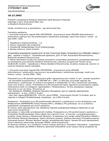 18.12.2002 Protokół z posiedzenia Kolegium Rektorów Szkół Wyższych Krakowa odbytego w dniu 18 grudnia 2002 roku w Akademii Ekonomicznej Osoby uczestnicz±ce w posiedzeniu - wg zał±czonej listy. Tematyka spotkania: I. Uroczyste wręczenie nagród PHIL EPISTÉMONI - przyznanych przez KRSzWK dziennikarzom i publicystom zajmuj±cym się problematyk± szkolnictwa wyższego, nauki oraz kultury i sztuki - za lata 2000 i 2001. II. 1. Współpraca międzynarodowa - c.d. 2. Pomoc materialna dla studentów. 3. Działalno¶ć Małopolskiego Forum Edukacyjnego. 4. Sprawy bież±ce, wolne wnioski. Uczestników posiedzenia powitał prof. dr hab. Franciszek Ziejka, Przewodnicz±cy KRSzWK, oddaj±c głos - zgodnie z tradycj± - Gospodarzowi spotkania, prof. dr hab. Ryszardowi Borowieckiemu, Rektorowi Akademii Ekonomicznej. P. Rektor Borowiecki serdecznie powitał wszystkich uczestników posiedzenia, przedstawił obecnych na posiedzeniu pracowników Akademii Ekonomicznej i pokrótce przypomniał 78-letni okres działalno¶ci Uczelni - największej w Polsce Akademii Ekonomicznej. Uczelnia rozwija się, tworz±c w centrum Krakowa zwarty kompleks. I. Uroczyste wręczenie nagród PHIL EPISTÉMONI - przyznanych przez KRSzWK dziennikarzom i publicystom zajmuj±cym się problematyk± szkolnictwa wyższego, nauki oraz kultury i sztuki - za lata 2000 - 2001. Przewodnicz±cy KR powitał zaproszonych go¶ci reprezentuj±cych media, w tym - przede wszystkim - do Laureatów przypominaj±c, że KRSzWK od r. 1987, co dwa lata, przyznaje nagrody dla dziennikarzy i publicystów- za wybitne osi±gnięcia w działalno¶ci na rzecz szkolnictwa wyższego, nauki oraz kultury i sztuki. Przewodnicz±cy KR przypomniał także regulamin przyznawania nagród. Ustanowiono dwie ich kategorie: ogólnopolsk± i ¶rodowiskow±. W dniu dzisiejszym nagrody wręczane s± po raz ósmy. Otrzymuj± je: - Pan Waldemar SIWIŃSKI, Redaktor Naczelny Perspektyw. Jest to nagroda ogólnopolska indywidualna - w wys. 5.000 zł. brutto. - Red. Red. Agata JĘDRZEJCZYK - DYL±G i Alicja POPIEL - Dziennikarki Kroniki TV Kraków. Jest to nagroda w kategorii ¶rodowiskowej, zespołowa - po 2.500 zł brutto. Dodatkowo - Przewodnicz±cy KR poinformował zebranych o powierzeniu w dniu dzisiejszym red. Waldemarowi SIWIŃSKIEMU funkcji Prezesa PAP-u, składaj±c Mu gratulacje, na co uczestnicy posiedzenia zareagowali gor±cymi oklaskami. W imieniu osób nagrodzonych red. Waldemar Siwiński podziękował Kolegium Rektorów za tak zaszczytne wyróżnienie. Korzystaj±c z obecno¶ci przedstawicieli mediów, Przewodnicz±cy KR poinformował o spotkaniu u Prezydenta Kwa¶niewskiego, które odbyło się w dniu10.12.br., w zwi±zku z przygotowywaniem projektu nowej Ustawy o Szkolnictwie Wyższym. W spotkaniu tym wzięło udział Prezydium KRASP-u, Pani Minister Edukacji Narodowej i Sportu Krystyna Łybacka, Szefowa Kancelarii Prezydenta Jolanta Szymanek-Deresz i Minister Barbara Labuda, przedstawiciele Sejmu i Senatu RP oraz reprezentanci innych sektorów szkolnictwa wyższego (PWSZ i szkół prywatnych). Po dyskusji ustalono, że z inicjatyw± zmiany Ustawy wyst±pi p. Prezydent. Poprzednio - nowelizacj± Ustawy zajmowało się MENiS a Rektorzy opiniowali kilkana¶cie coraz nowych wersji projektów tej [1] Ustawy. Powołano 7-osobow± Komisję (3 reprezentantów KRASP-u, 3 przedstawicieli MENiS i przewodnicz±cy - wyłoniony przez p. Prezydenta) ds. przygotowania projektu nowej Ustawy. Tekst projektu ma zostać ogłoszony w ci±gu I - go kwartału 2003 roku. Po konsultacji ze ¶rodowiskiem akademickim, w maju lub czerwcu 2003 r. ma on być skierowany do Sejmu. Inna ważna sprawa dotyczy niedawnej wizyty w Niemczech (Kolonia) 86-ciu Rektorów i Prorektorów uczelni polskich, którzy spotkali się ze 120-osobow± grup± naukowców niemieckich. Zadaniem tej 2-dniowej konferencji było przygotowanie propozycji zacie¶nienia współpracy pomiędzy uczelniami polskimi i niemieckimi. Prezydium KRASP zdecydowało, iż przygotuje informator na rok 2003/2004 - o możliwo¶ciach i warunkach finansowych studiowania w językach obcych na polskich uczelniach, czym zainteresowani s± m.in. Niemcy. Stosowne ankiety - do wypełnienia - zostan± rozesłane przez KRASP wszystkim jego członkom. Przewodnicz±cy KR zaznaczył również, że Senaty szeregu uczelni podjęły uchwały popieraj±ce ideę integracji Polski ze strukturami Unii Europejskiej, w zwi±zku z zakoń-czeniem negocjacji w Kopenhadze. Następnie Przewodnicz±cy KR poinformował, że dodatkowo w trakcie dzisiejszego posiedzenia omówione zostan± 2 sprawy dot. dofinansowania: ACK Cyfronet AGH i Kra-kowskiego Zespołu Bibliotecznego. ad 2. Współpraca międzynarodowa - c.d. Na podstawie materiałów uzyskanych z uczelni - opracowanie zbiorcze wykonał i temat zreferował dr hab. Czesław Nowak, Prorektor Akademii Rolniczej ds. nauki i współpracy międzynarodowej (komplet materiałów - w zał±czeniu). P. Prorektor Czesław Nowak m.in. zaznaczył, że dostarczone materiały w czę¶ci dot. współpracy międzynarodowej i programów studenckich zostały skonsultowane z Samorz±dem Studenckim (choć nie udało się dotrzeć do wszystkich studentów uczelni). Oto główne tezy wyst±pienia Rektora Nowaka: - Nie można sprowadzać cało¶ci zagadnień współpracy międzynarodowej do kręgu: Polska - Unia Europejska. - Zasadniczym problemem przy realizowaniu programu współpracy z krajami Unii Europejskiej jest ¶wiadomo¶ć, że ¶wiat pozostaje bardziej skomplikowany (podział w zakresie technologii). - W uczelniach europejskich obowi±zuj± inne priorytety naukowe, niż w Polsce (chodzi o nauki stosowane). - W Polsce przywi±zuje się wagę, przede wszystkim do edukacji i nauki, w innych krajach dochodz± szkolenia, warsztaty, obowi±zkowa działalno¶ć uczonych na rzecz lokalnego ¶rodowiska. - Uczelnie zagraniczne musz± posiadać znakomite relacje z własnym ¶rodowiskiem, gdyż przekłada się to na pieni