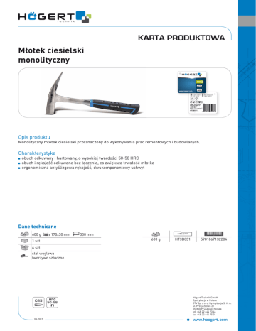 KARTA PRODUKTOWA Młotek ciesielski monolityczny Opis produktu Monolityczny młotek ciesielski przeznaczony do wykonywania prac remontowych i budowlanych. Charakterystyka obuch odkuwany i hartowany, o wysokiej twardości 50-58 HRC obuch i rękojeść odkuwane bez łączenia, co zwiększa trwałość młotka ergonomiczna antyślizgowa rękojeść, dwukomponentowy uchwyt Dane techniczne 600 g 170x30 mm 1 szt. 330 mm 600 g HT3B031 5901867132284 6 szt. stal węglowa tworzywo sztuczne Högert Technik GmbH Dystrybucja w Polsce GTV Sp. z o. o. Dystrybucja S. K. A. ul. Przejazdowa 21 05-800 Pruszków, Polska tel. +48 22 444 73 44 fax +48 22 444 75 01 06.2015 www.hoegert.com