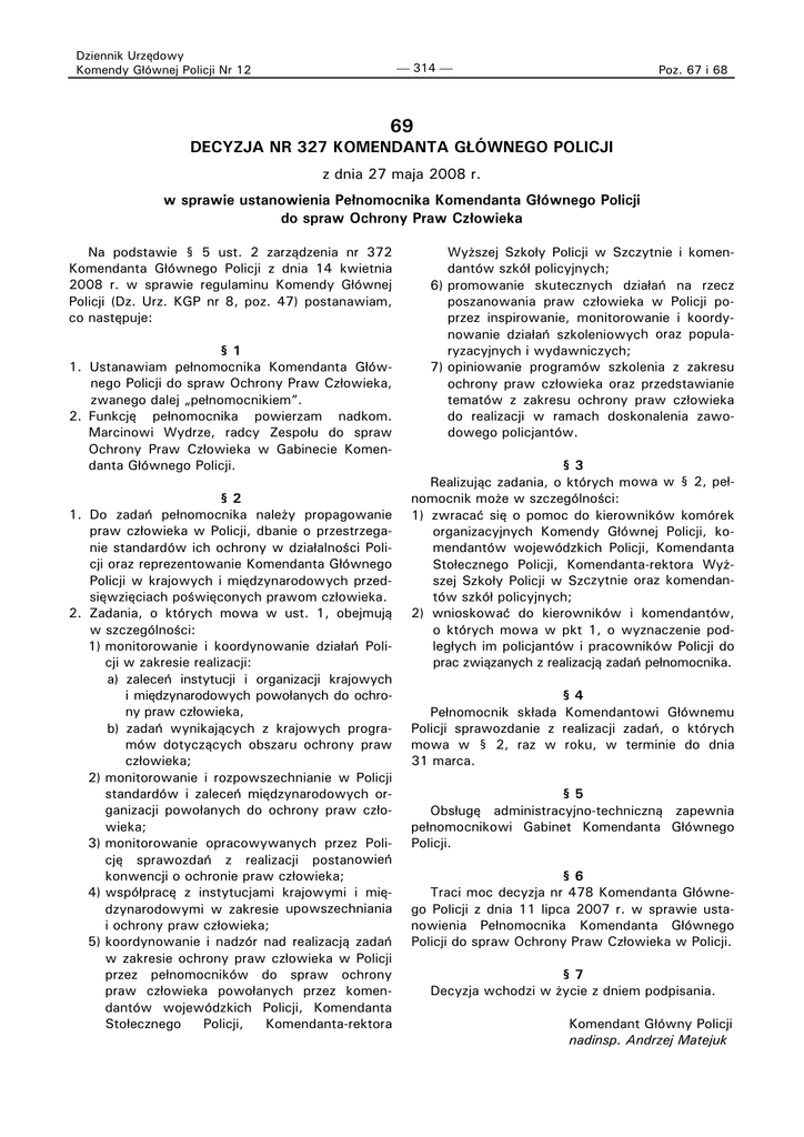 Dziennik Urzędowy Komendy Głównej Policji Nr 12 ⎯ 314 ⎯ Poz. 67 i 68 69 DECYZJA NR 327 KOMENDANTA GŁÓWNEGO POLICJI z dnia 27 maja 2008 r. w sprawie ustanowienia Pełnomocnika Komendanta Głównego Policji do spraw Ochrony Praw Człowieka Na podstawie § 5 ust. 2 zarządzenia nr 372 Komendanta Głównego Policji z dnia 14 kwietnia 2008 r. w sprawie regulaminu Komendy Głównej Policji (Dz. Urz. KGP nr 8, poz. 47) postanawiam, co następuje: §1 1. Ustanawiam pełnomocnika Komendanta Głównego Policji do spraw Ochrony Praw Człowieka, zwanego dalej „pełnomocnikiem”. 2. Funkcję pełnomocnika powierzam nadkom. Marcinowi Wydrze, radcy Zespołu do spraw Ochrony Praw Człowieka w Gabinecie Komendanta Głównego Policji. §2 1. Do zadań pełnomocnika należy propagowanie praw człowieka w Policji, dbanie o przestrzeganie standardów ich ochrony w działalności Policji oraz reprezentowanie Komendanta Głównego Policji w krajowych i międzynarodowych przedsięwzięciach poświęconych prawom człowieka. 2. Zadania, o których mowa w ust. 1, obejmują w szczególności: 1) monitorowanie i koordynowanie działań Policji w zakresie realizacji: a) zaleceń instytucji i organizacji krajowych i międzynarodowych powołanych do ochrony praw człowieka, b) zadań wynikających z krajowych programów dotyczących obszaru ochrony praw człowieka; 2) monitorowanie i rozpowszechnianie w Policji standardów i zaleceń międzynarodowych organizacji powołanych do ochrony praw człowieka; 3) monitorowanie opracowywanych przez Policję sprawozdań z realizacji postanowień konwencji o ochronie praw człowieka; 4) współpracę z instytucjami krajowymi i międzynarodowymi w zakresie upowszechniania i ochrony praw człowieka; 5) koordynowanie i nadzór nad realizacją zadań w zakresie ochrony praw człowieka w Policji przez pełnomocników do spraw ochrony praw człowieka powołanych przez komendantów wojewódzkich Policji, Komendanta Stołecznego Policji, Komendanta-rektora Wyższej Szkoły Policji w Szczytnie i komendantów szkół policyjnych; 6) promowanie skutecznych działań na rzecz poszanowania praw człowieka w Policji poprzez inspirowanie, monitorowanie i koordynowanie działań szkoleniowych oraz popularyzacyjnych i wydawniczych; 7) opiniowanie programów szkolenia z zakresu ochrony praw człowieka oraz przedstawianie tematów z zakresu ochrony praw człowieka do realizacji w ramach doskonalenia zawodowego policjantów. §3 Realizując zadania, o których mowa w § 2, pełnomocnik może w szczególności: 1) zwracać się o pomoc do kierowników komórek organizacyjnych Komendy Głównej Policji, komendantów wojewódzkich Policji, Komendanta Stołecznego Policji, Komendanta-rektora Wyższej Szkoły Policji w Szczytnie oraz komendantów szkół policyjnych; 2) wnioskować do kierowników i komendantów, o których mowa w pkt 1, o wyznaczenie podległych im policjantów i pracowników Policji do prac związanych z realizacją zadań pełnomocnika. §4 Pełnomocnik składa Komendantowi Głównemu Policji sprawozdanie z realizacji zadań, o których mowa w § 2, raz w roku, w terminie do dnia 31 marca. §5 Obsługę administracyjno-techniczną zapewnia pełnomocnikowi Gabinet Komendanta Głównego Policji. §6 Traci moc decyzja nr 478 Komendanta Głównego Policji z dnia 11 lipca 2007 r. w sprawie ustanowienia Pełnomocnika Komendanta Głównego Policji do spraw Ochrony Praw Człowieka w Policji. §7 Decyzja wchodzi w życie z dniem podpisania. Komendant Główny Policji nadinsp. Andrzej Matejuk