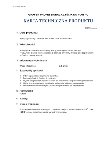 F 3.02–2 Rev04 13.10.2011 GRAFEN PROFESSIONAL CZYŚCIK DO PIAN PU KARTA TECHNICZNA PRODUKTU Version: 07 Rev. Date: 07.11.2011 1. Opis produktu: Sprej czyszczący GRAFEN PROFESIONAL zawiera MEK. 2. Właściwości + Najlepsze działanie uzyskujemy, kiedy pianka jeszcze nie zastygła. + Usuwając piankę, która jeszcze nie zastygła chronimy dysze przed zapchaniem. + Czyści zawory puszek. 3. Informacja techniczna Waga właściwa : 4. 0,8 g/cm3 Szczegóły aplikacji 1. 2. 3. 4. 5. Odkręć pistolet od pojemnika z pianką. Zamocuj Czyścik Grafen do pistoletu. Wydmuchaj resztę Czyścika Grafen do pojemnika z odpowiedniego materiału. Kiedy płyn wypływający z pistoletu jest czysty, zakończ czyszczenie Pistolet umieść w chłodnym i przewiewnym miejscu po czyszczeniu 5. Pakowanie Puszka 6. Kolory: - 7. Okres ważności Produkt przechowywać w suchym i chłodnym miejscu. W temperaturze +5C º do +25C º, okres przechowywania wynosi 12 miesięcy. F 3.02–2 Rev04 13.10.2011 GRAFEN PROFESSIONAL CZYŚCIK DO PIAN PU KARTA TECHNICZNA PRODUKTU Version: 07 Rev. Date: 07.11.2011 8. Uwaga Czyścik Grafen jest pod ciśnieniem. Przechowywać z dala od bezpośredniego światła słonecznego. W temperaturze do 50 º C. Przechowywać w miejscu chłodnym, suchym i przewiewnym. Nie rozpylać do ognia ani na rozżarzone przedmioty. Przechowywać z dala od wszelkiego rodzaju źródeł ognia. Należy trzymać z dala od dzieci. 07.11.2011